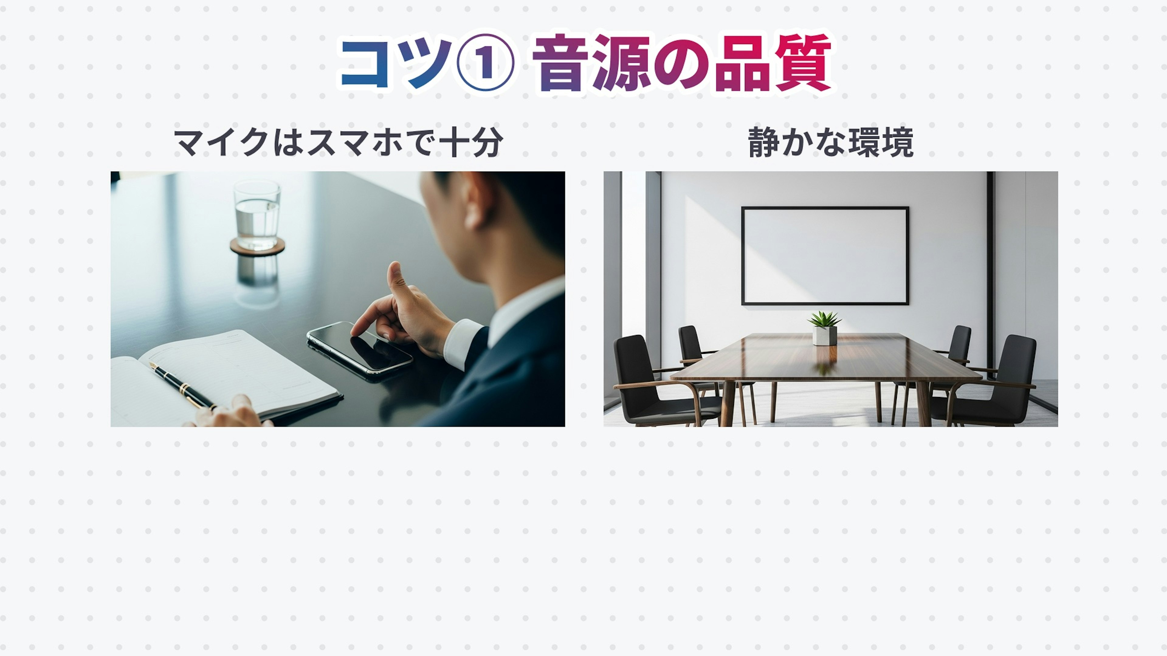 では議事録の精度を上げるコツを2つお伝えしておきます。1つは音源の品質を上げる、つまりマイク性能や録音環境に気を遣うこと。