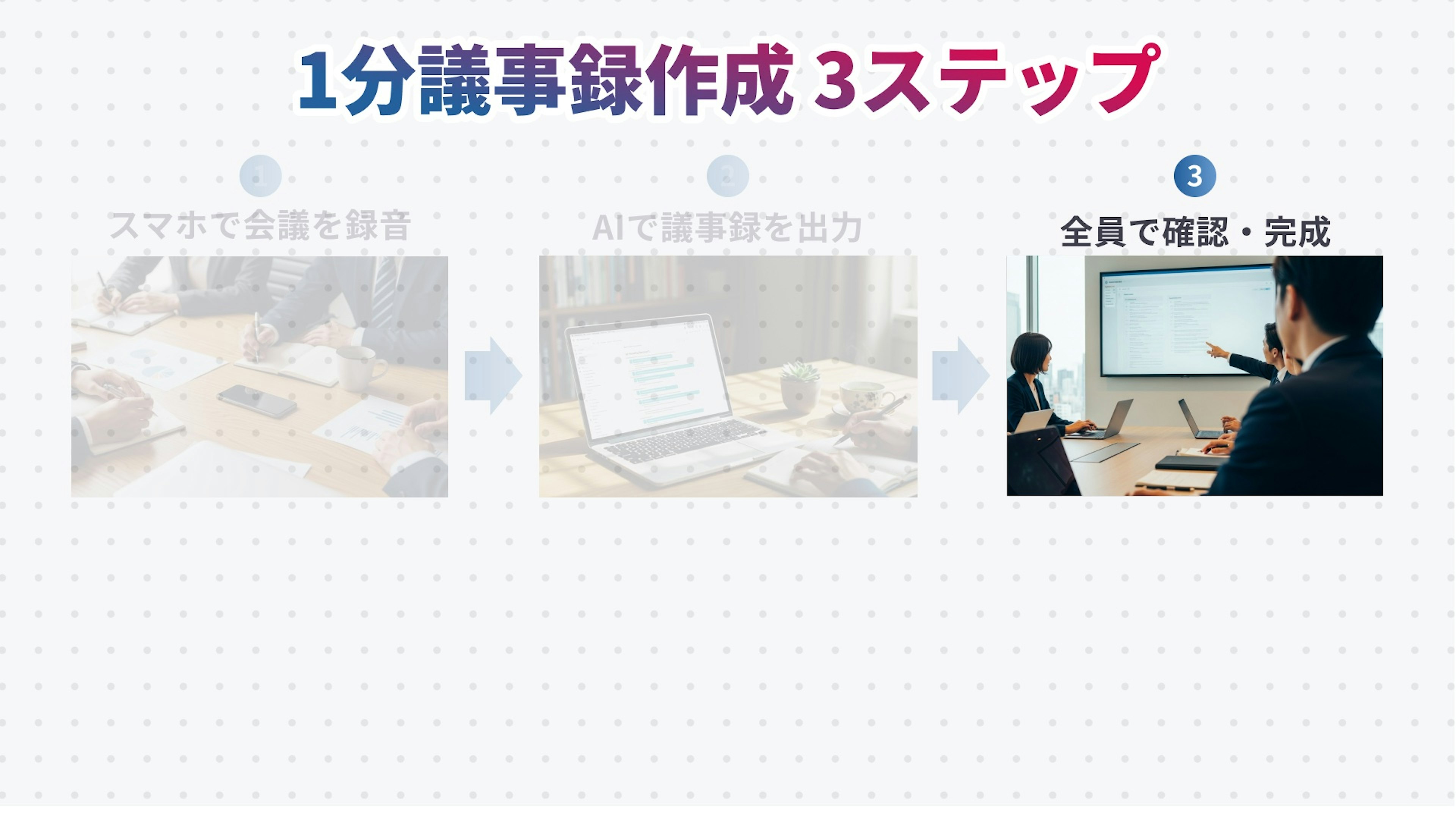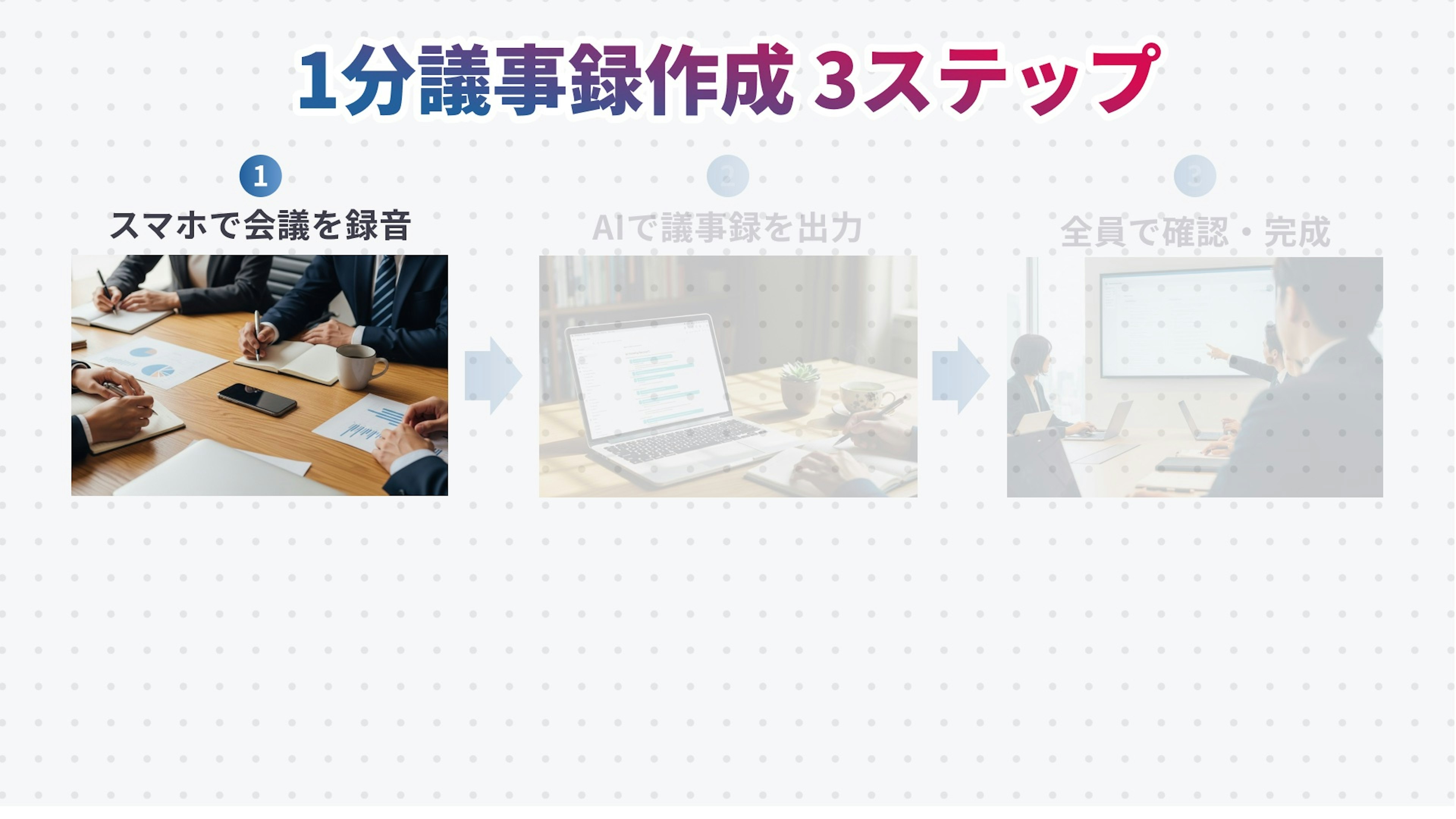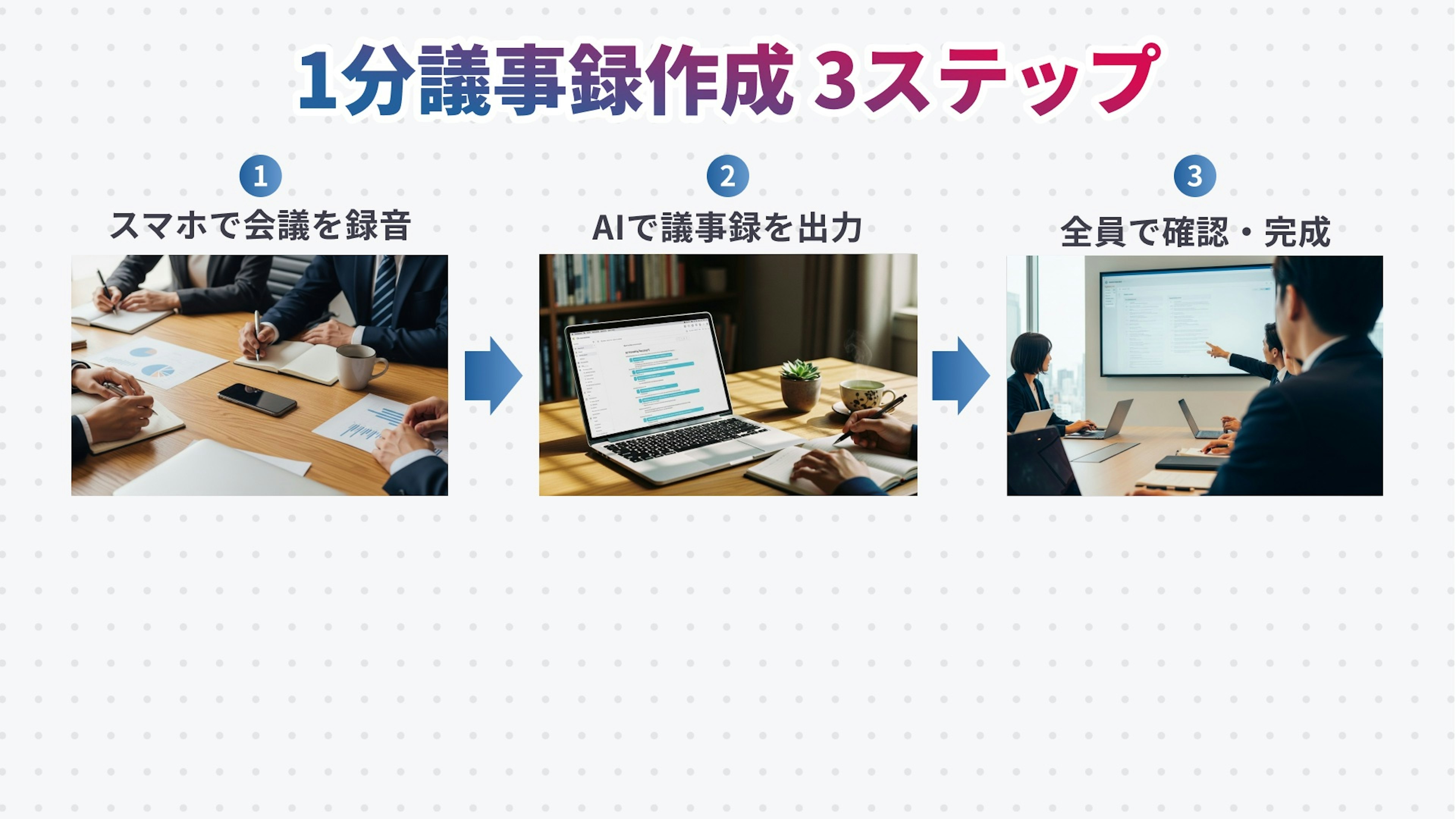 ステップは3つです。ステップ1、スマホで会議を録音する。ステップ2、Google AI Studioで議事録を出力する。ステップ3、全員で議事録を確認・完成させる。