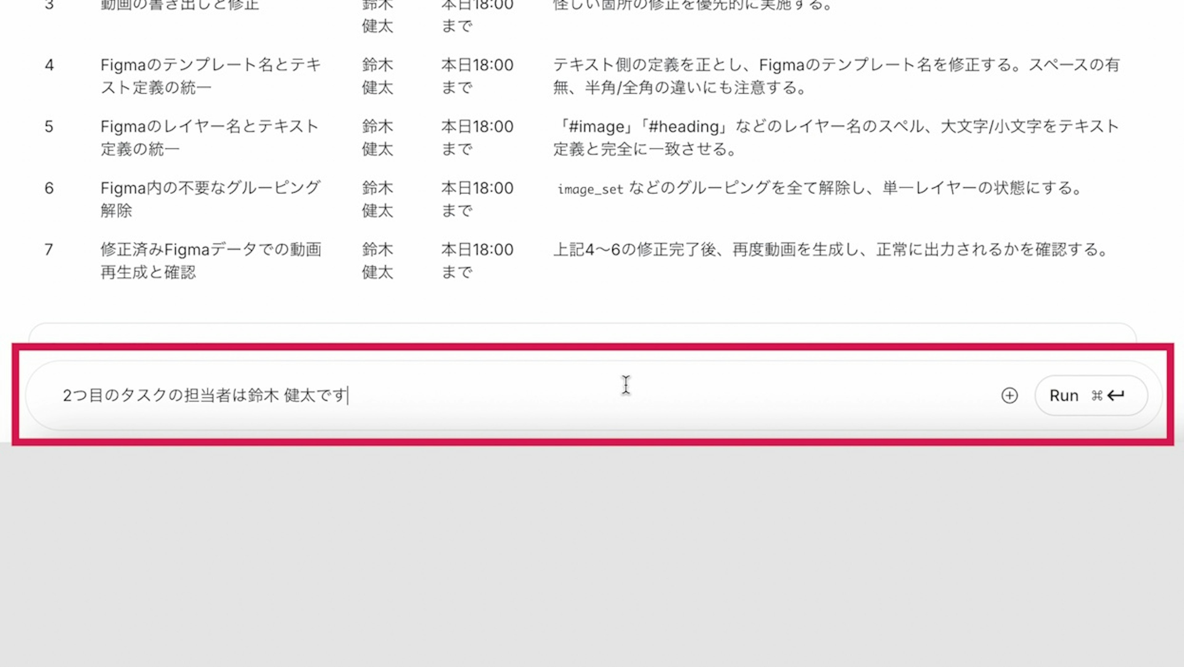 先ほどの指示を入れると、このように2つ目のタスクの担当者が修正されました。