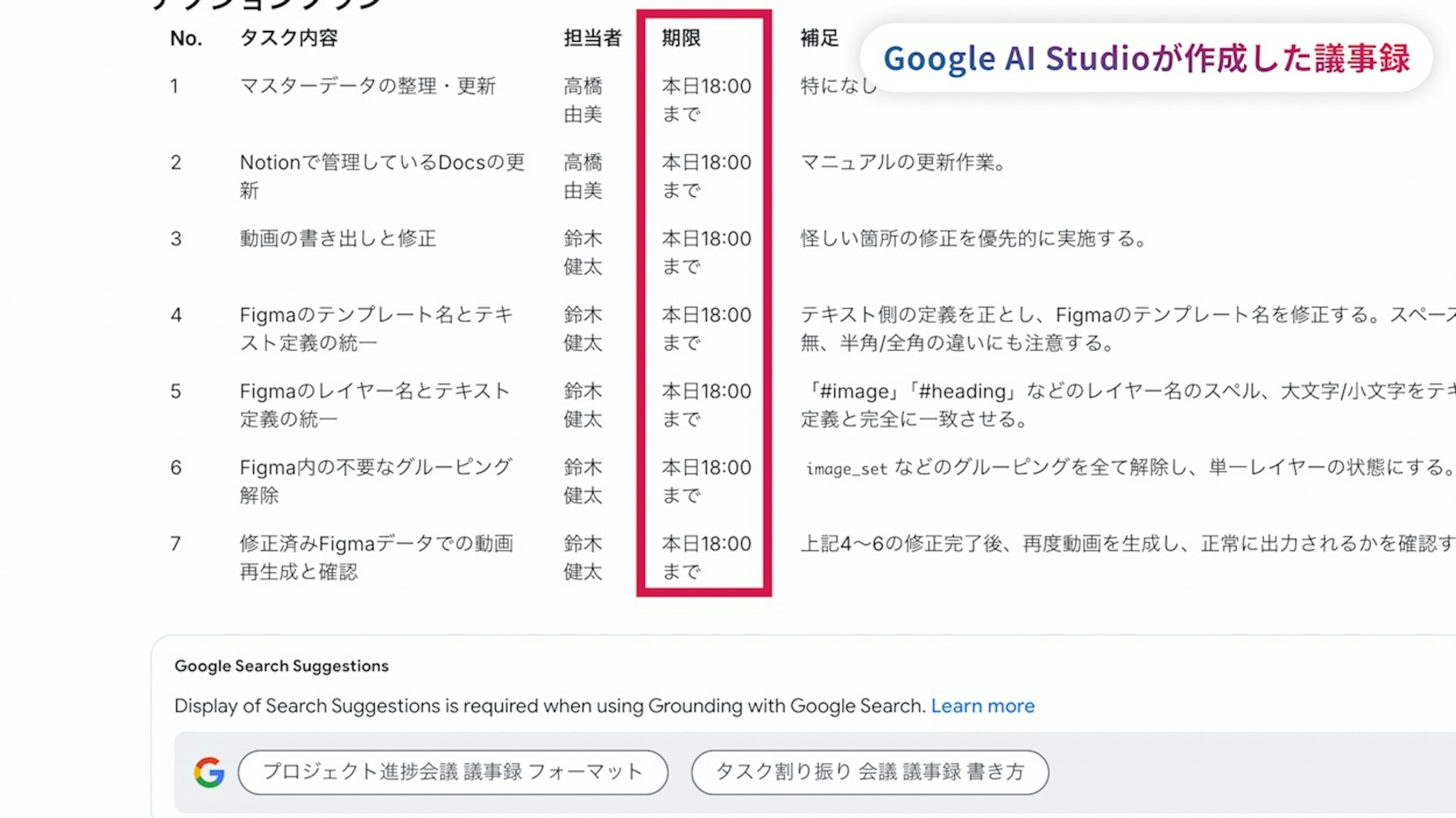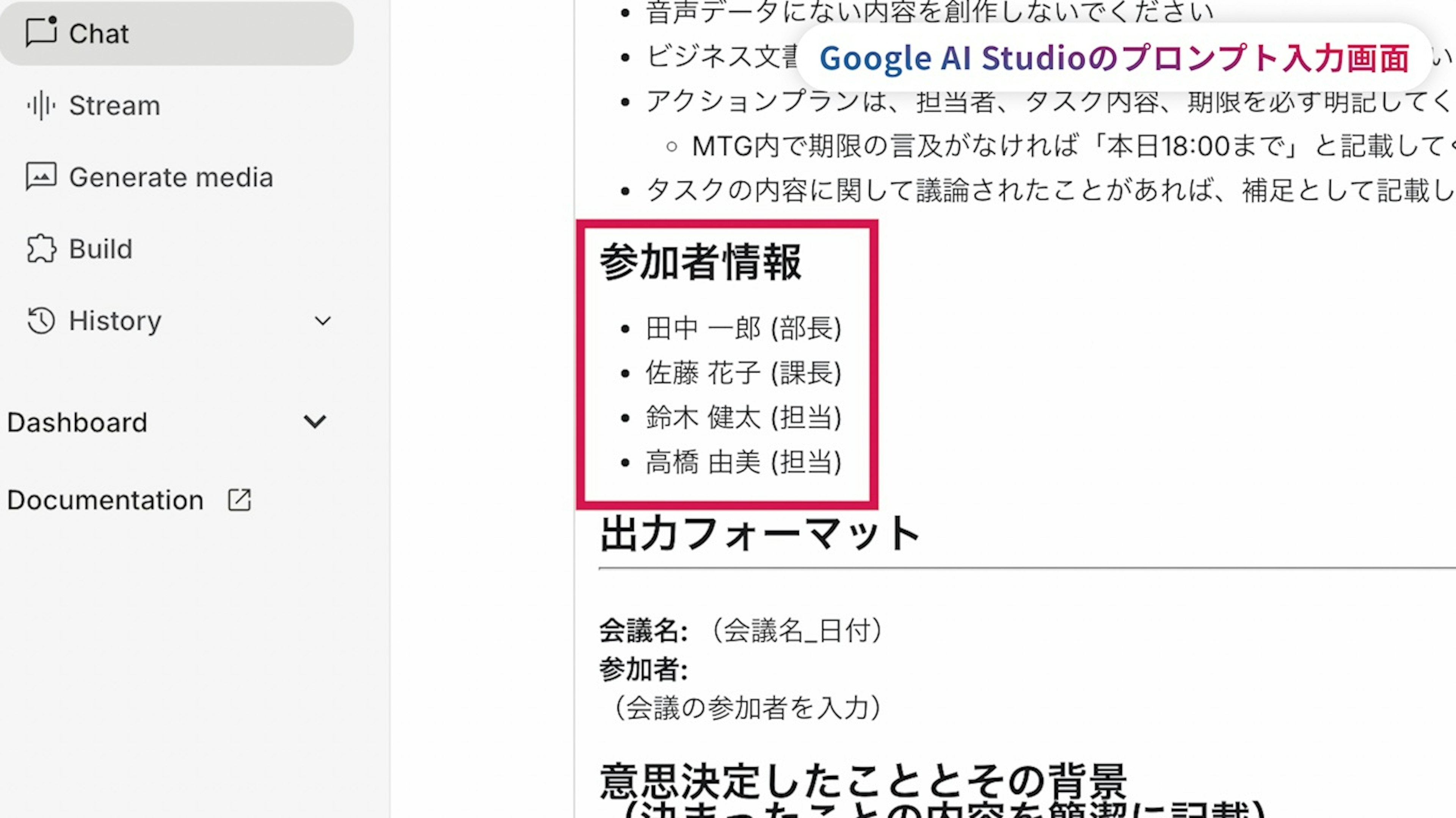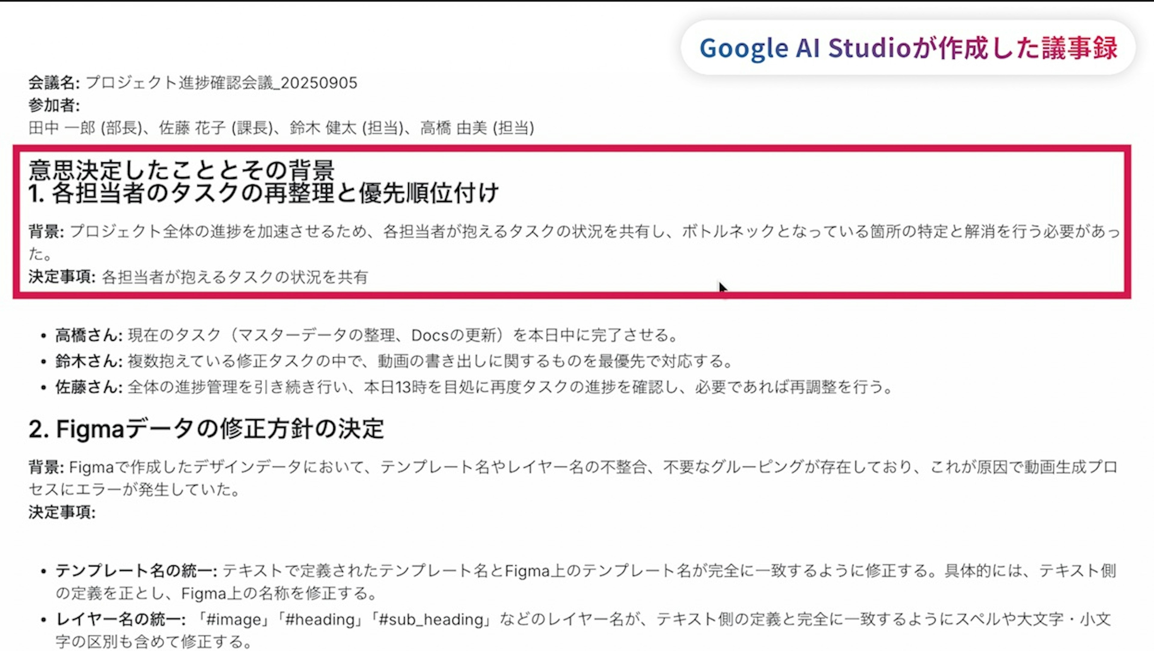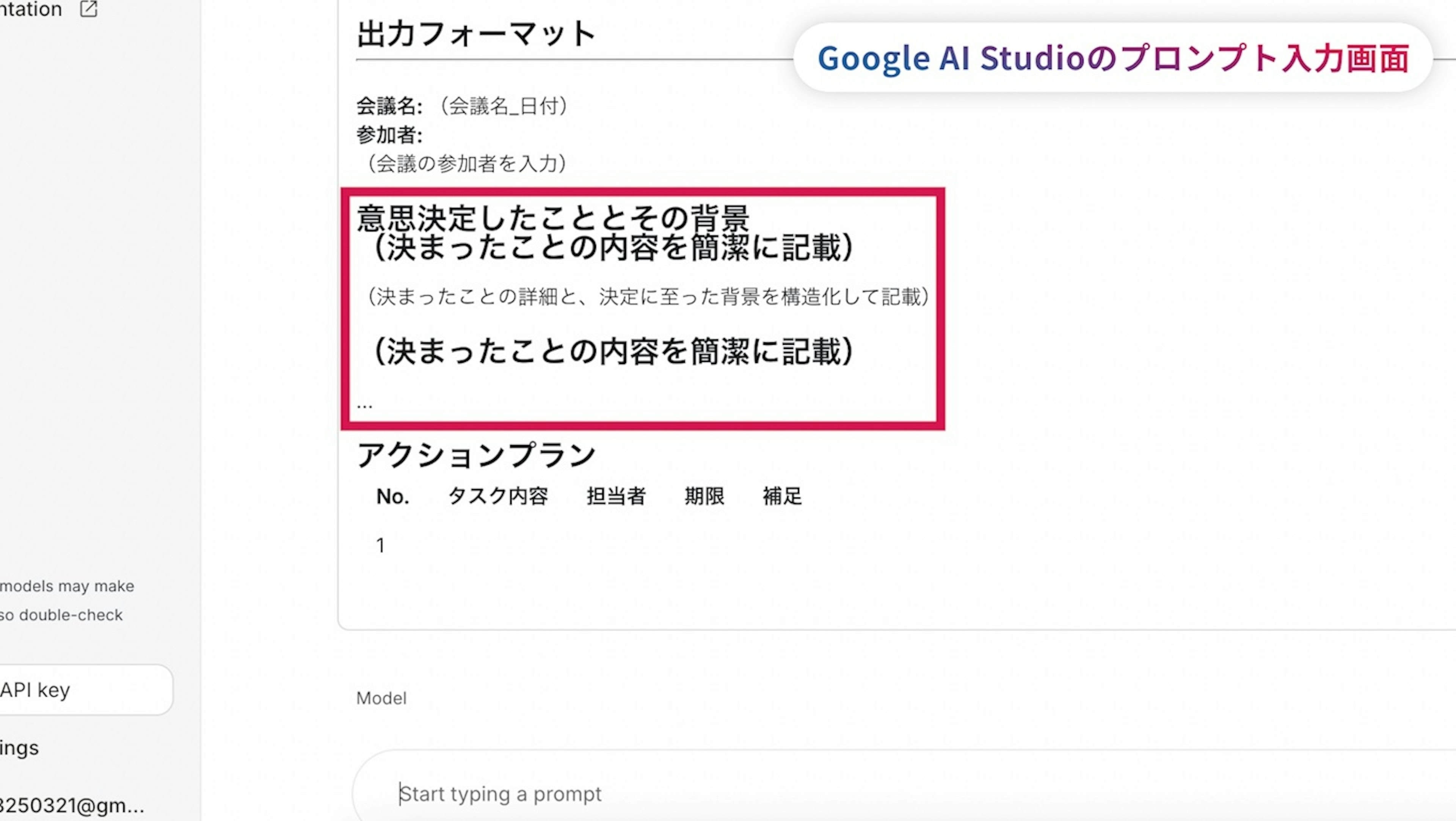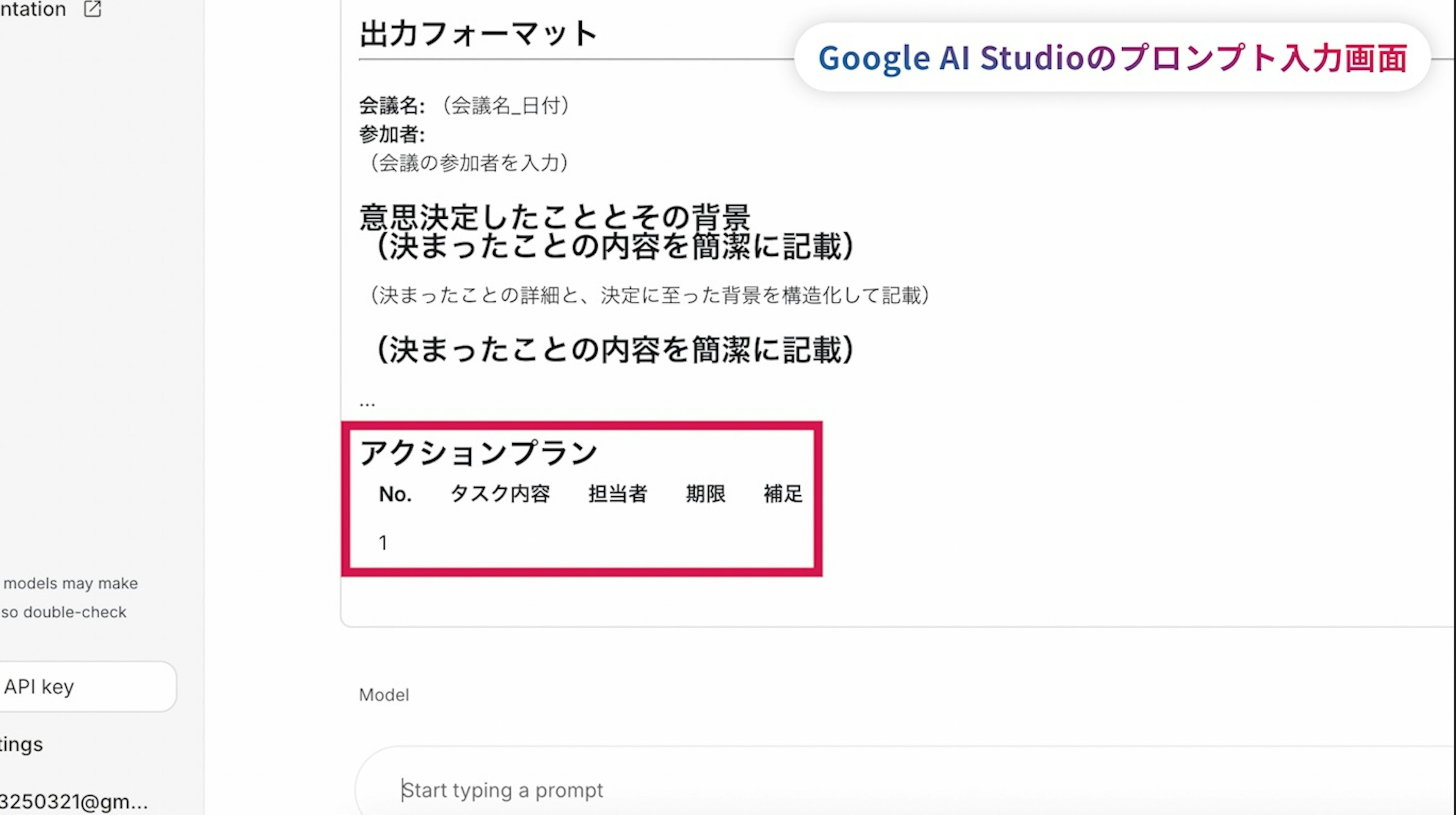 ここで使うのが、この「決定事項・ToDo抽出プロンプト」です。 (Google AI Studioはこちら)