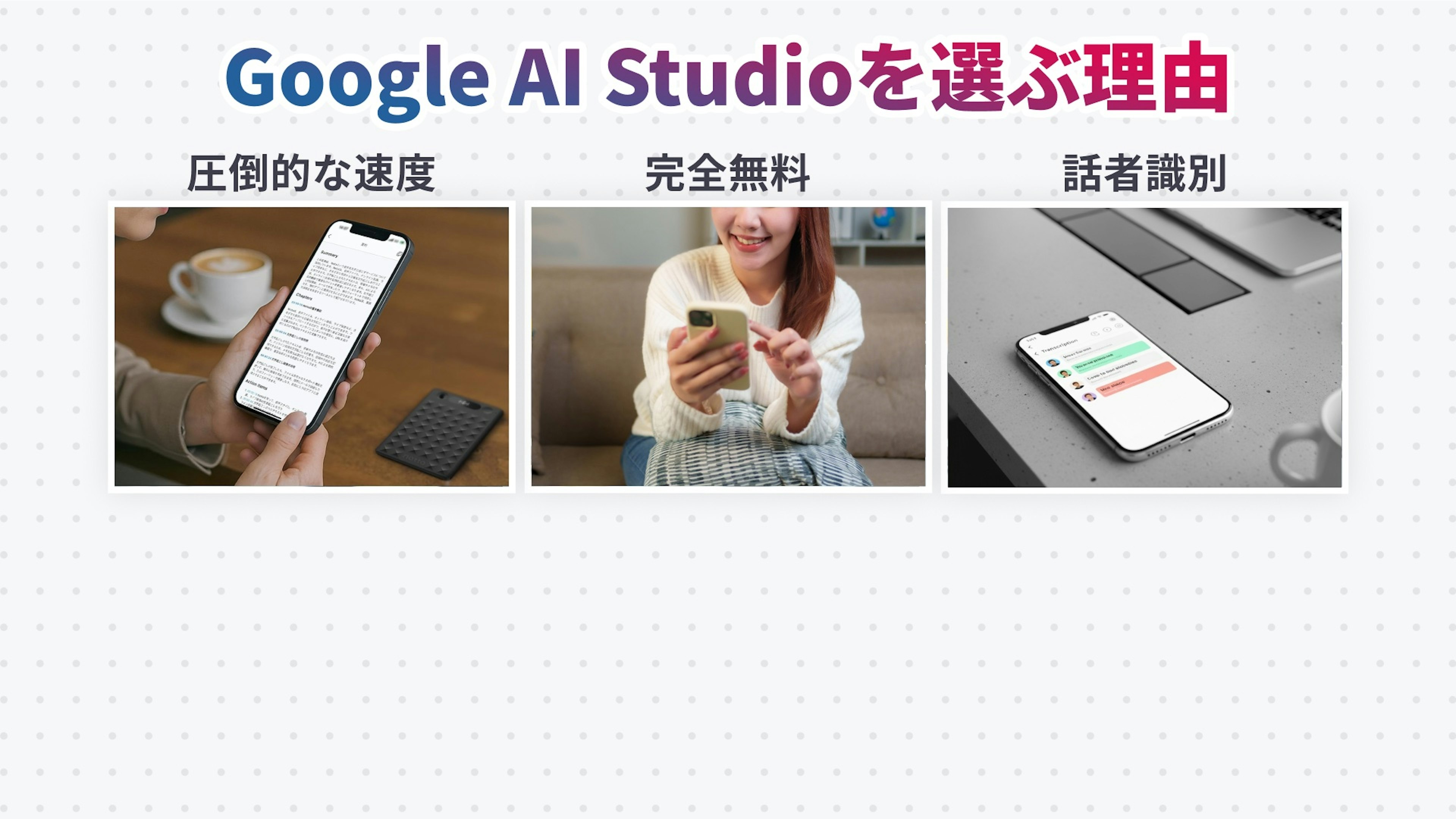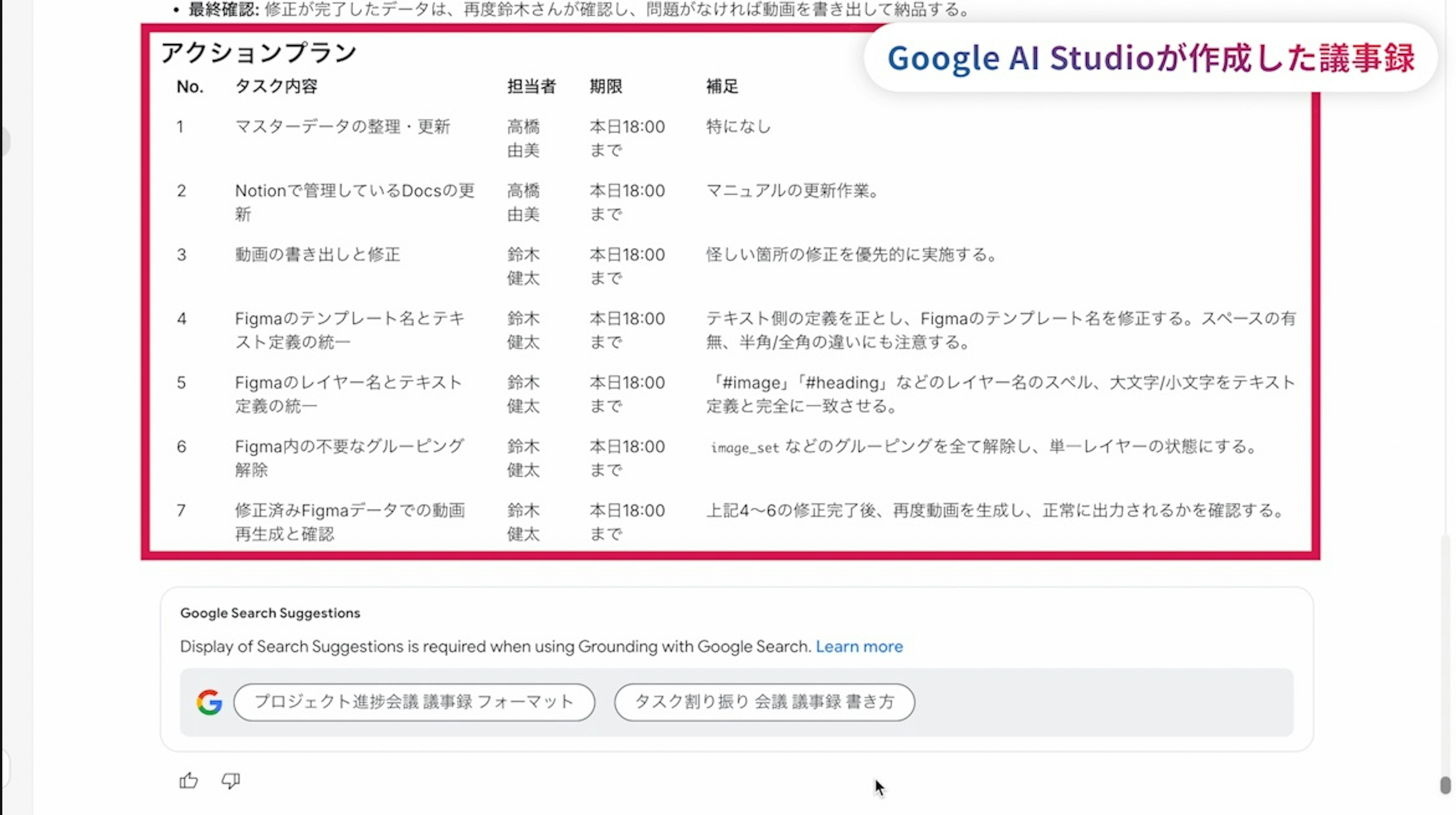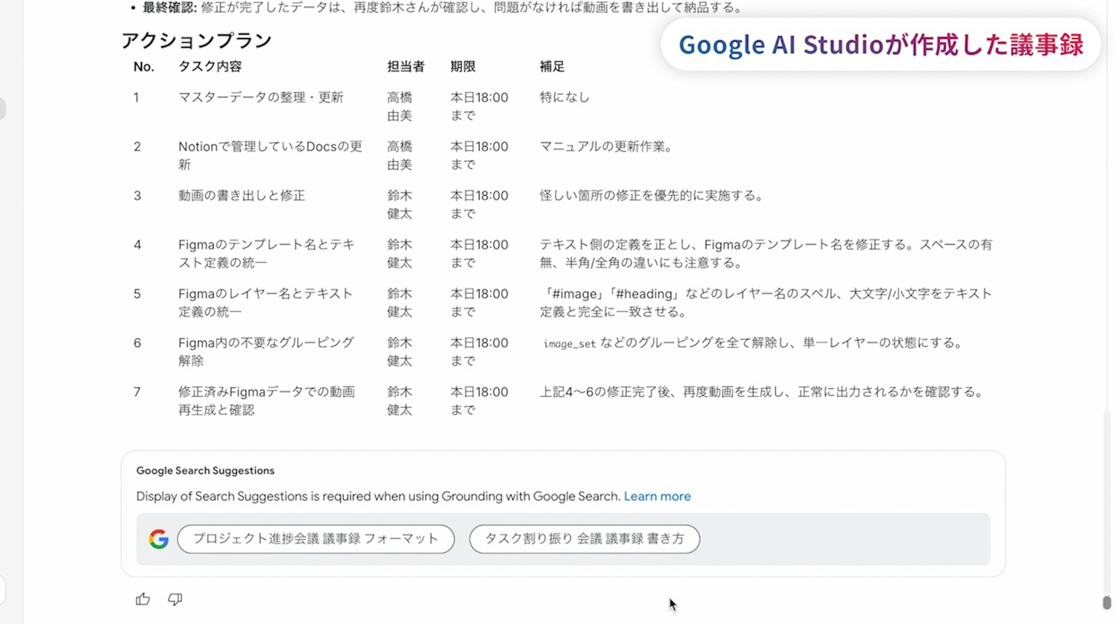 そのためには、Google AI Studioのように30分から40分程度の会議の録音データを1分以内に処理できる速度が不可欠です。