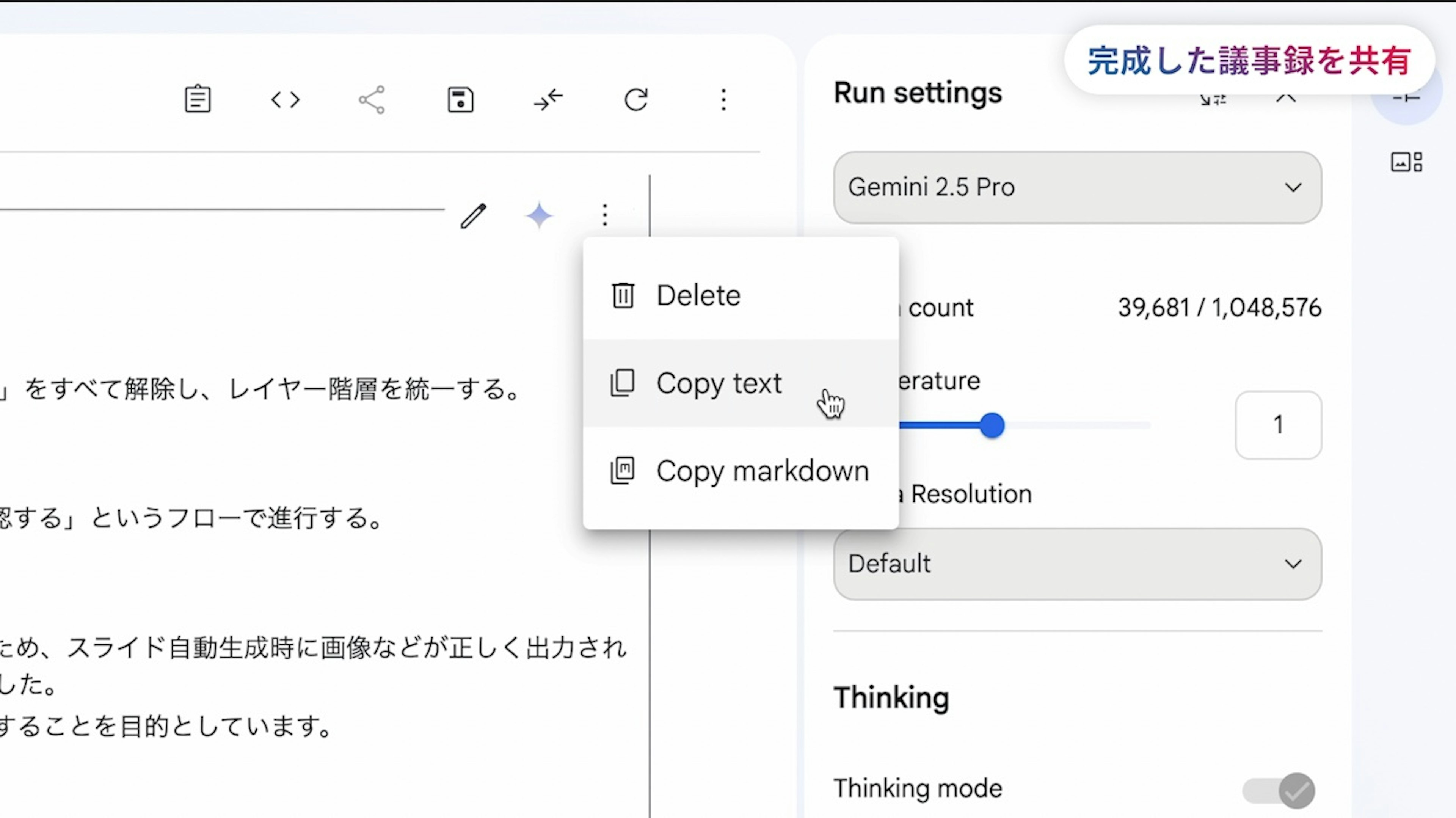 Google AI Studioのチャット右上にあるこちらのボタンから議事録のテキストをコピーし貼り付け、参加者に共有すれば、参加者同士で「ここ修正します」と話しつつ修正できます。