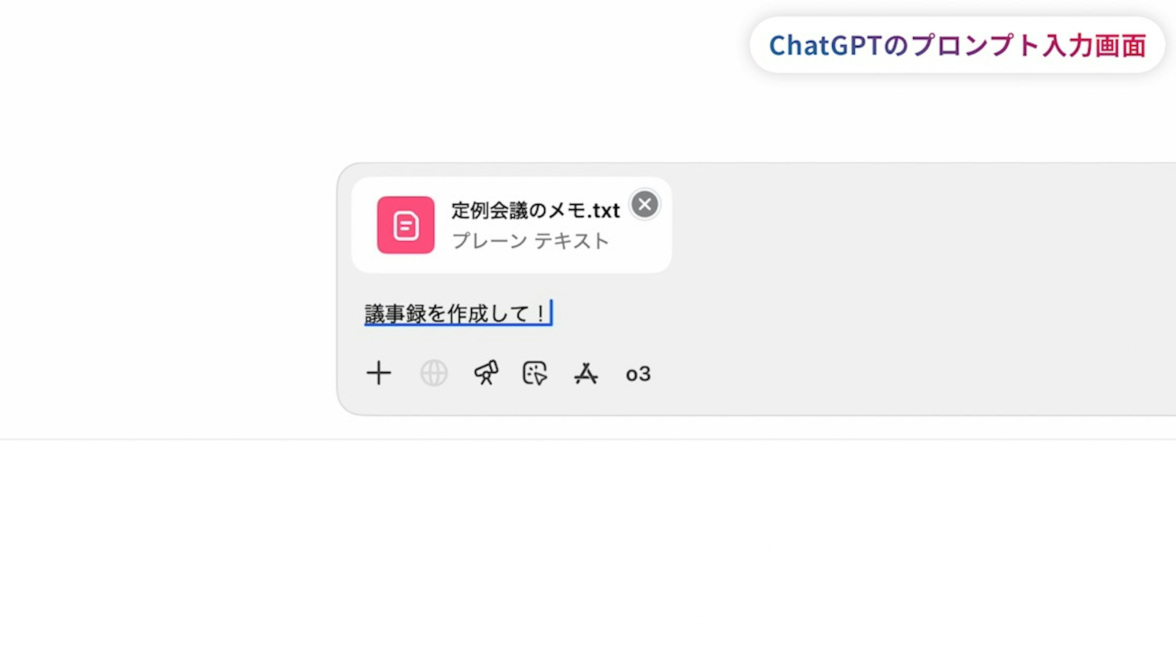 もちろんです!ChatGPTに「議事録を作成して!」とシンプルで洗練された指示を出しています!