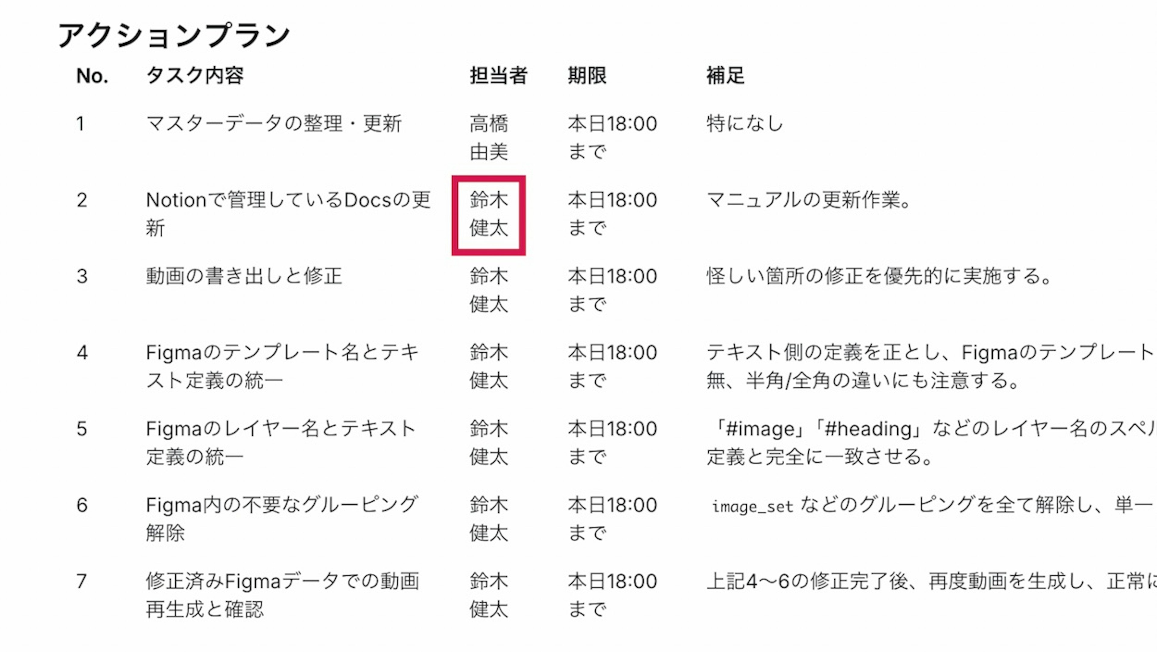 会議の最も重要な価値であるアクションプランは、誰が何をするのかが一目でわかるよう、担当者と期限付きの表にまとめる設計にしました。