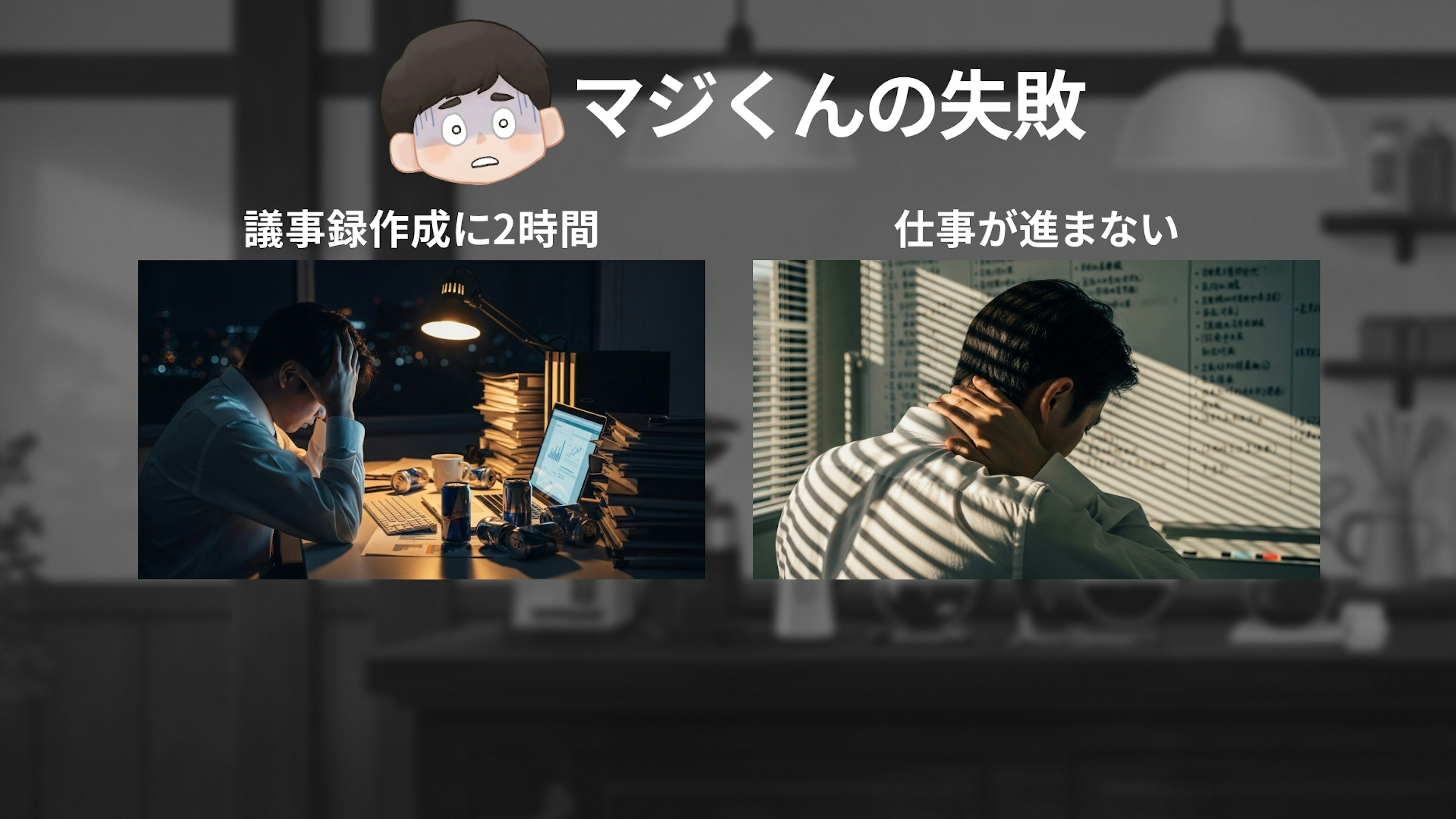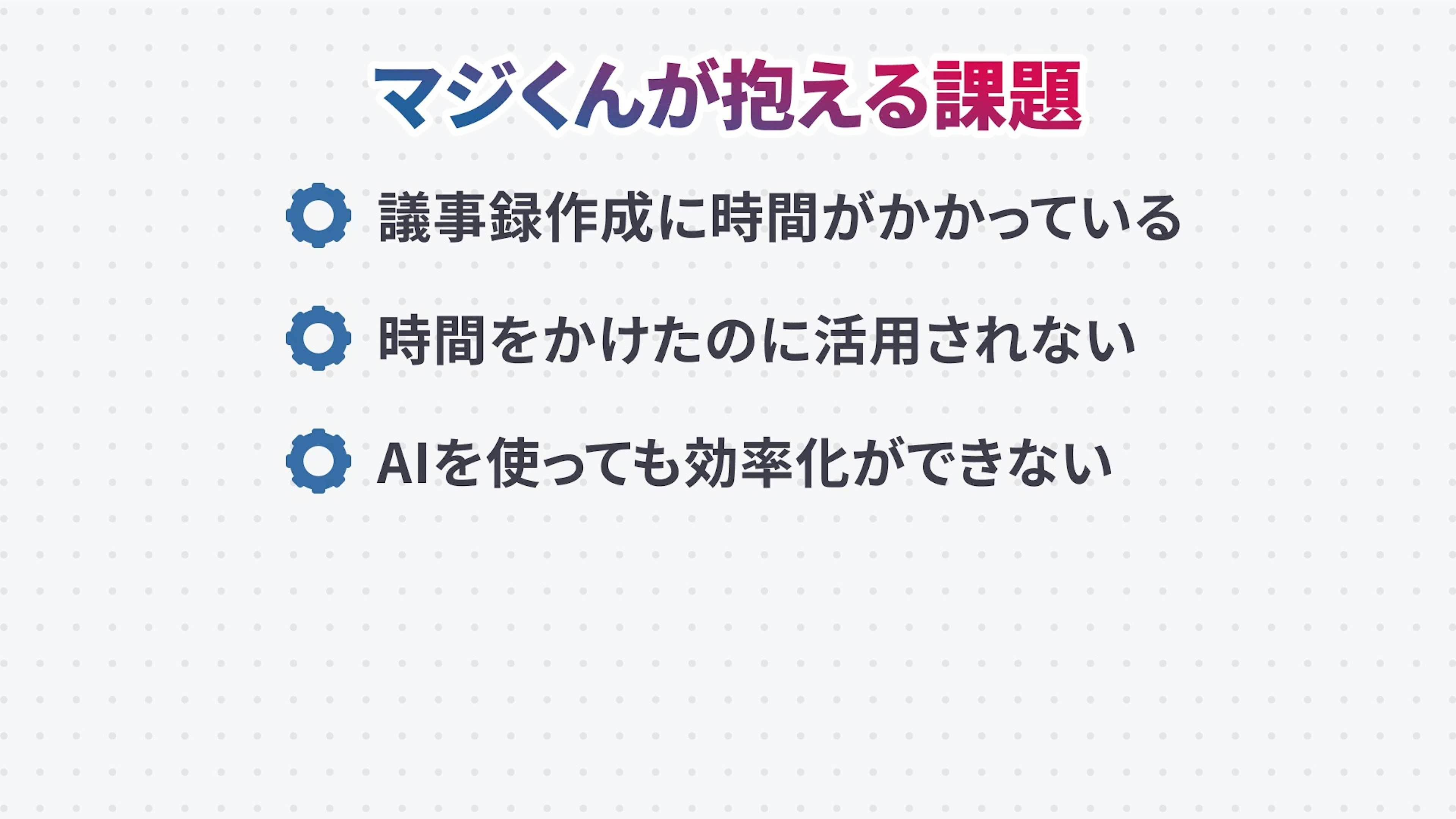 定例会議の議事録作成に2時間もかかっている。時間をかけても議事録は活用されず、AIを使っても上手くいかない。