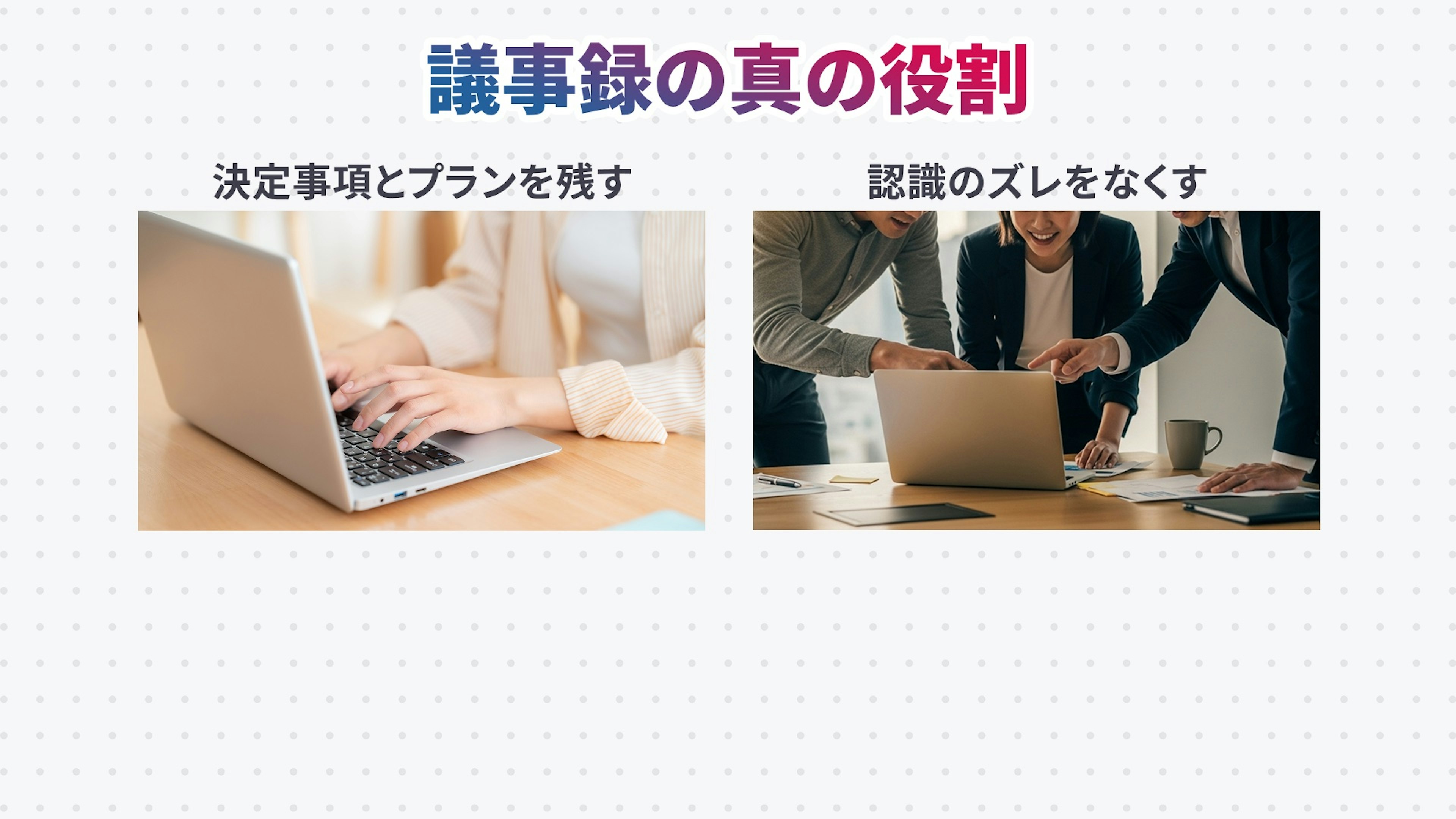 私が言いたいのは、議事録の役割が、会議の最も重要な価値である「決定事項」と「アクションプラン」をテキストで残し、参加者全員の認識をズレなくそろえることだということです。
