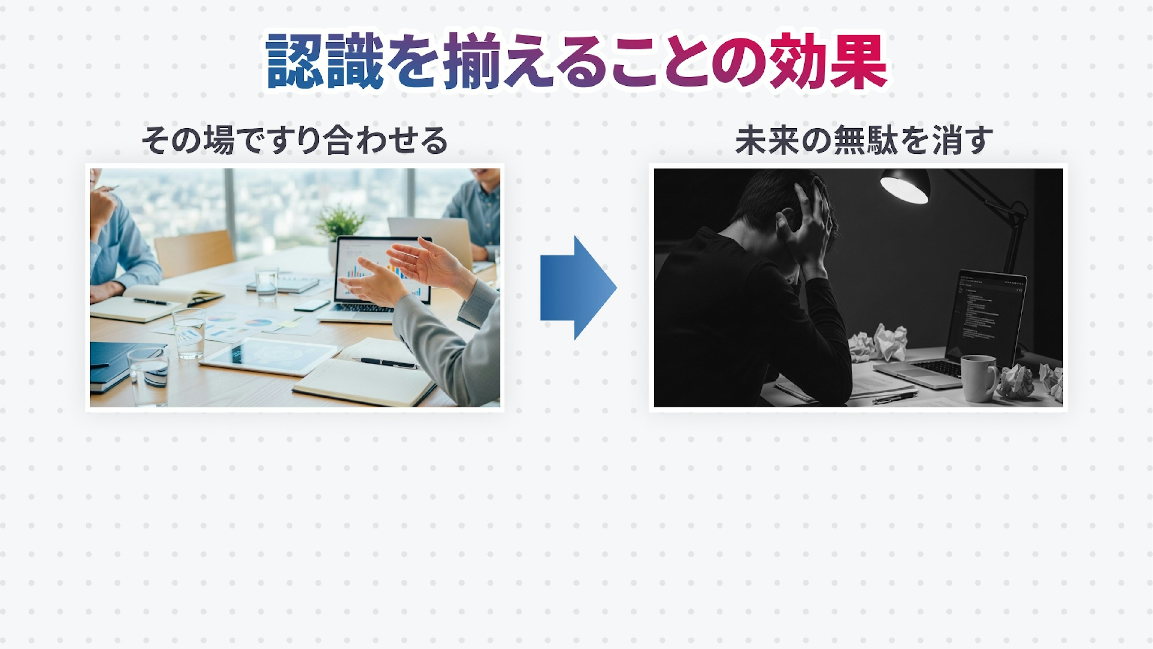 その場の全員での認識のすり合わせは、未来の数時間、いえ、数日間の無駄を防ぐ効率的な投資です。