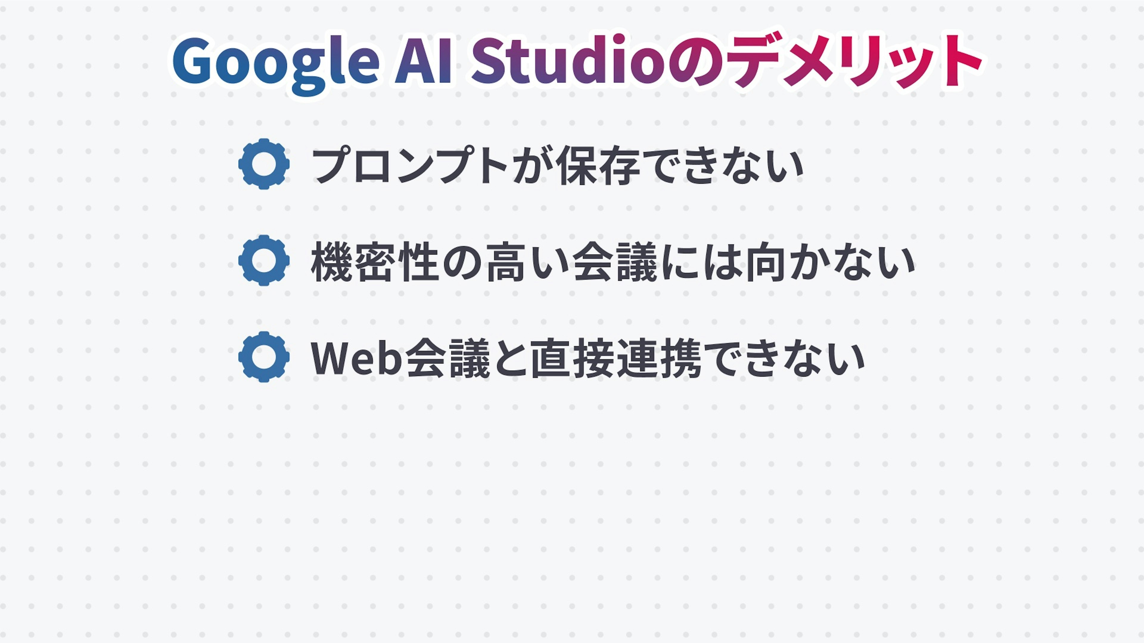 例えば、毎回打つプロンプトをテンプレートとして保存できないことや、送ったデータがGoogleのAI学習に使われてしまうため、機密性の高い会議には向かない可能性があることWeb会議と直接連携できないことなどです。