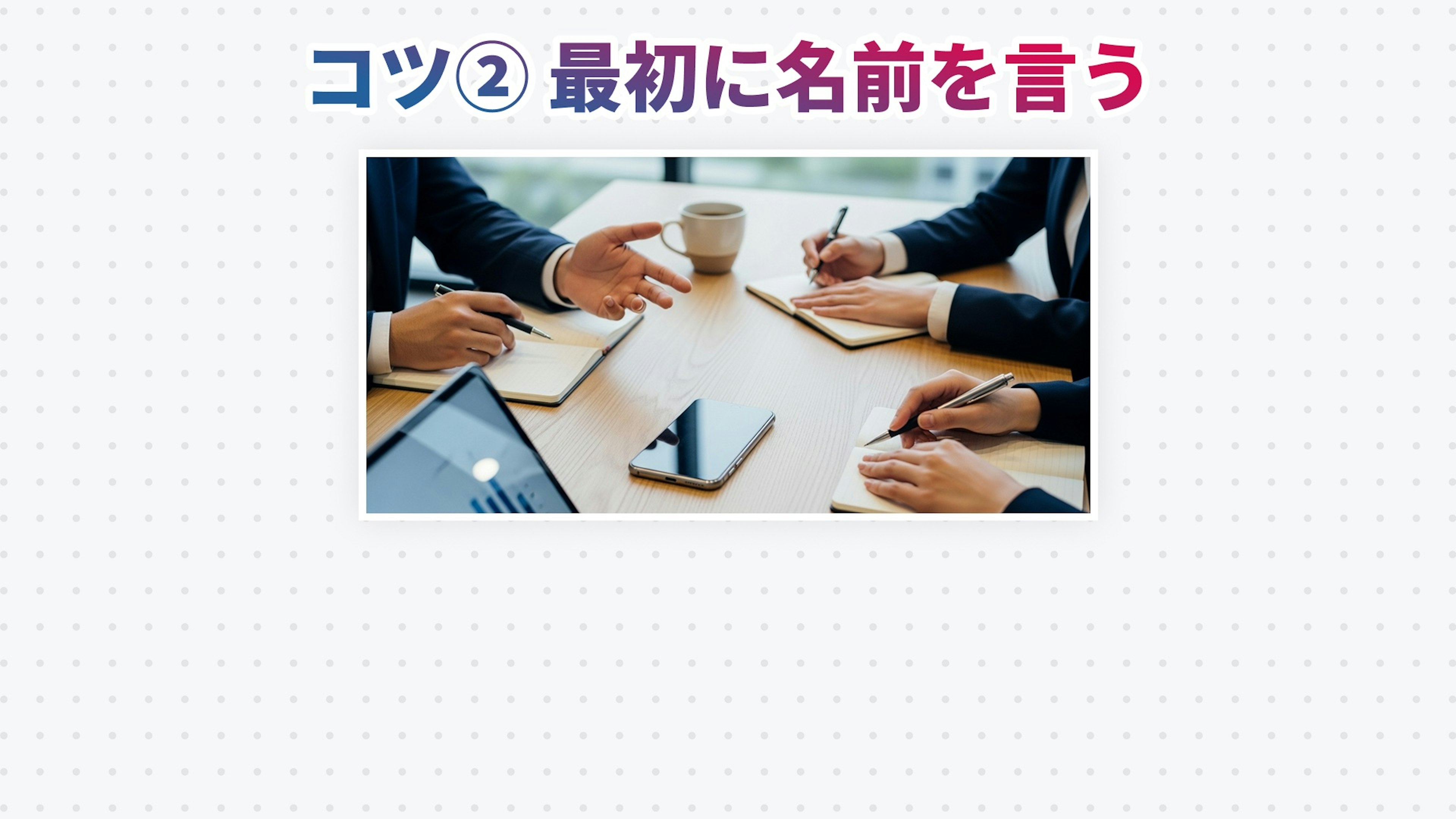 例えば、会議の最初に『今日の参加者は鈴木さん、佐藤さん、田中さん』と言ったように、それぞれが自分の名前を言っておくのが良いでしょう。