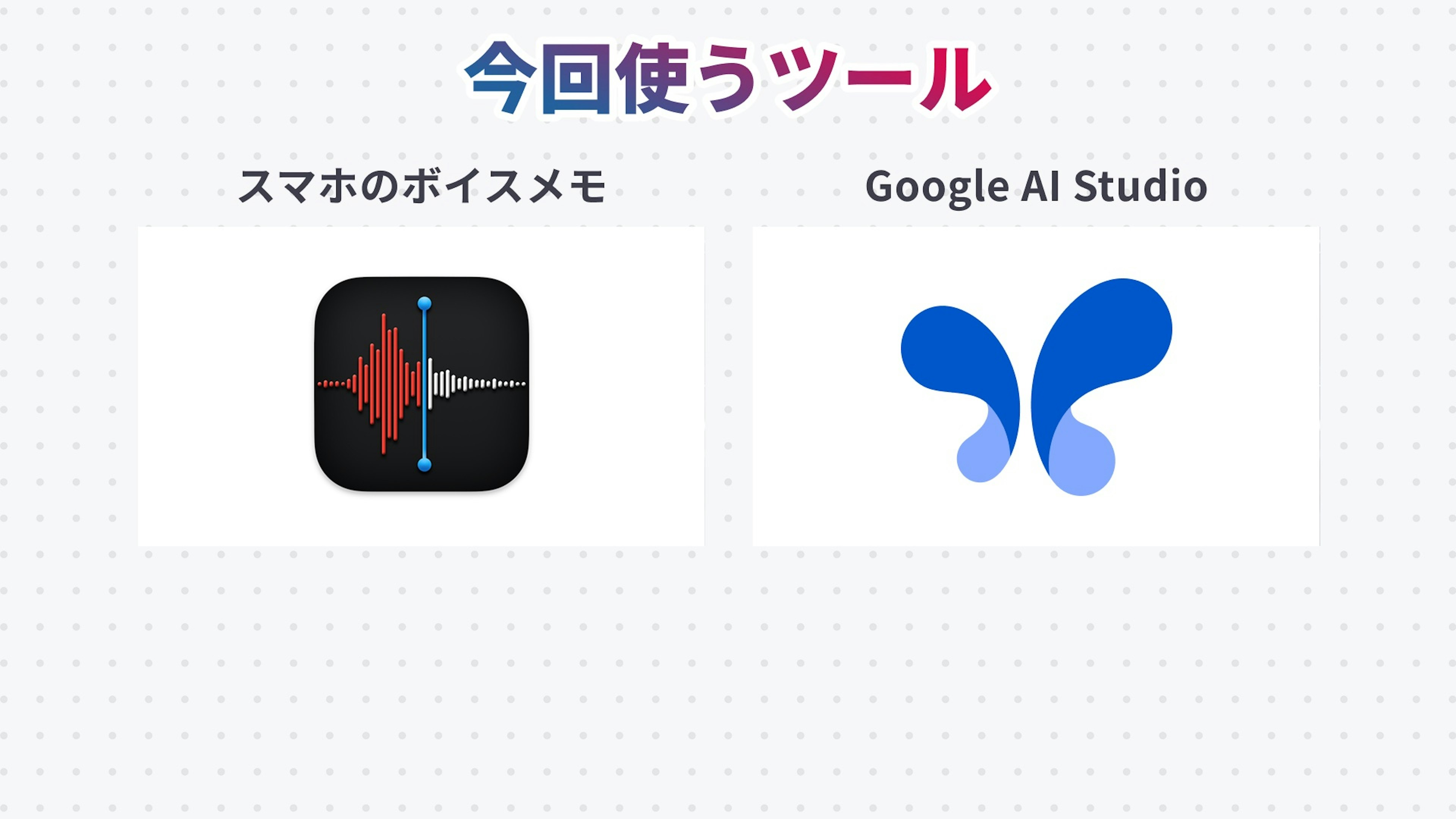 スマートフォンに標準で入っている録音機能と、Googleが提供するGoogle AI Studio。この2つだけです