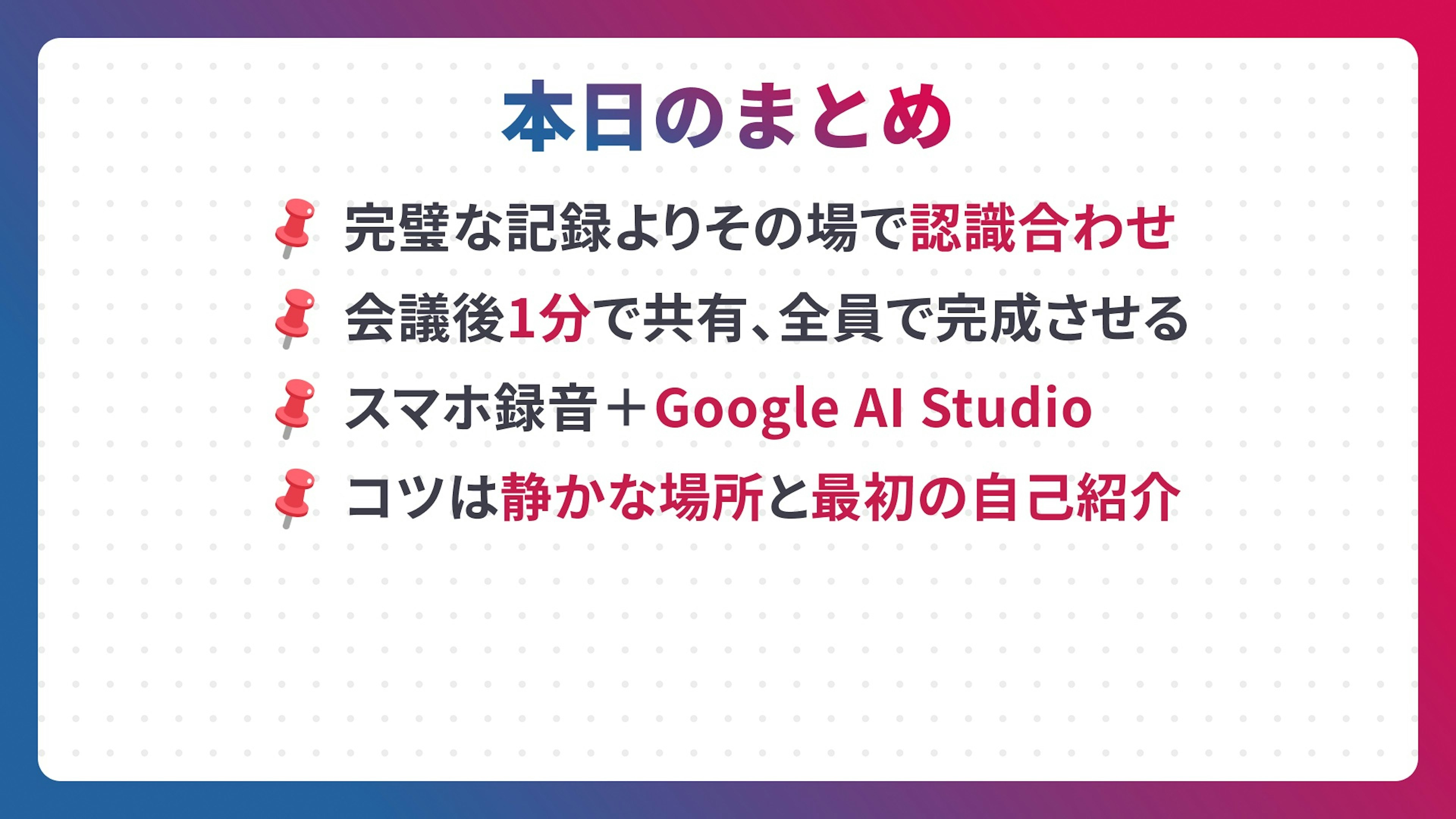 今日の一番のポイントは、議事録の目的は完璧な記録ではなく、チームの認識を合わせることであり、そのためにAIの速度を最大限に活用することでした。