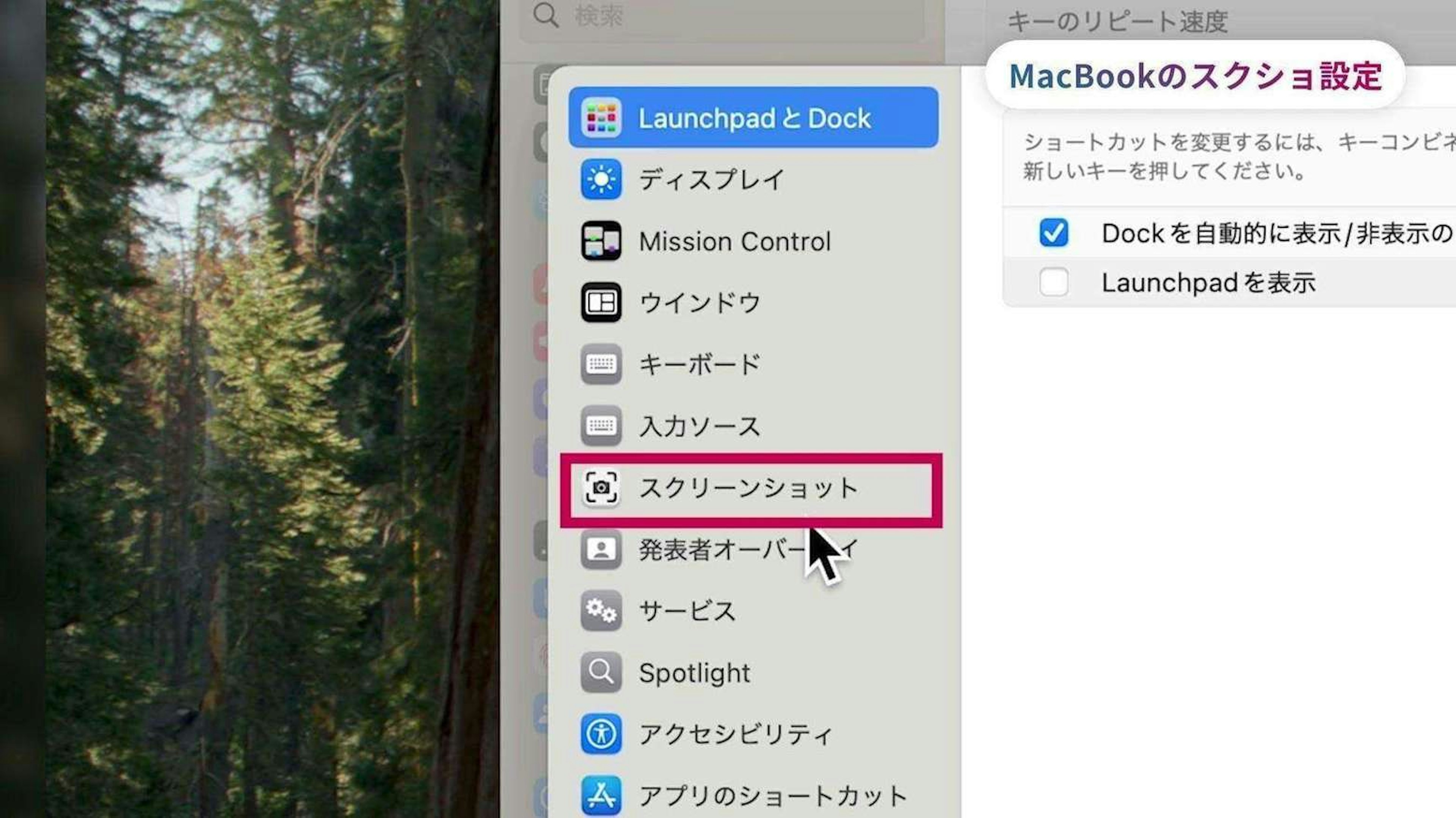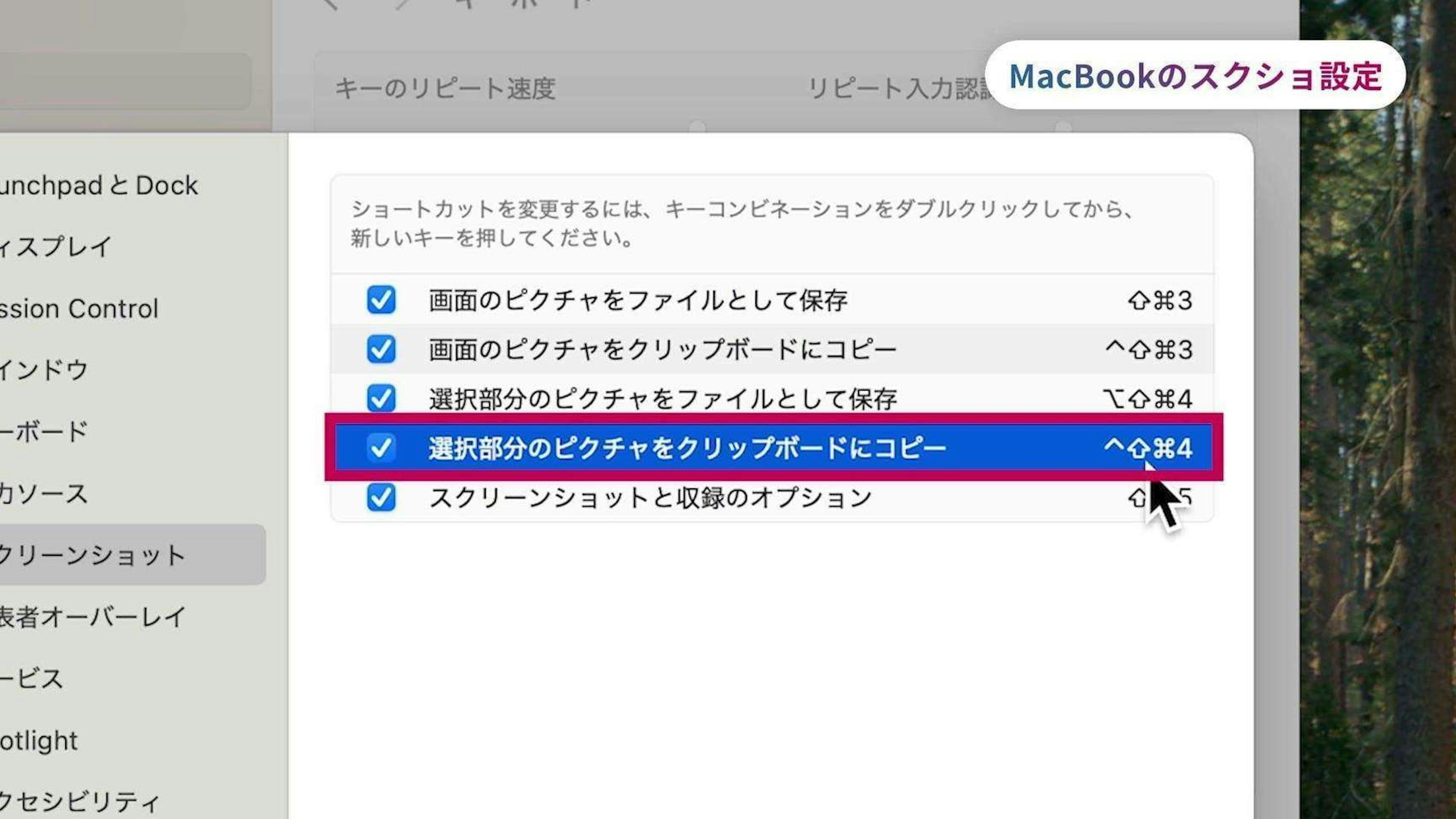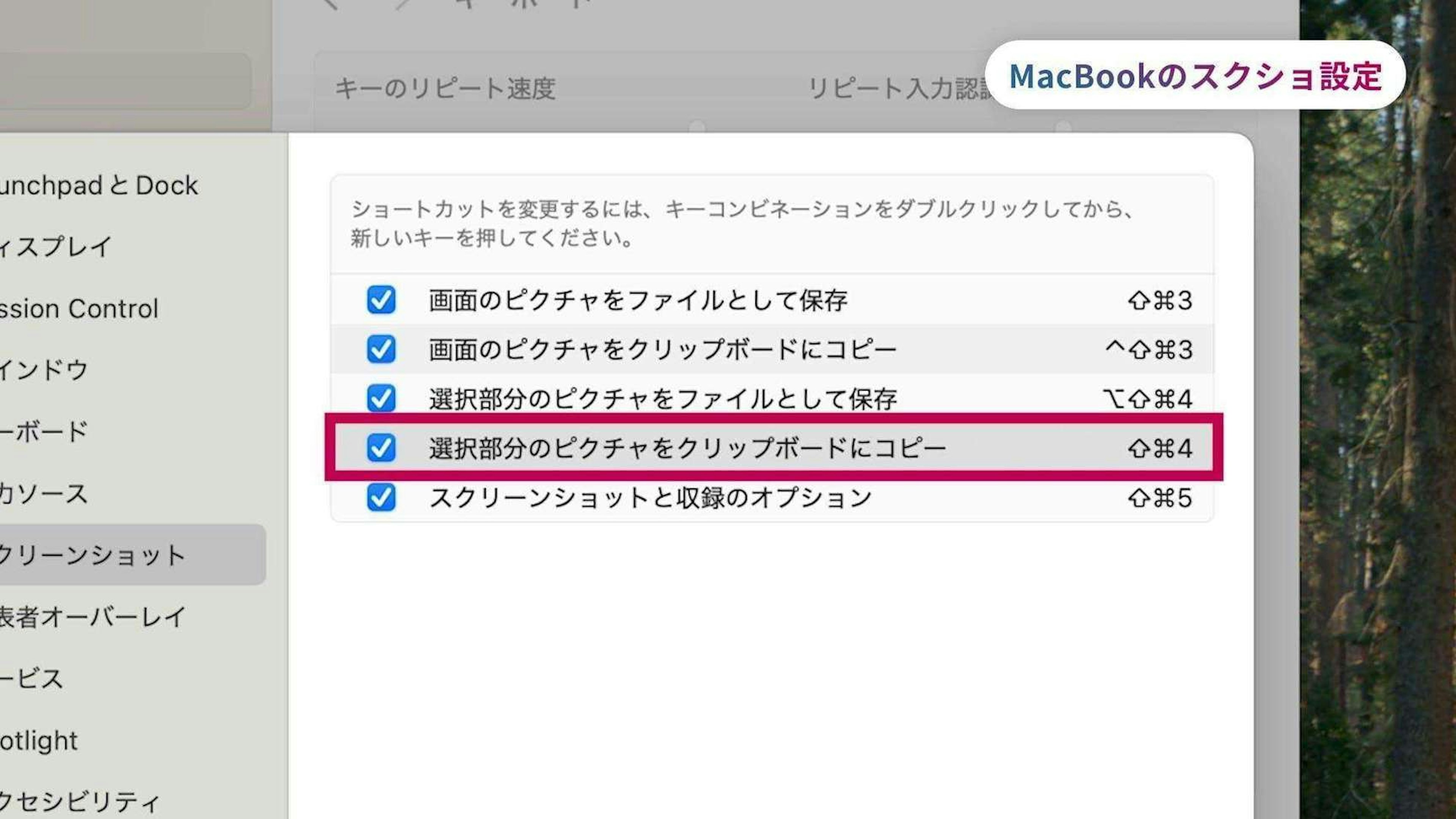 「スクリーンショット」のところから「選択部分のピクチャをクリップボードにコピー」を、「Command + Shift + 4」で行えるようにしておくのがおすすめです。