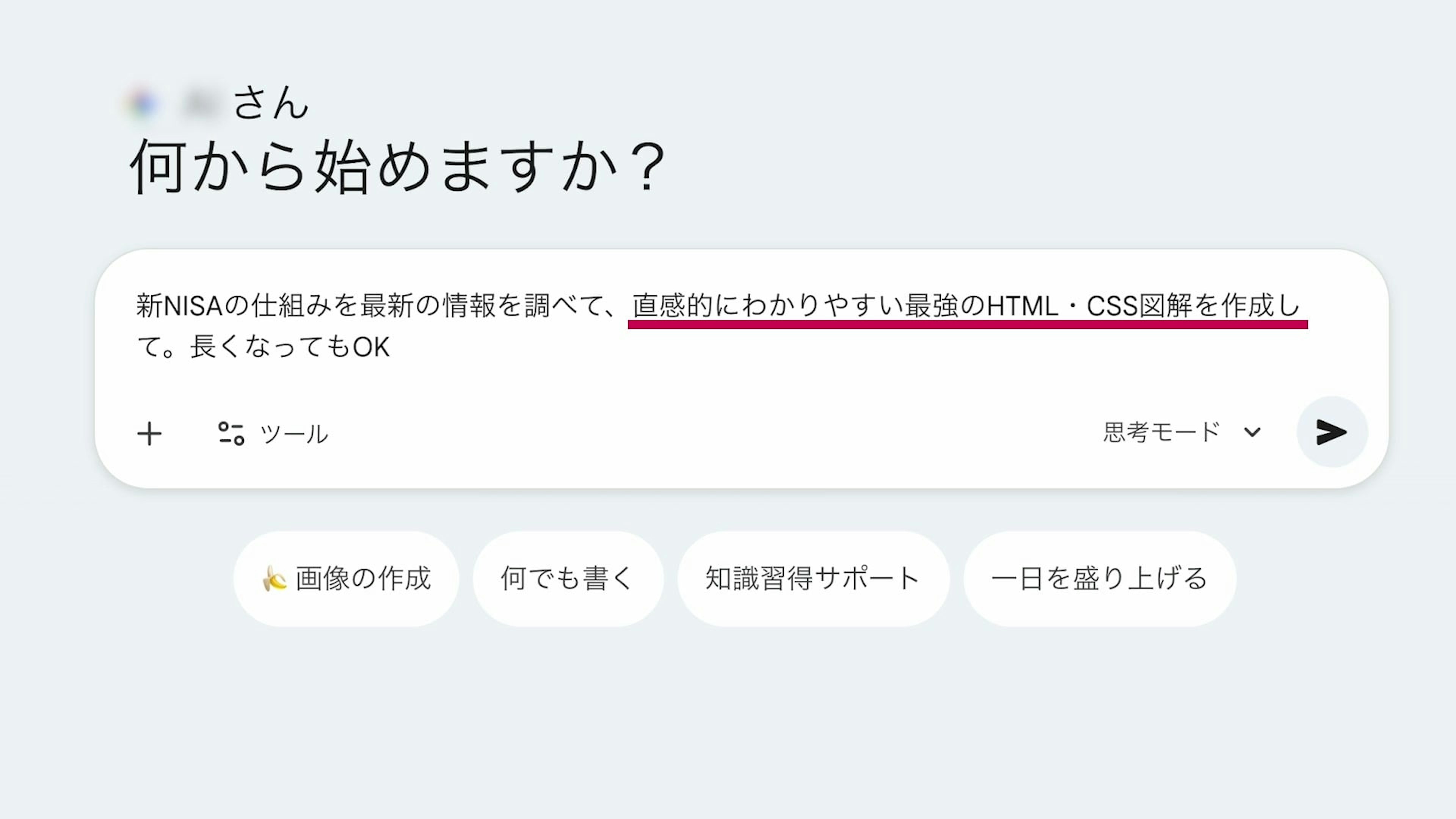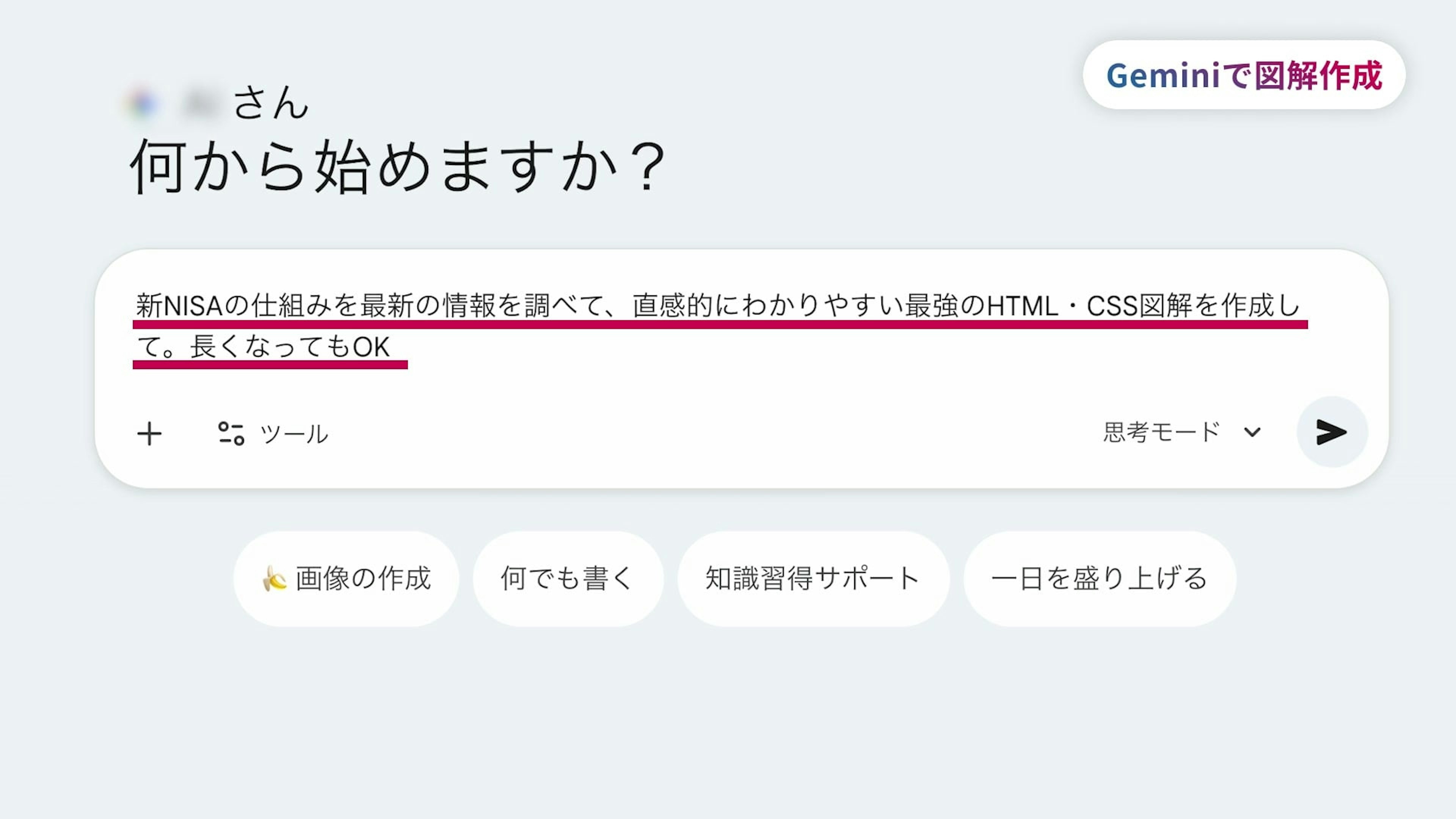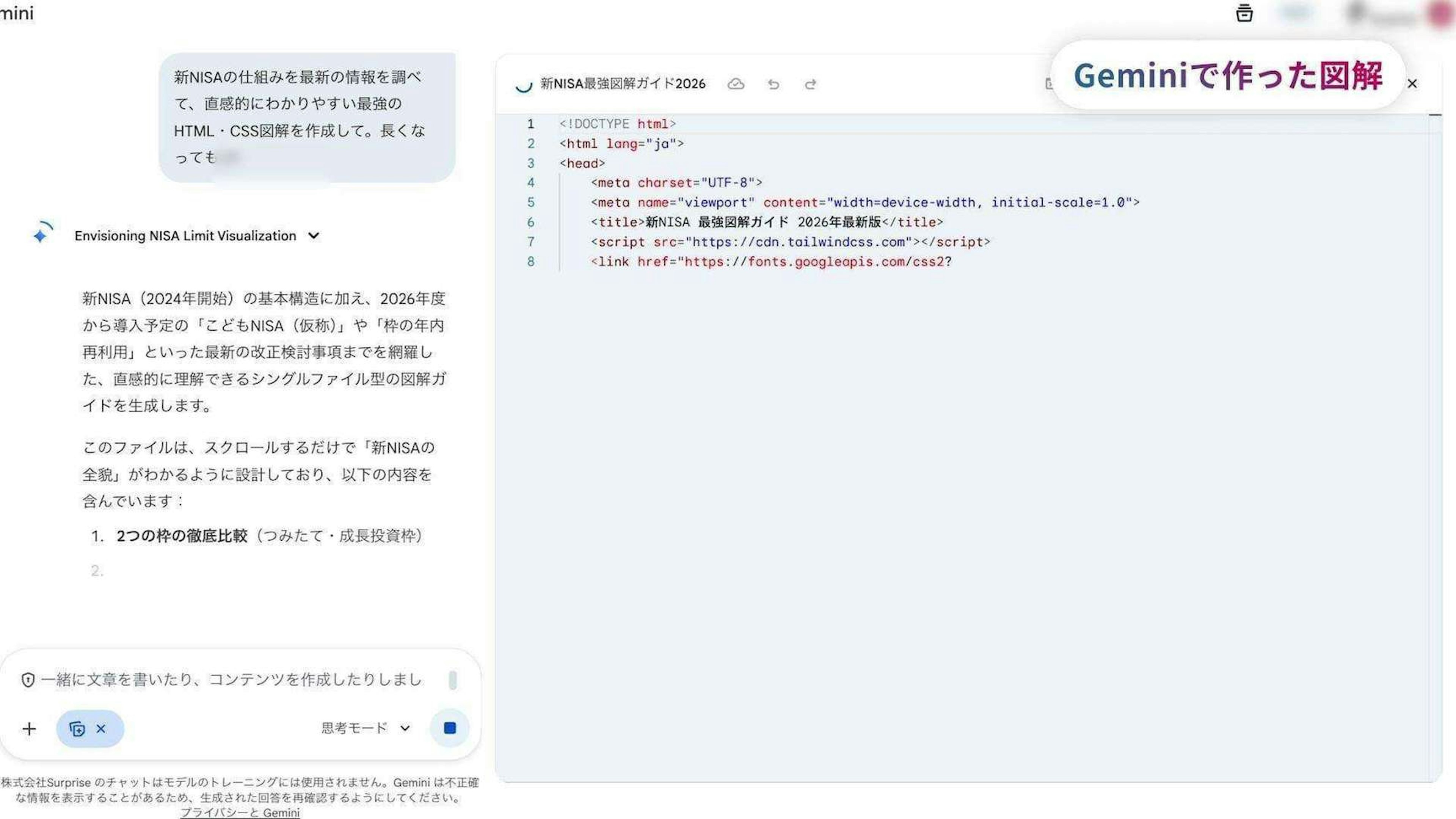 では早速、「新NISAの仕組みを最新の情報を調べて、直感的にわかりやすい最強のHTML・CSS図解を作成して。