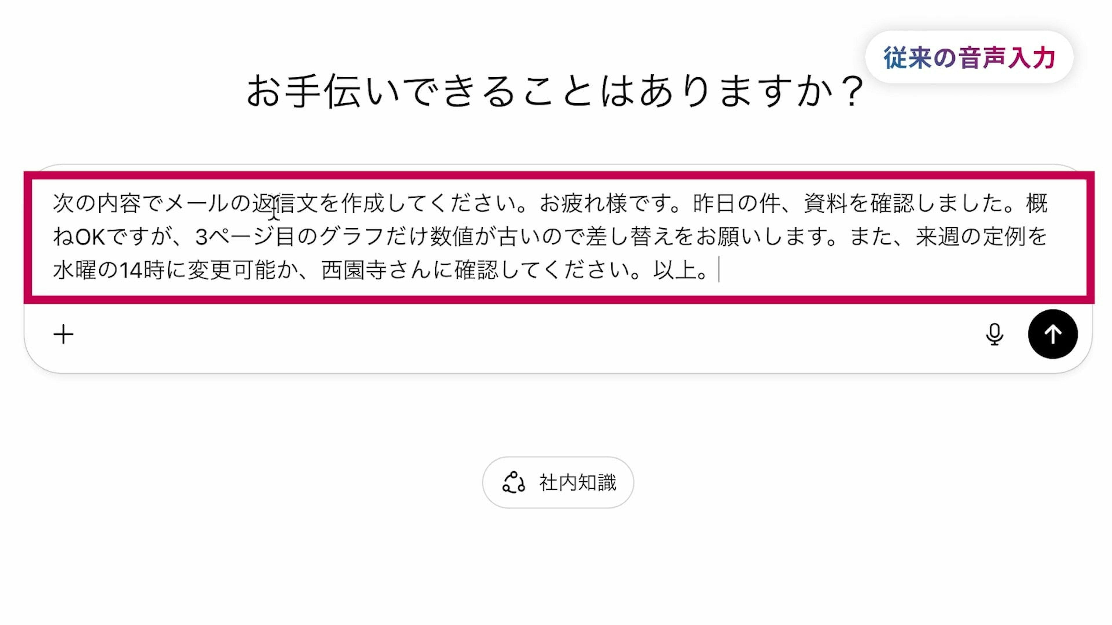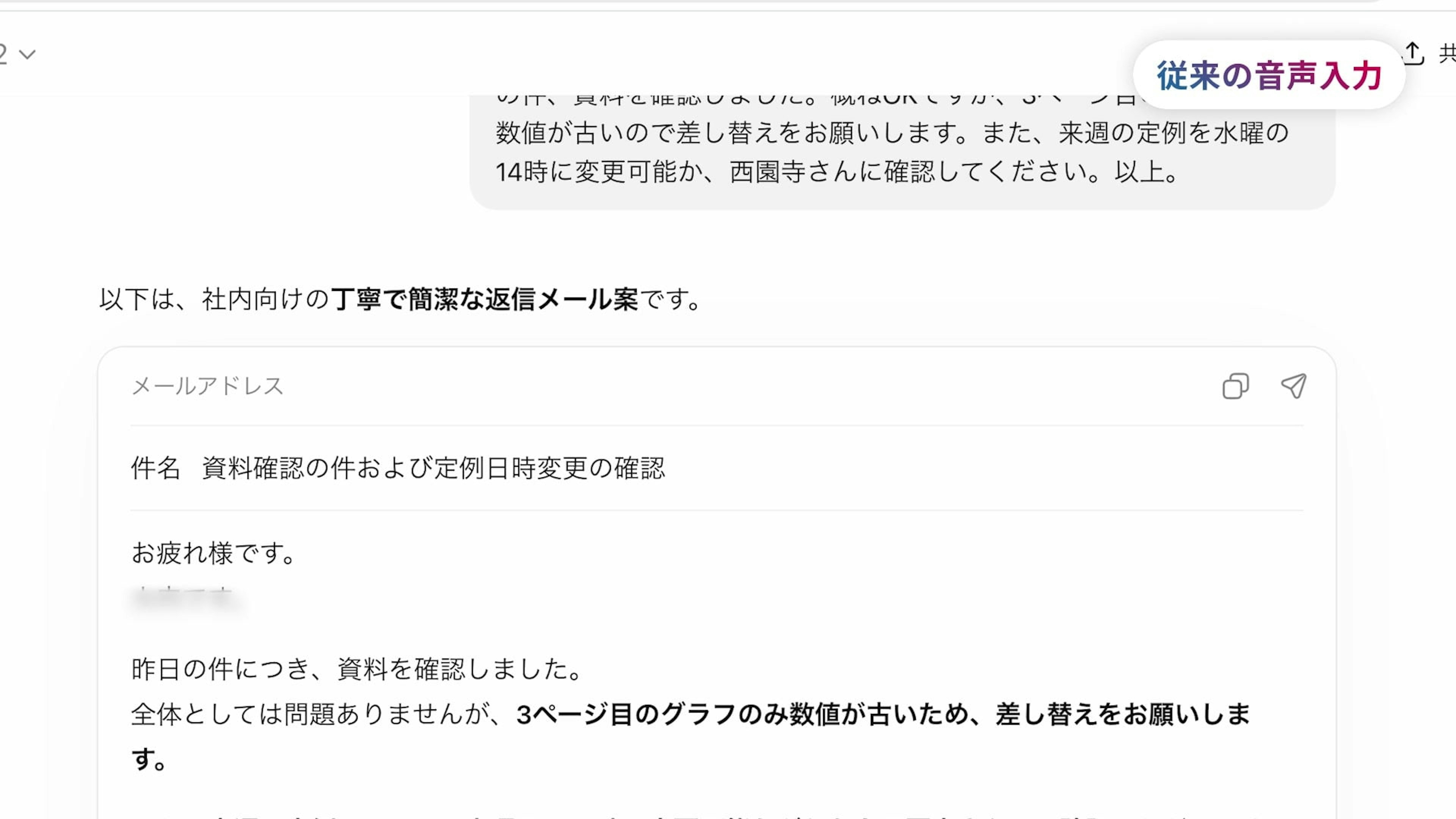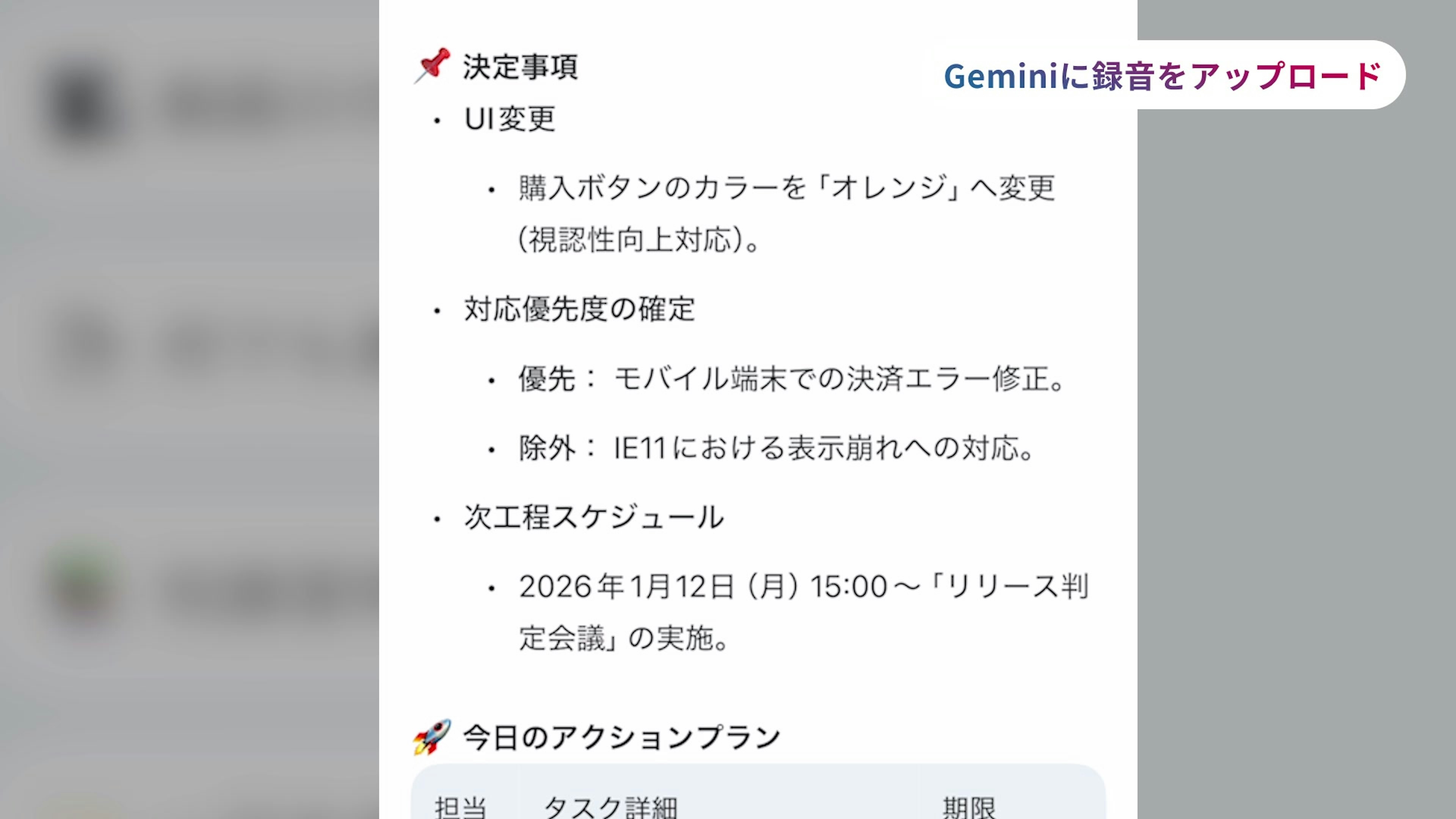 録音したデータをAIに渡すだけで、会議の決定事項とアクションプランを出力してくれます。