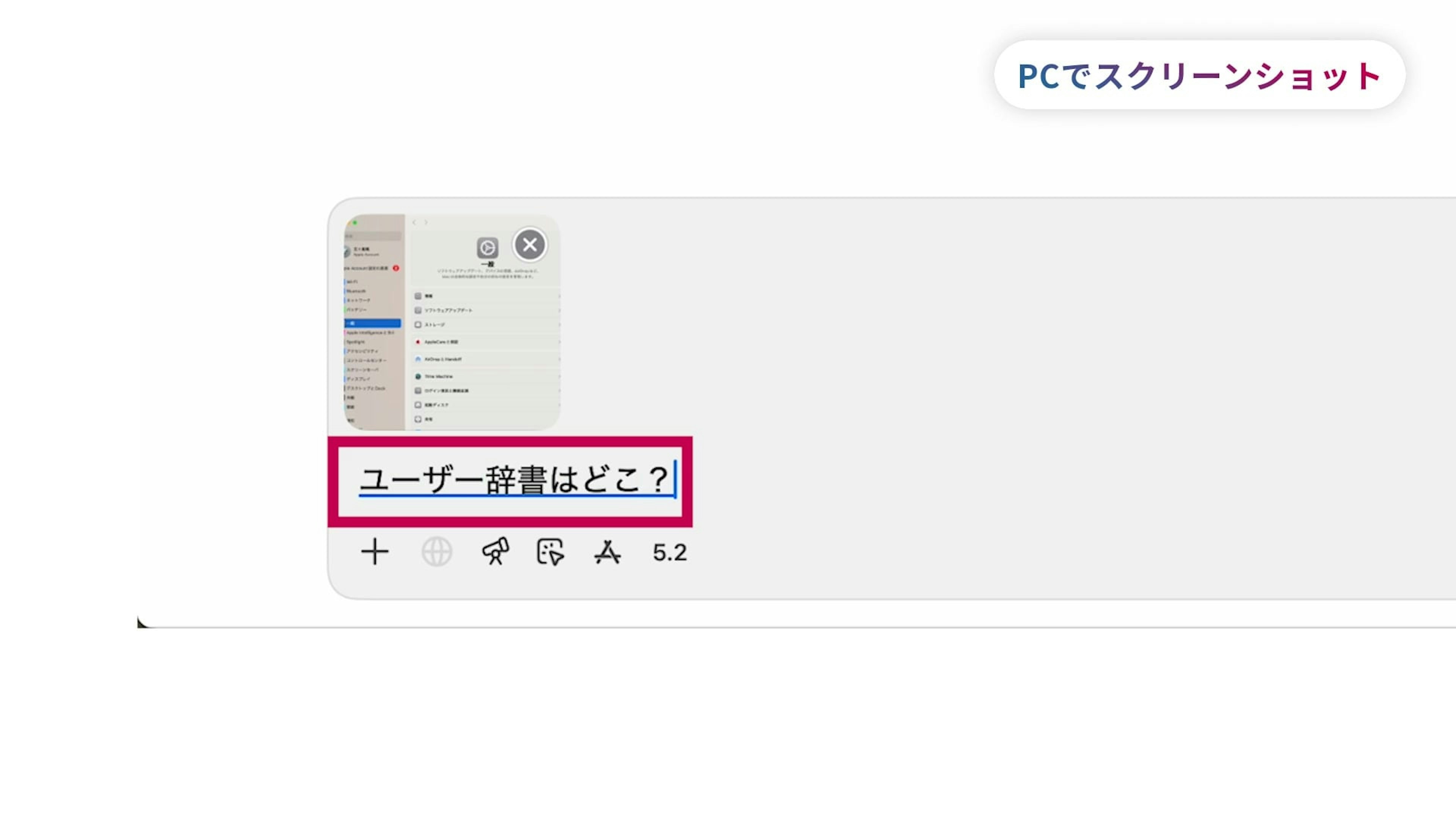 例えばPCの設定で、ユーザー辞書をどうやって開くか調べたいとき、私はここでスクショを撮って、そのままAIのチャット欄に貼り付けて、「ユーザー辞書はどこ?」と質問します。