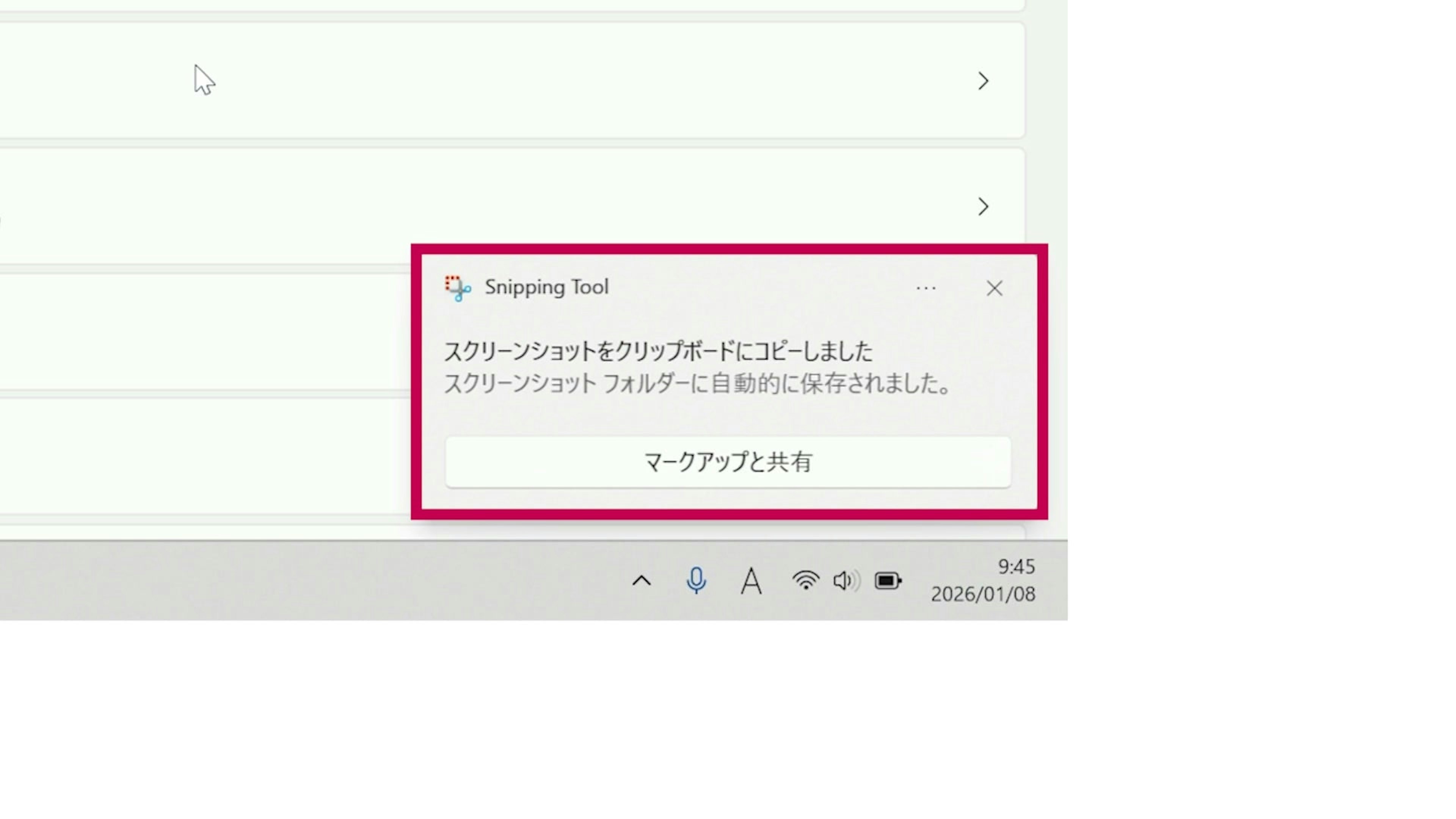 これを押すと画面が暗くなり、範囲を選択するだけで、選択した箇所が画像としてコピーされた状態になります。