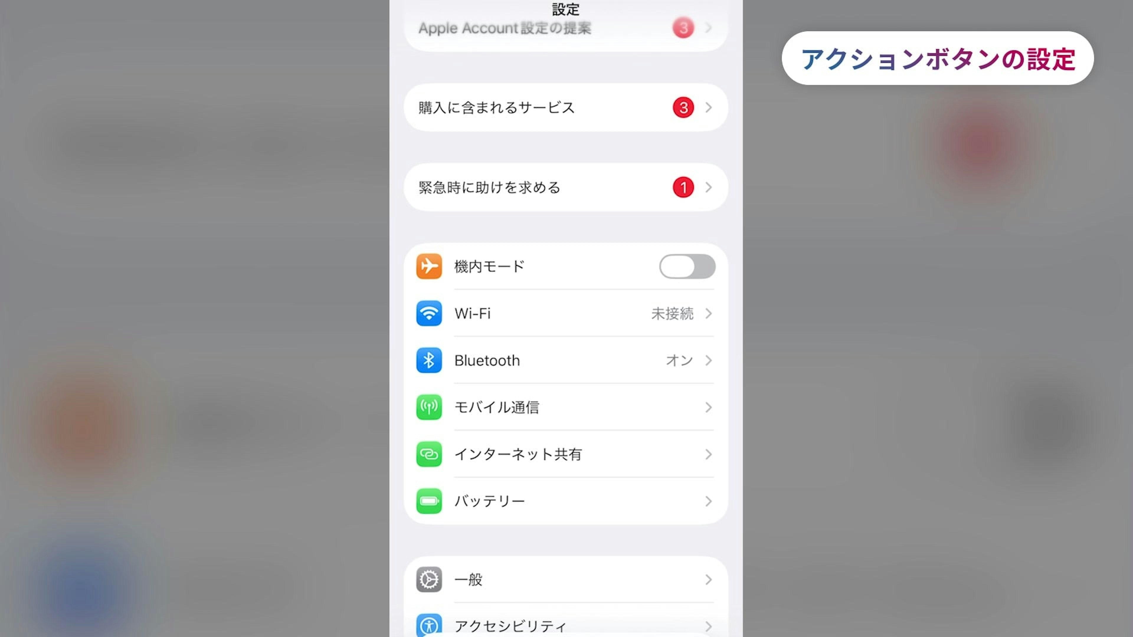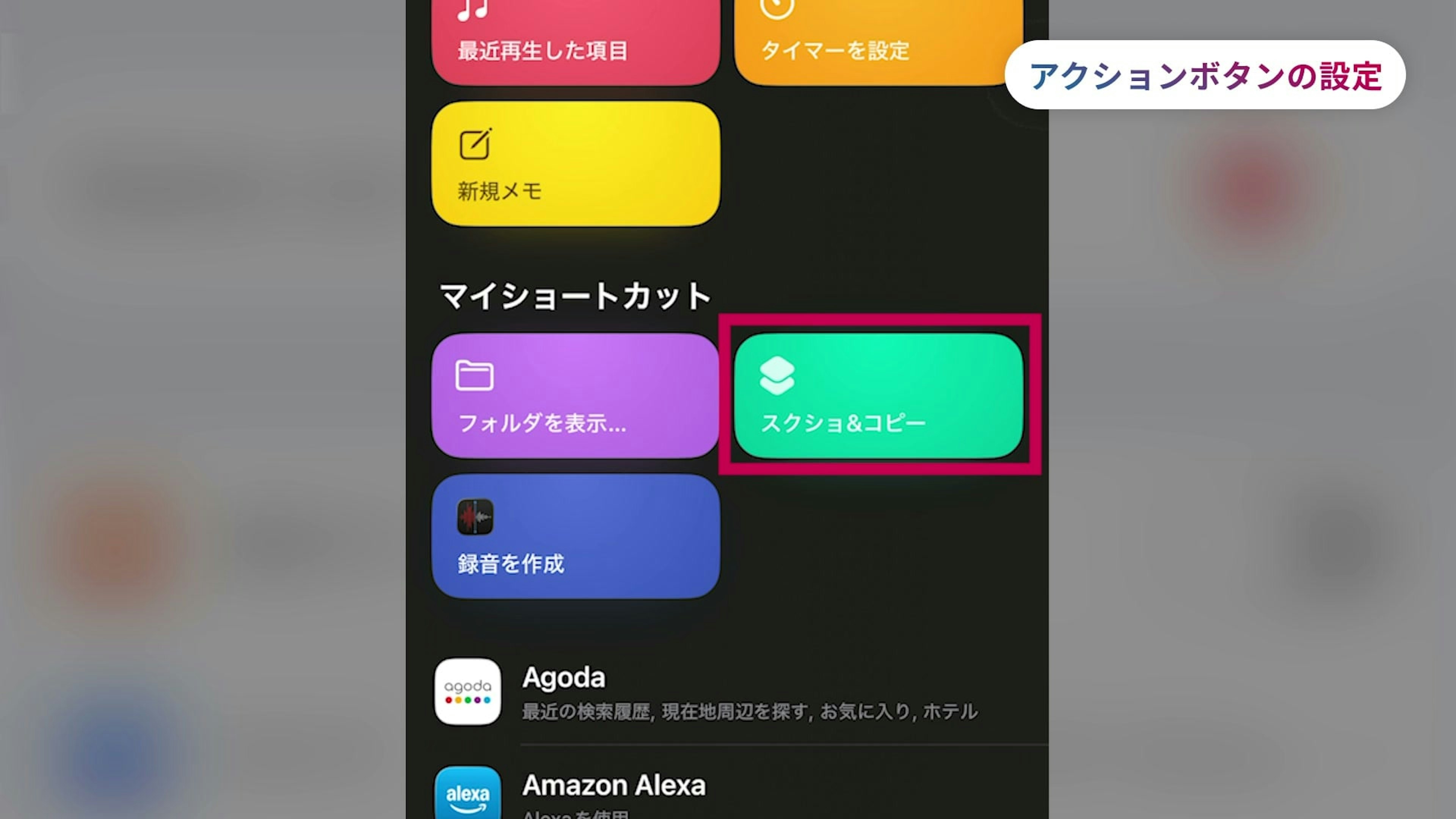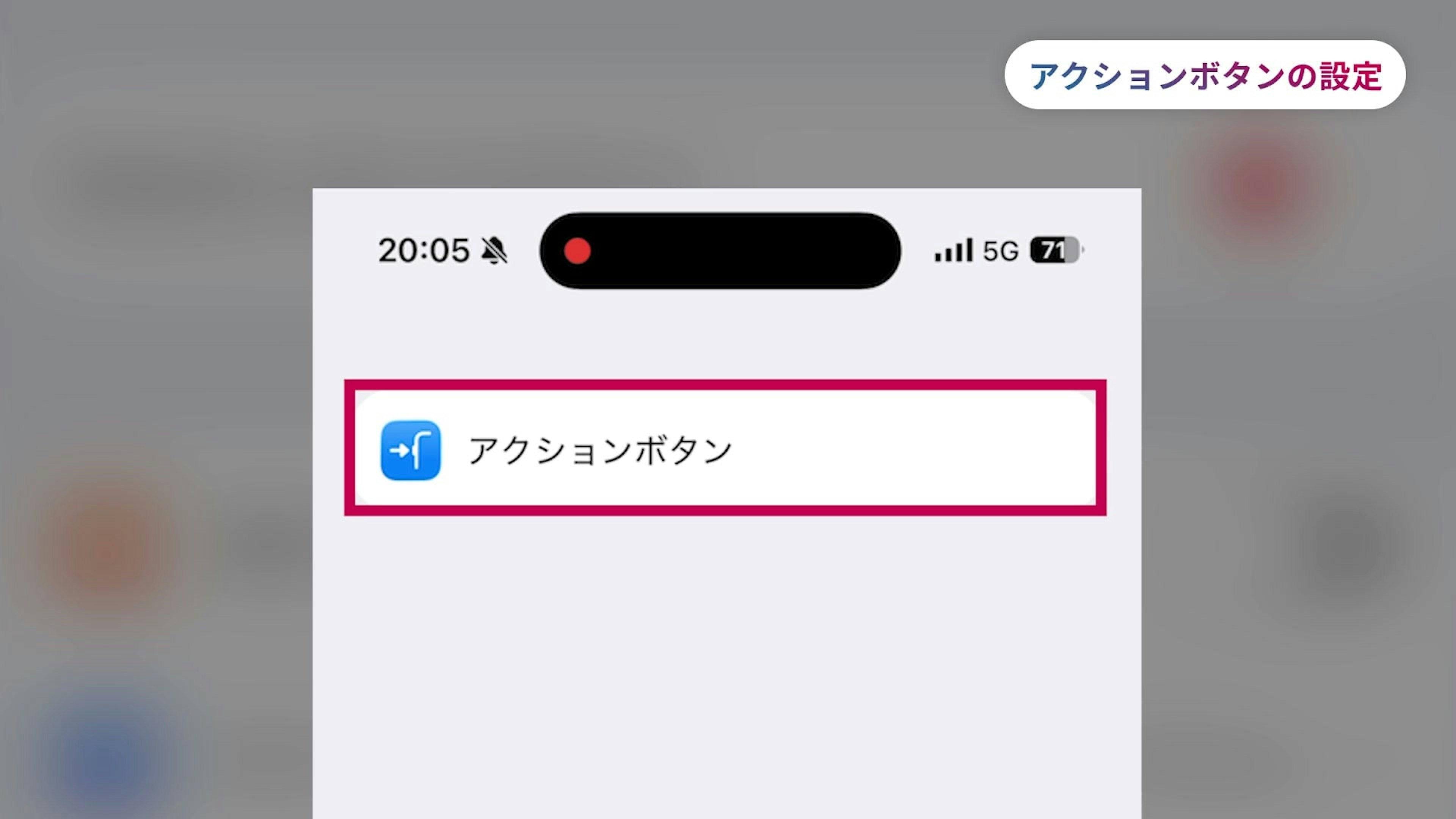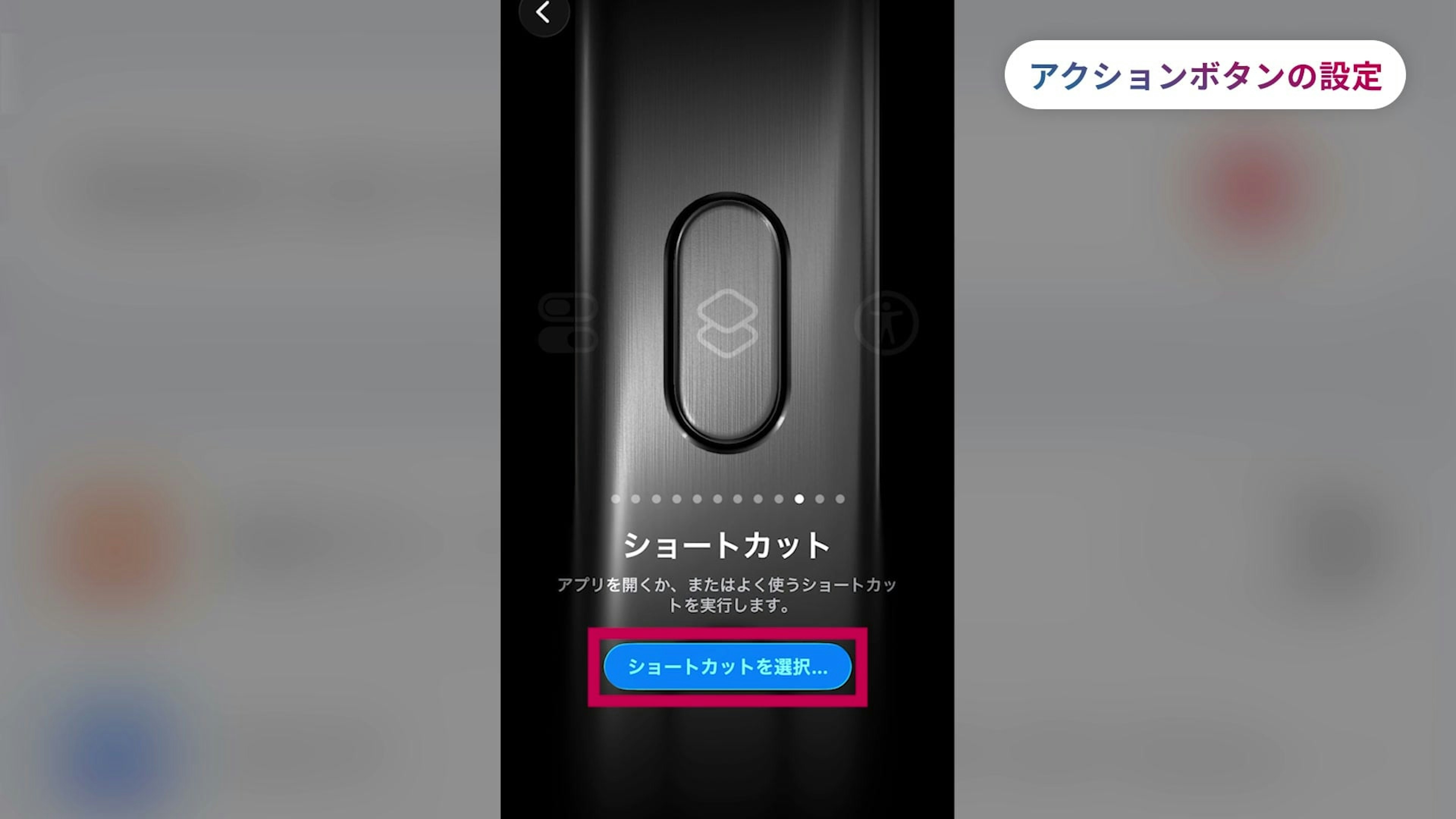 そして、このショートカットを起動するスイッチとして、iPhone 15 Pro以降なら「アクションボタン」の長押しを設定します。