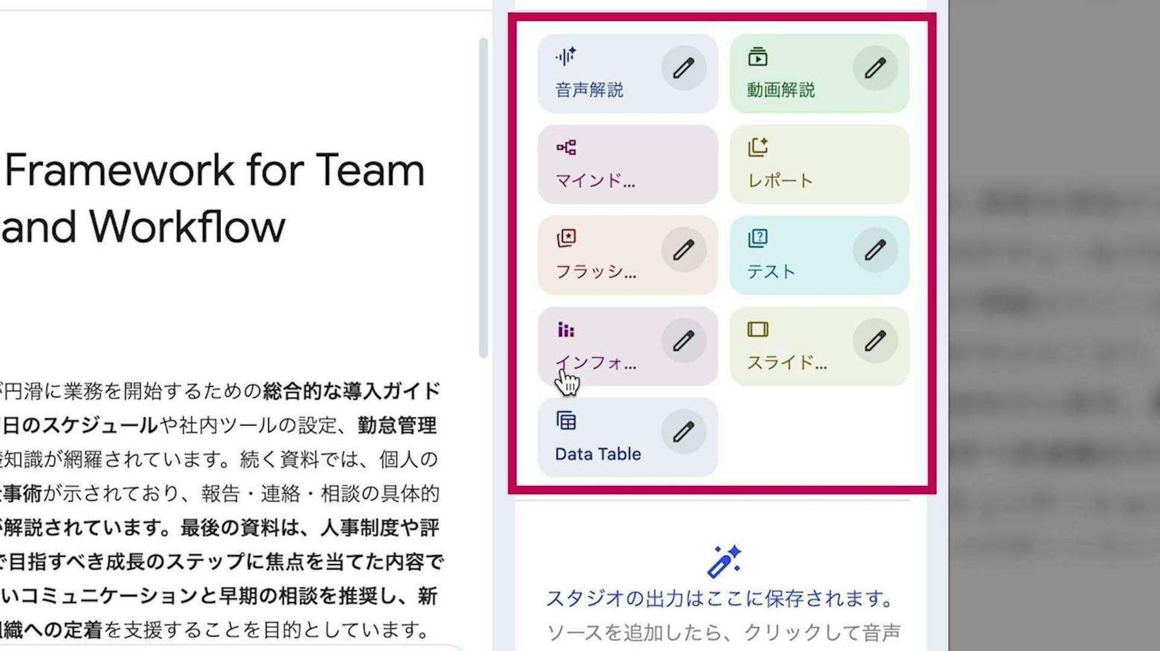 ええ、NotebookLMは、読み込んだ資料を様々な形式に変換するのが得意なのです。