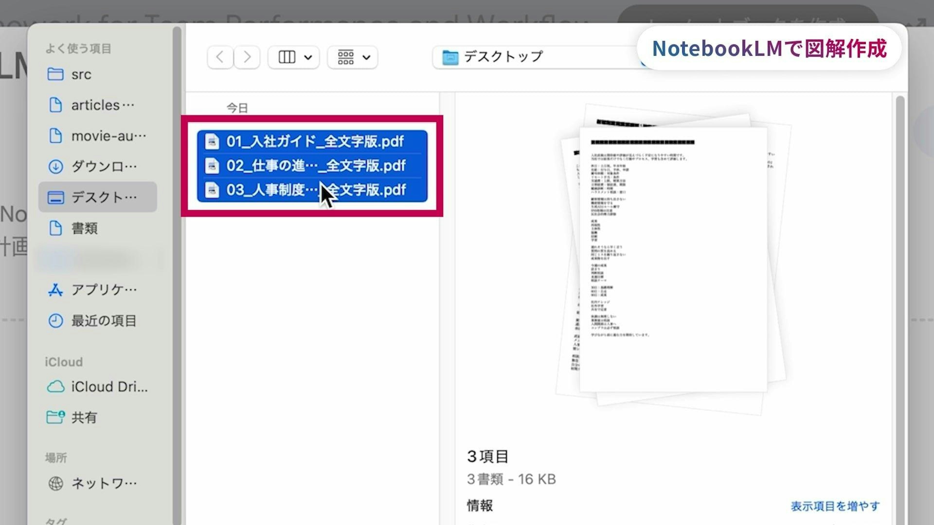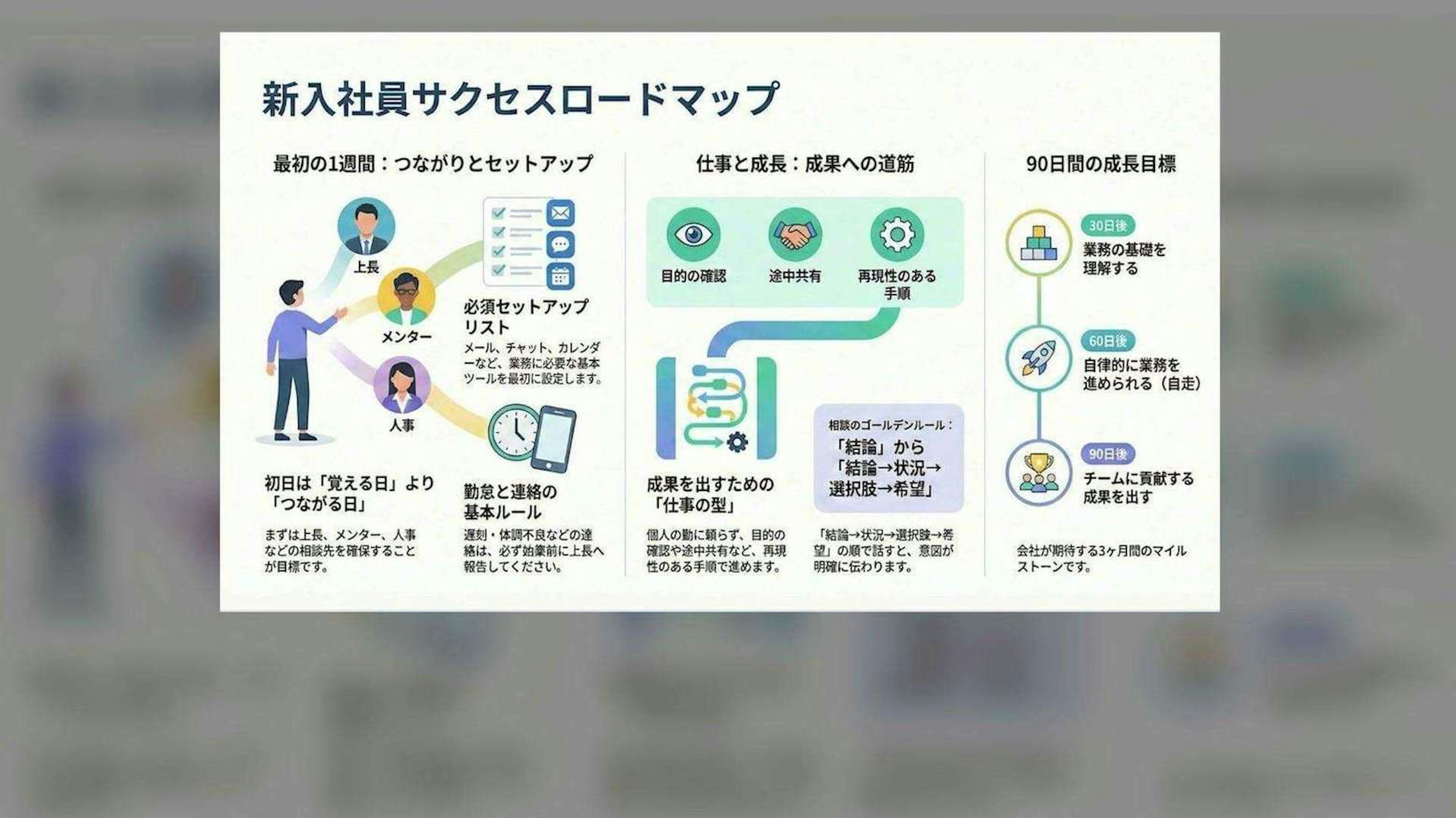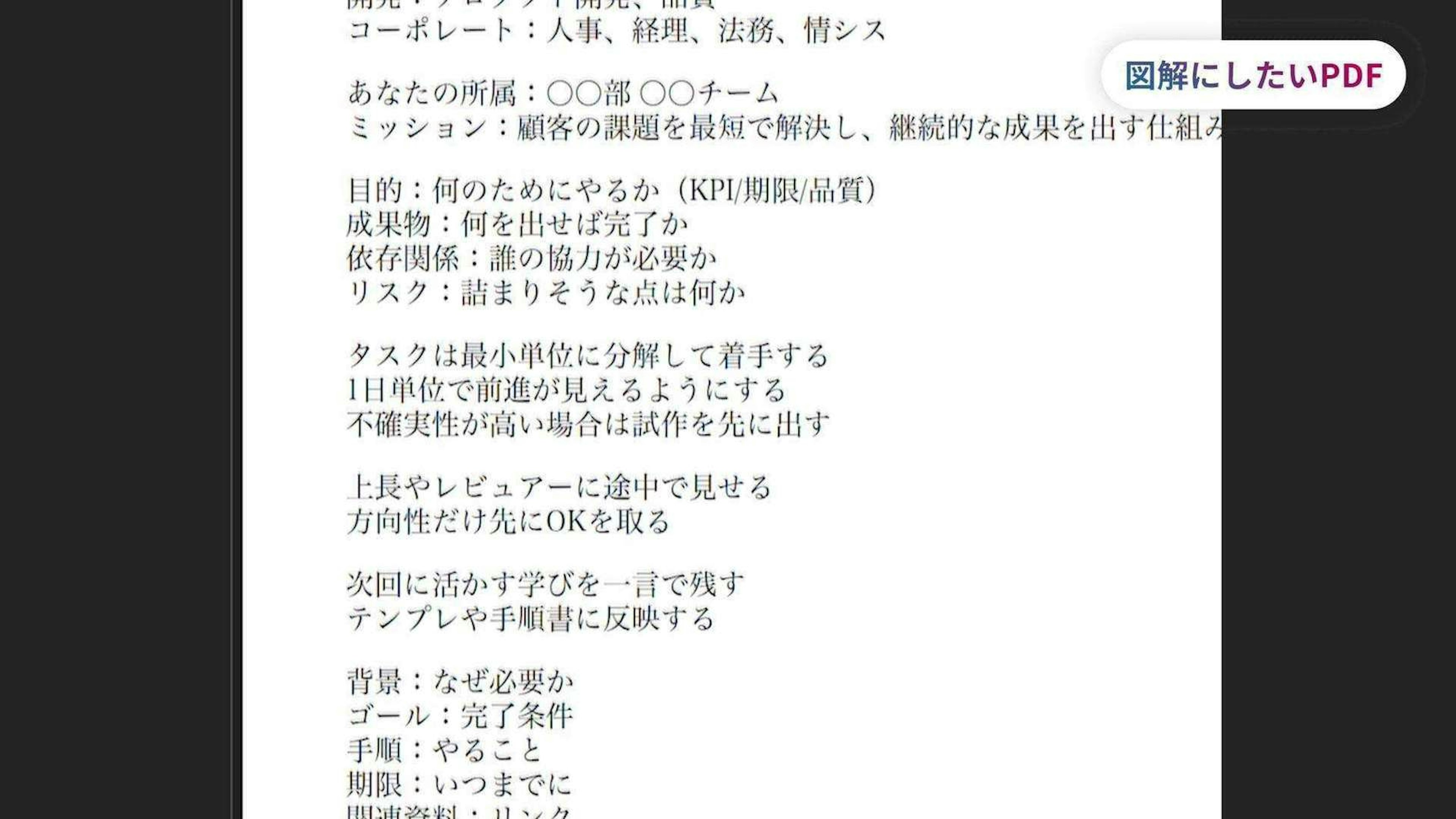 例えば社内の「新入社員の入社資料」のような、長くて文字ばかりのPDF資料を図解化してみましょう。