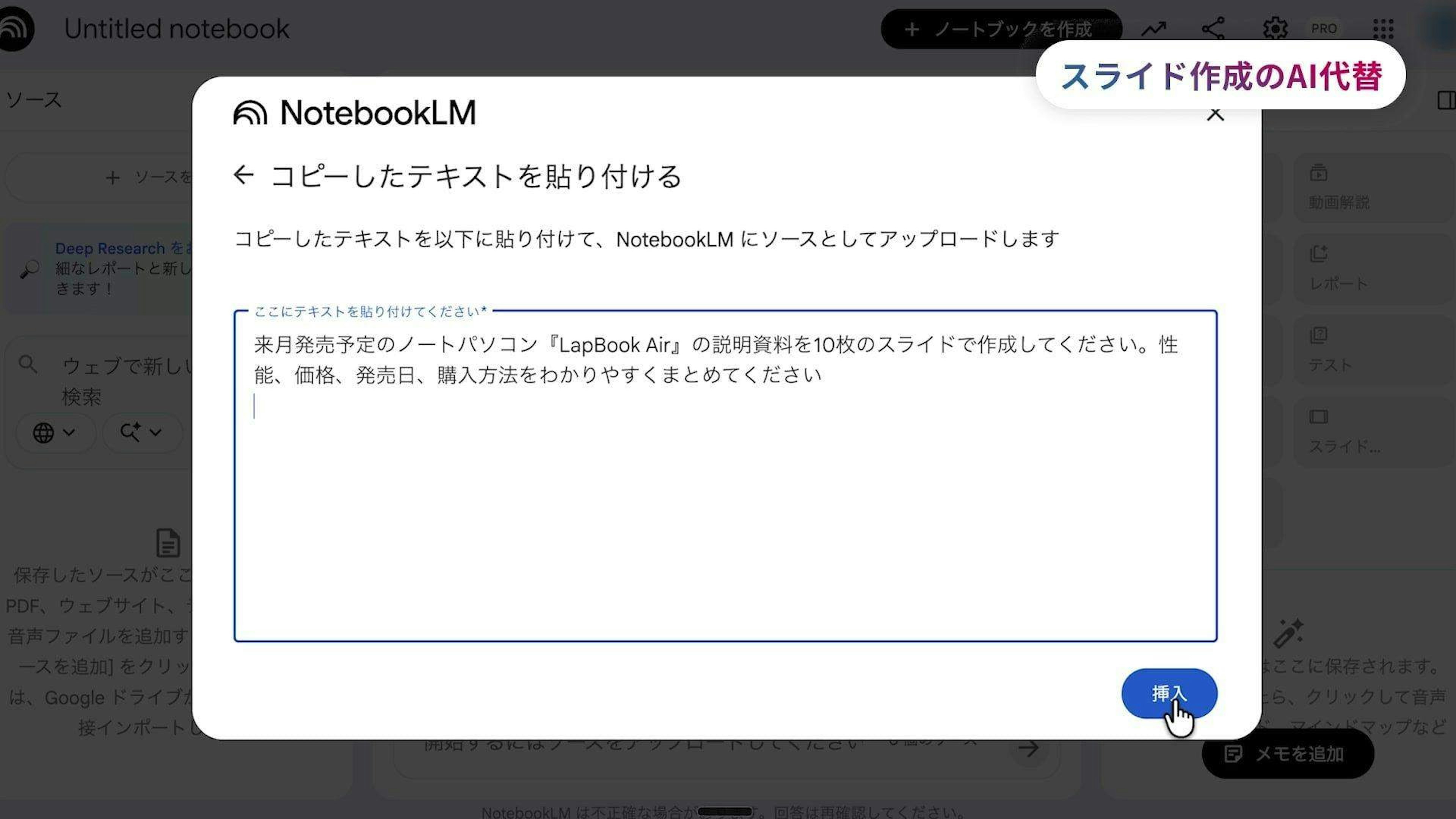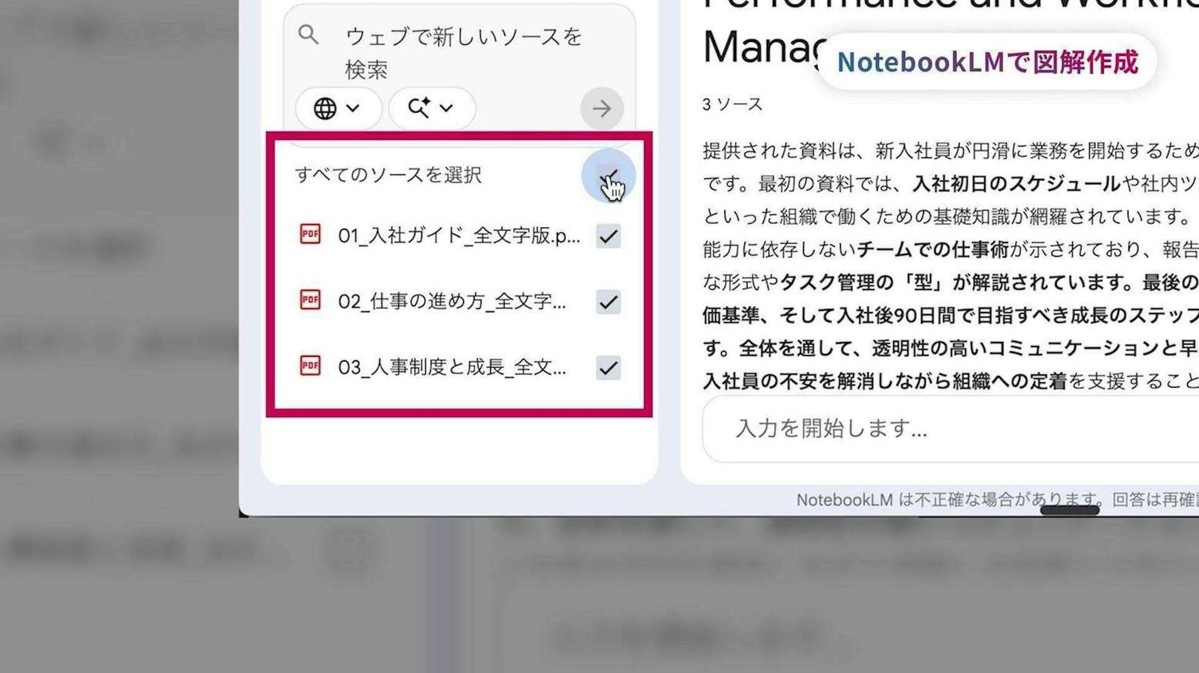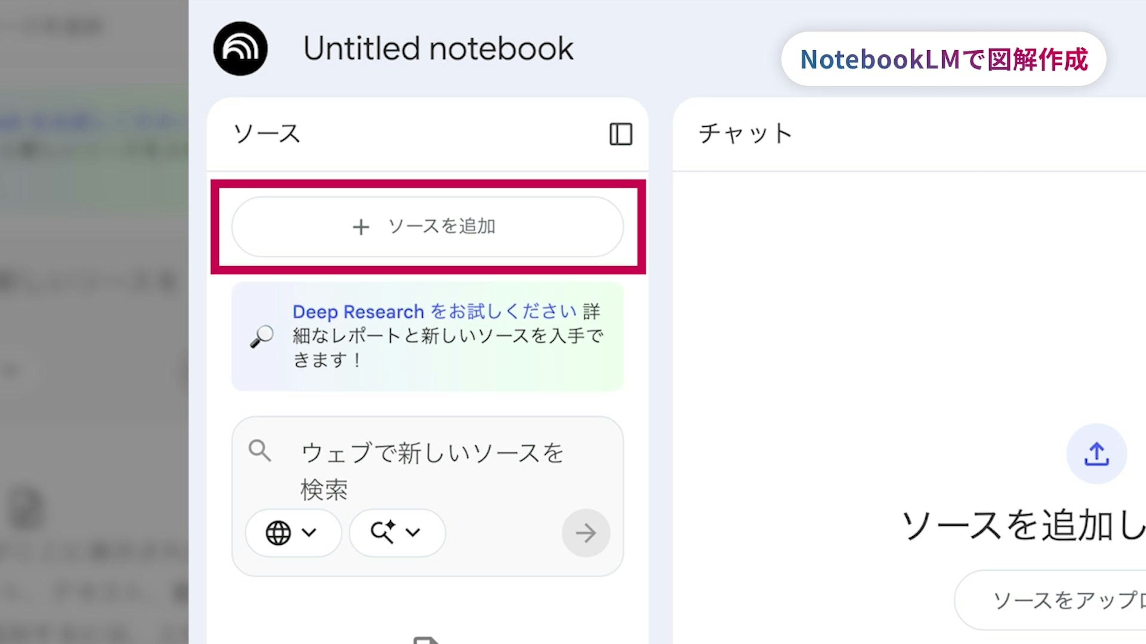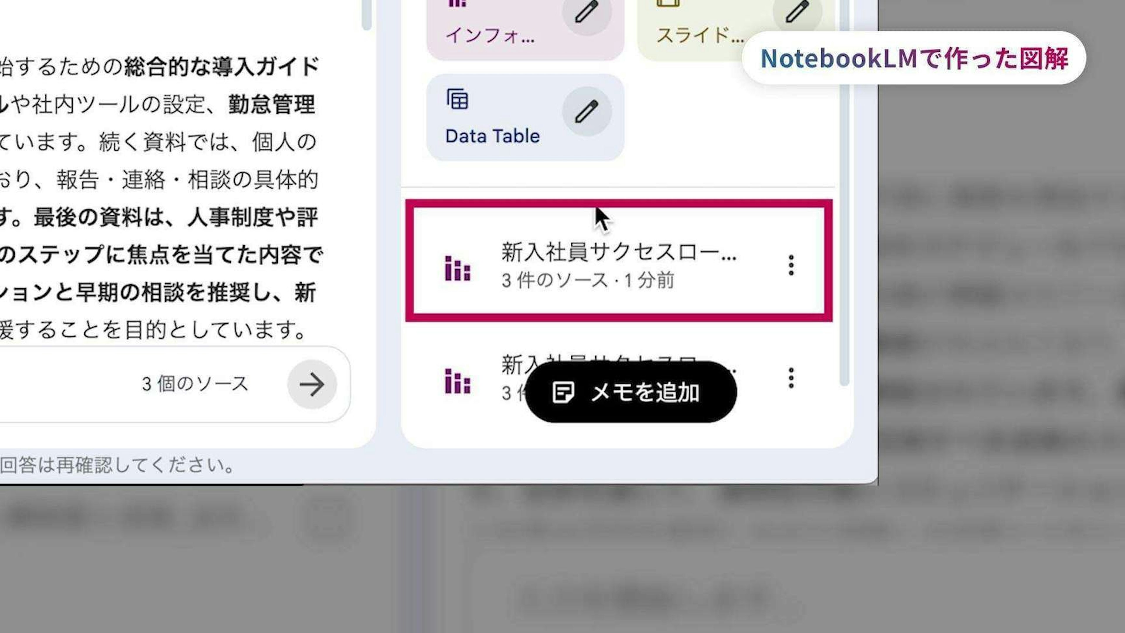 ここで先ほど紹介した「NotebookLM」を使ってみましょう。