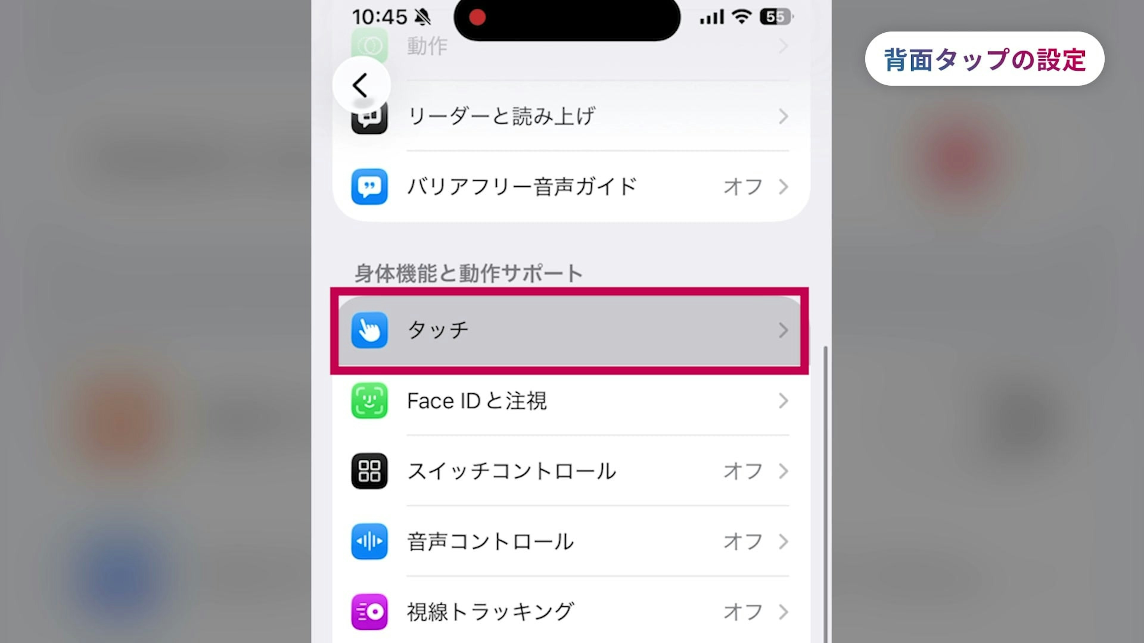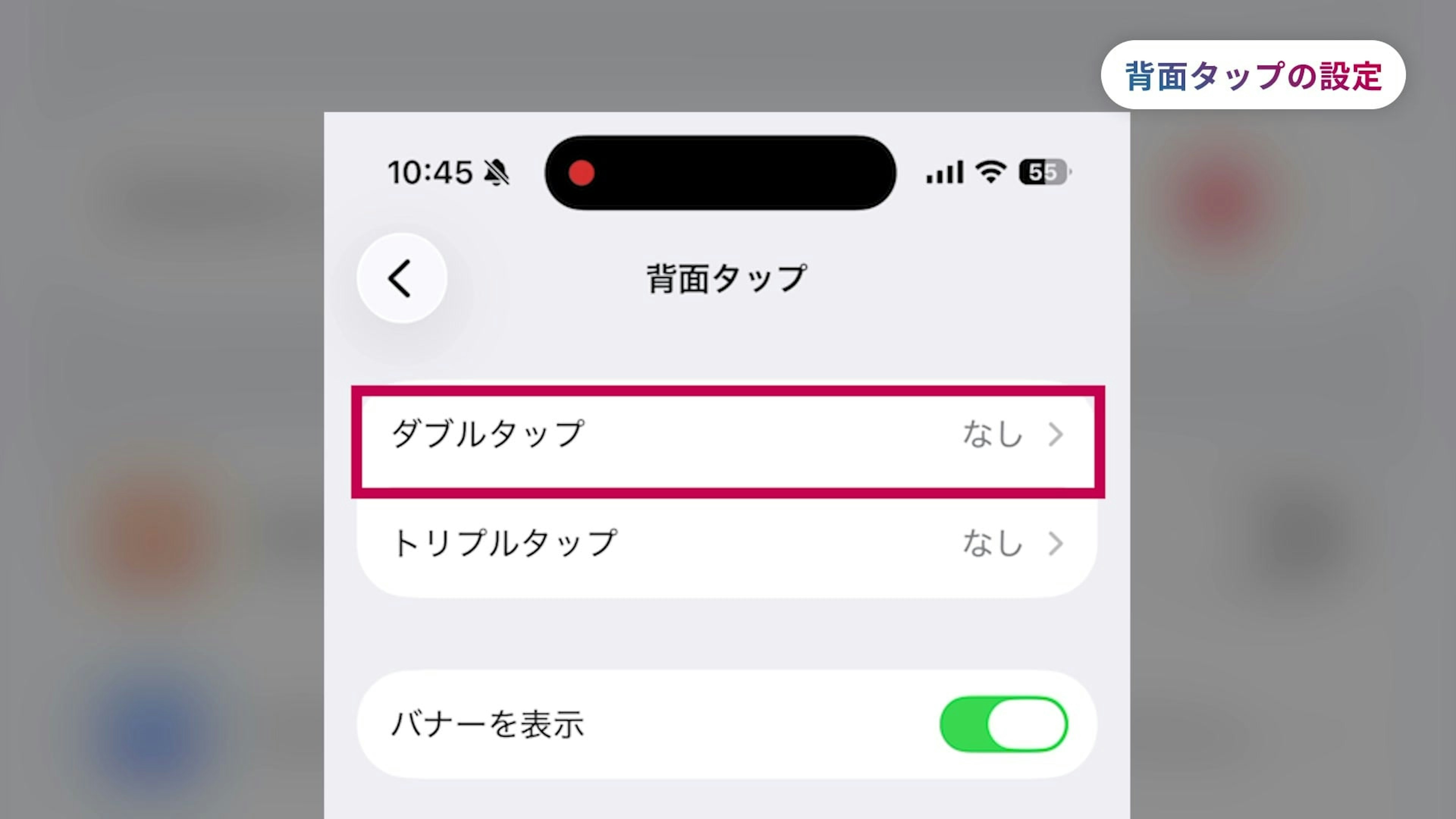 iPhoneの設定にある「アクセシビリティ」から「タッチ」を選び、一番下の「背面タップ」を選択し、「ダブルタップ」を選択。