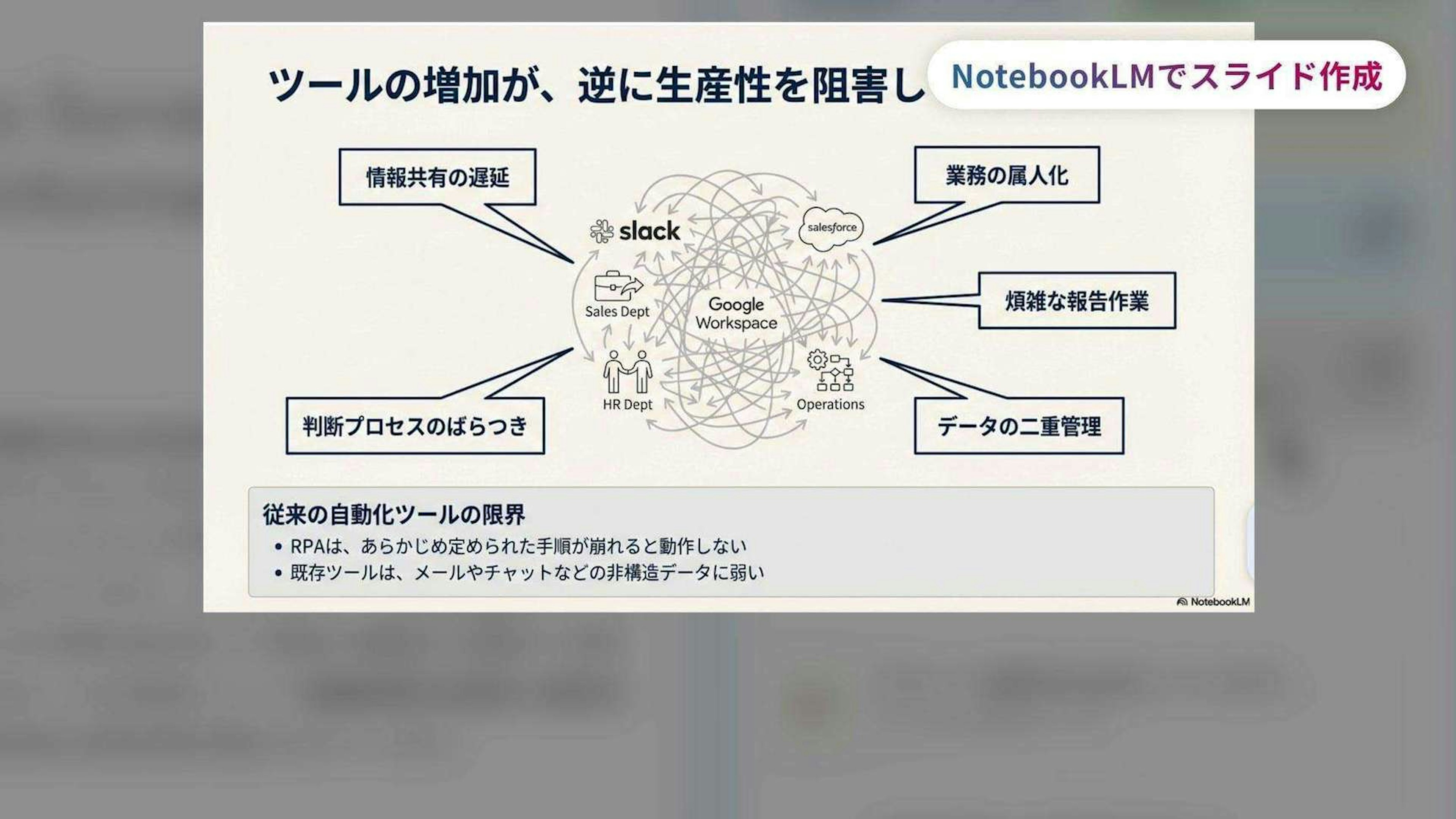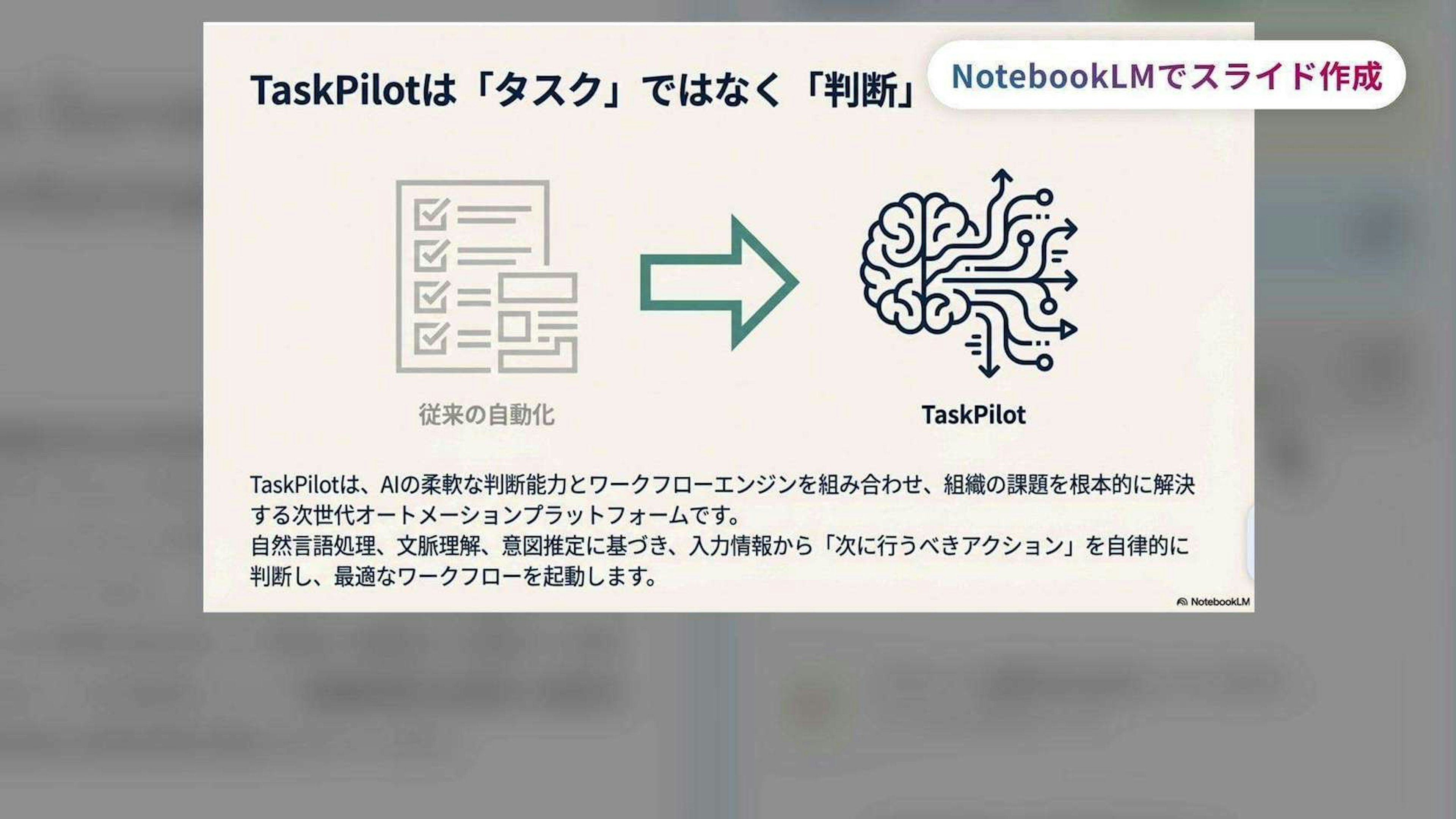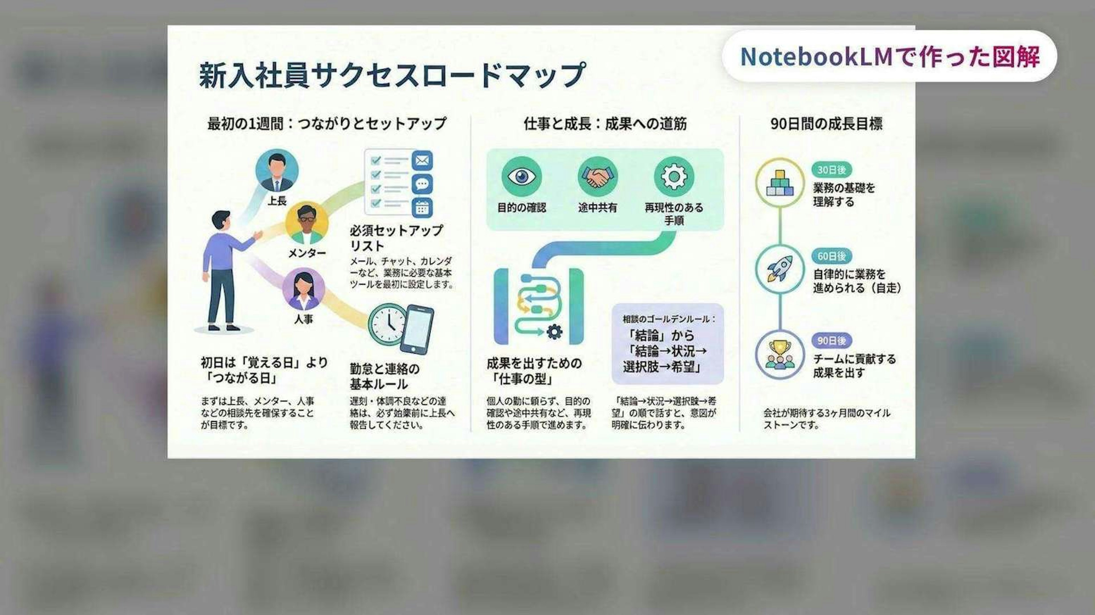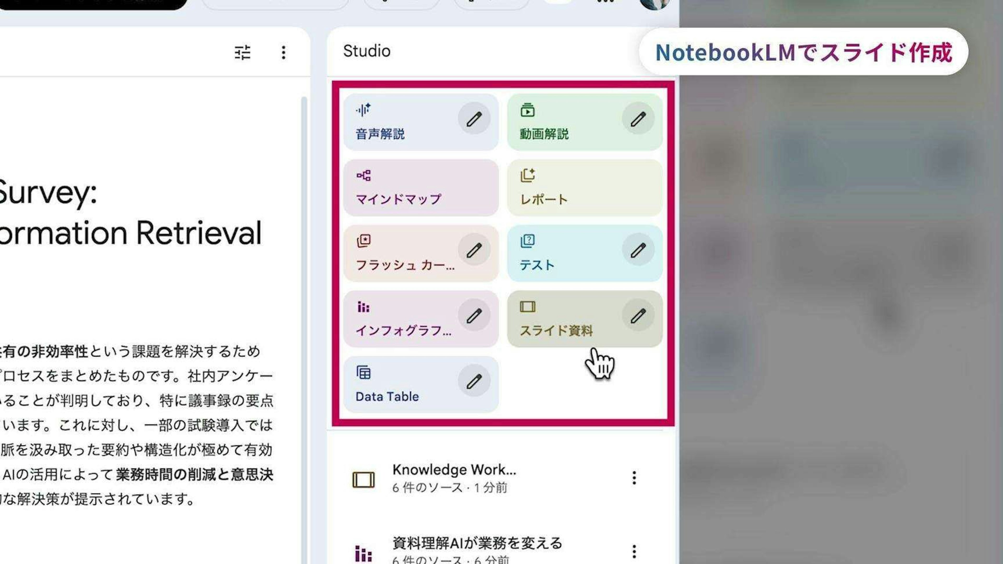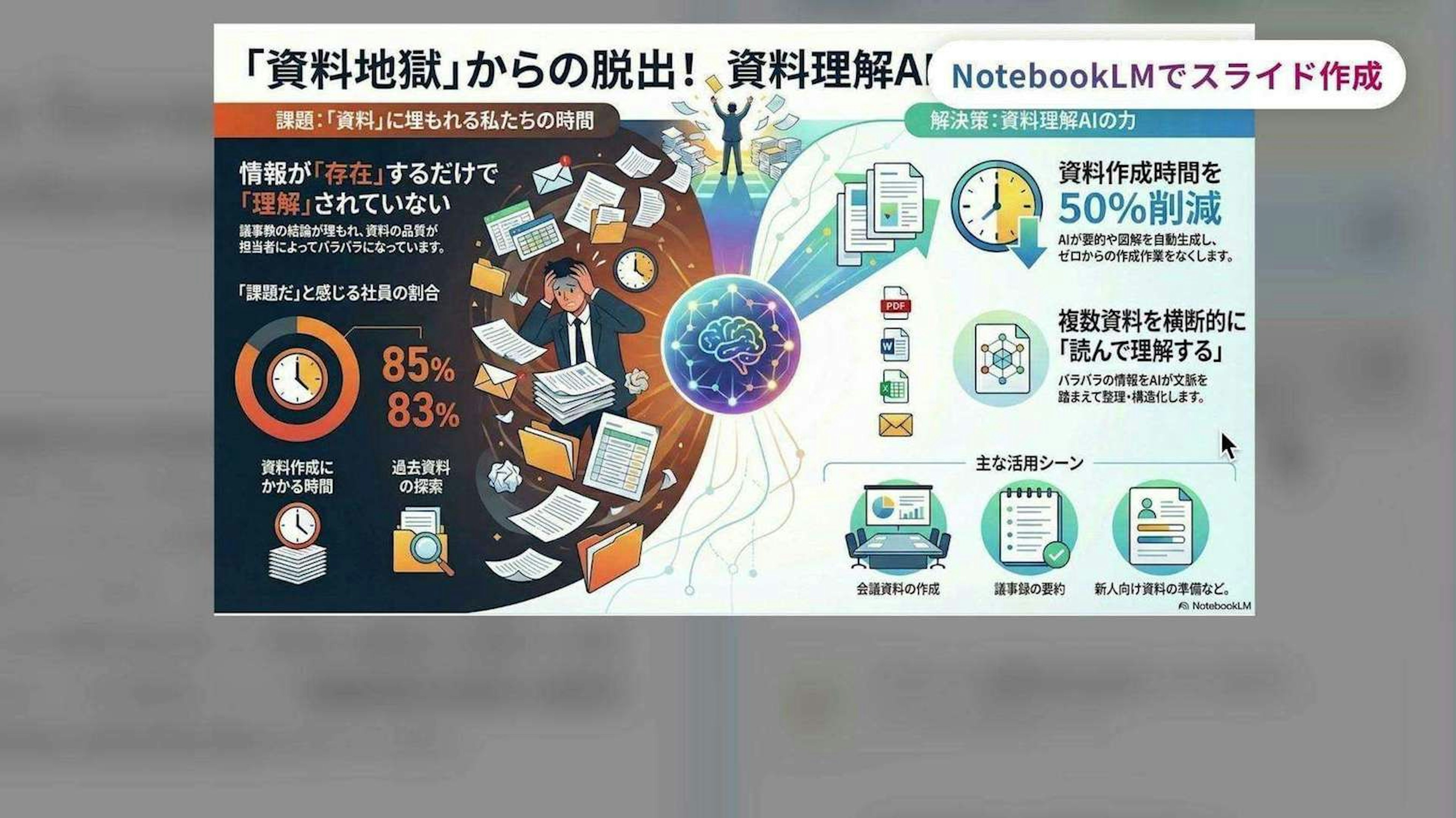 ええ、例えばその筆頭である「NotebookLM」というツールを使えば、資料を読み込んで、スライドや図解を一瞬で生成できます。