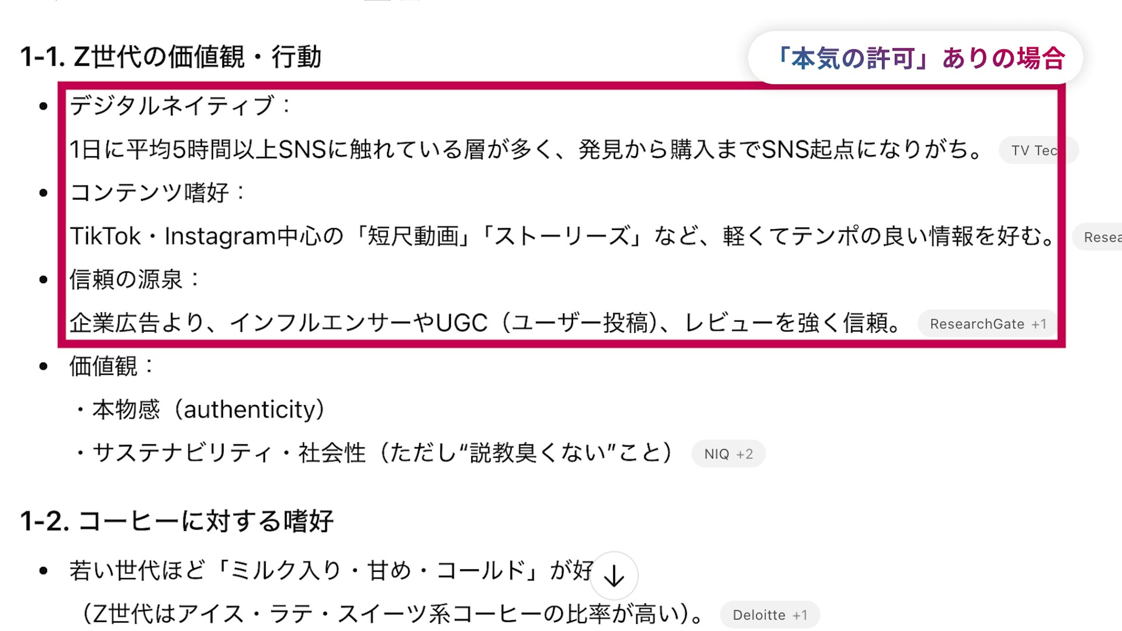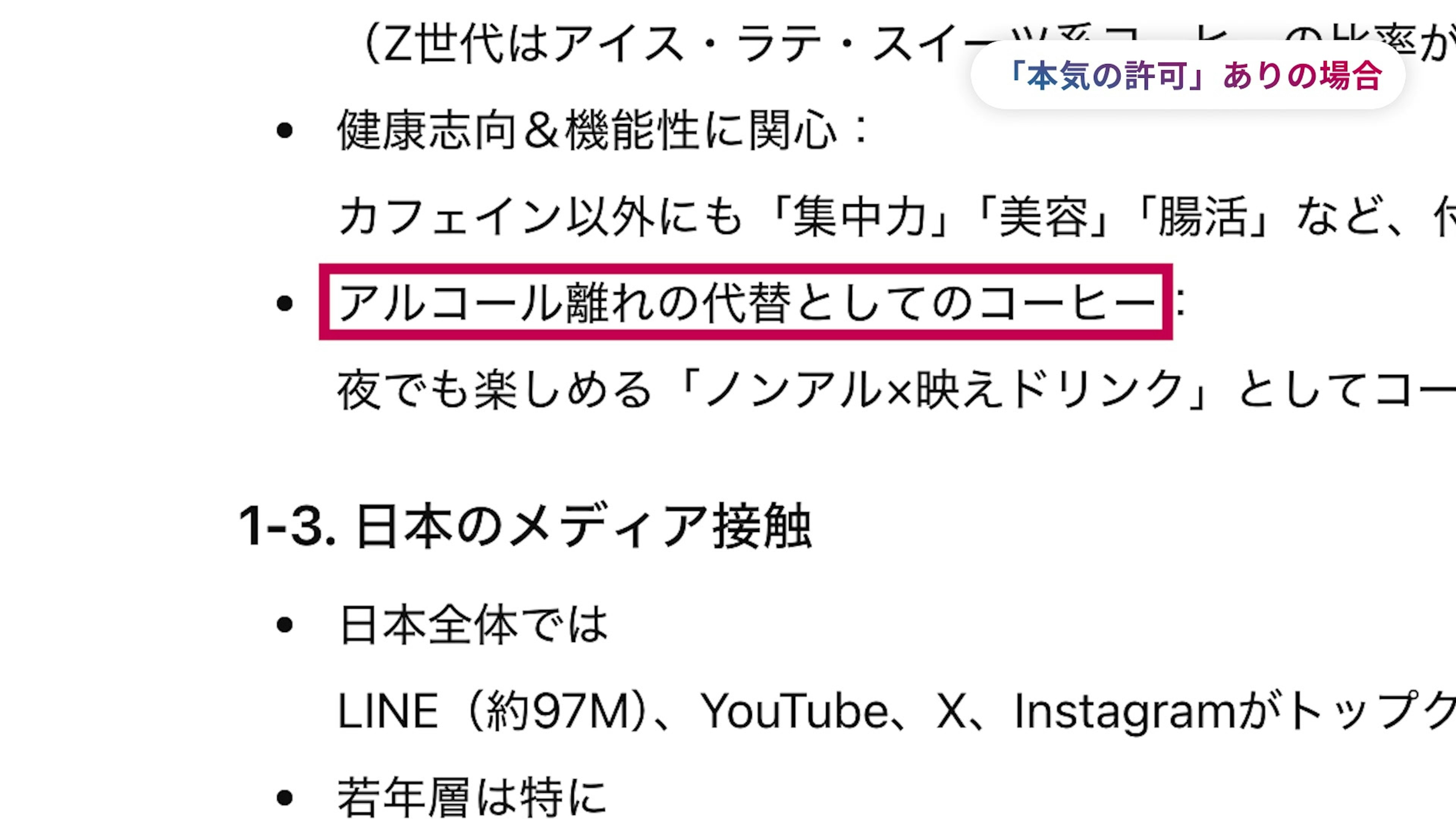 さっきの案は「映えればいいんでしょ?」みたいな浅さでしたけど、こっちはZ世代は甘くてクリーミーなのが好きとか、アルコール離れの代替とかまで分析して提案してきてます!