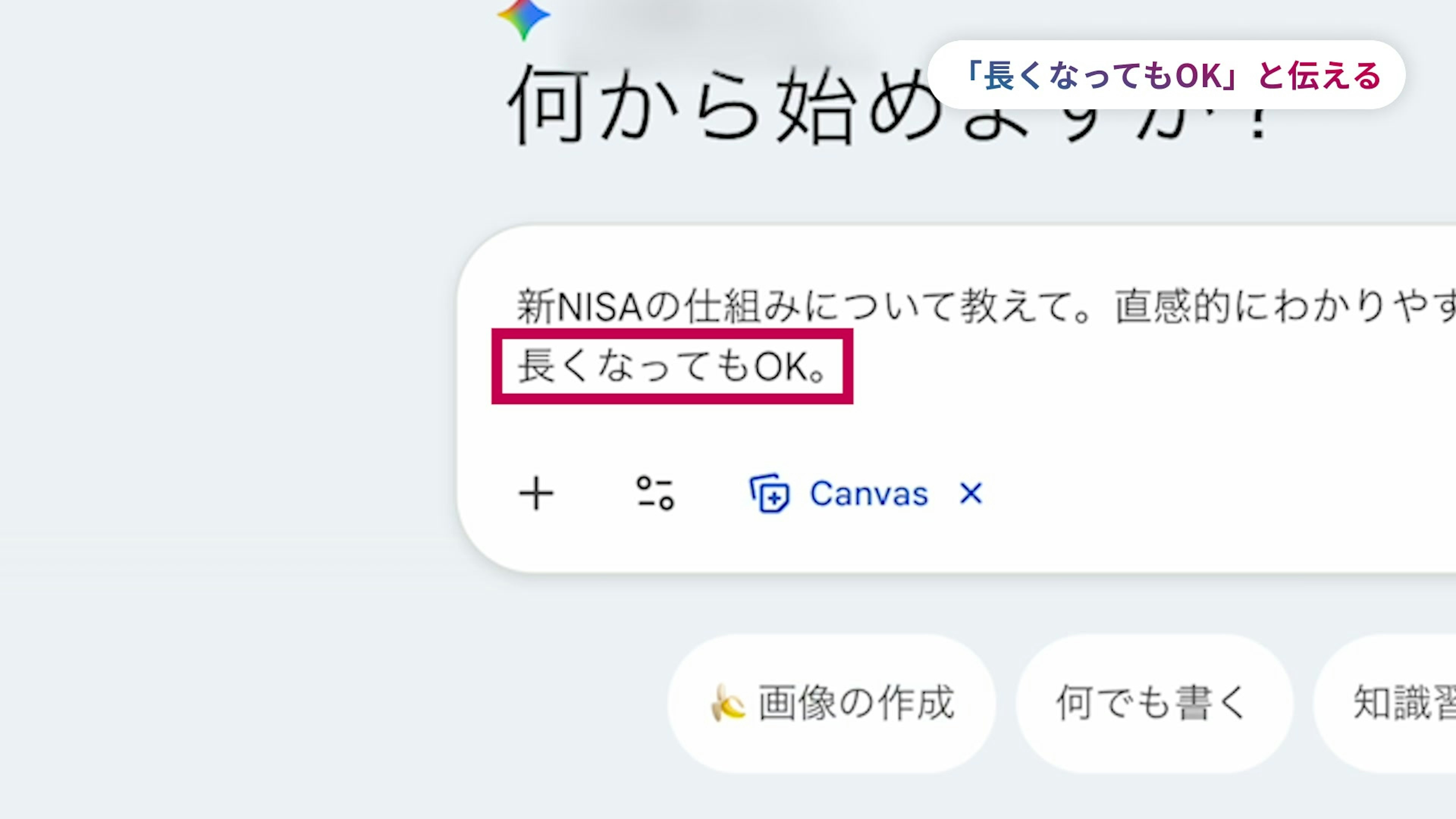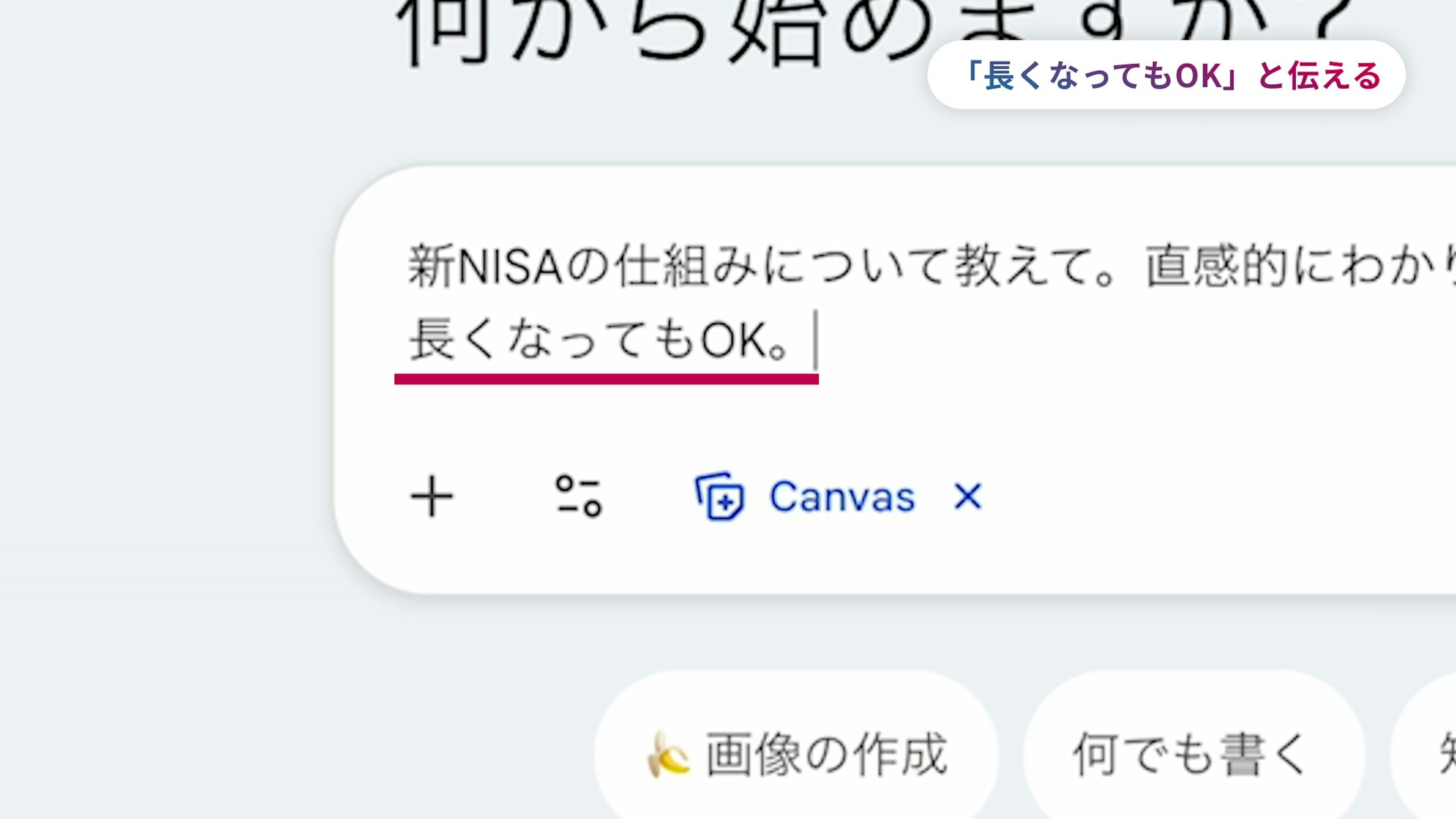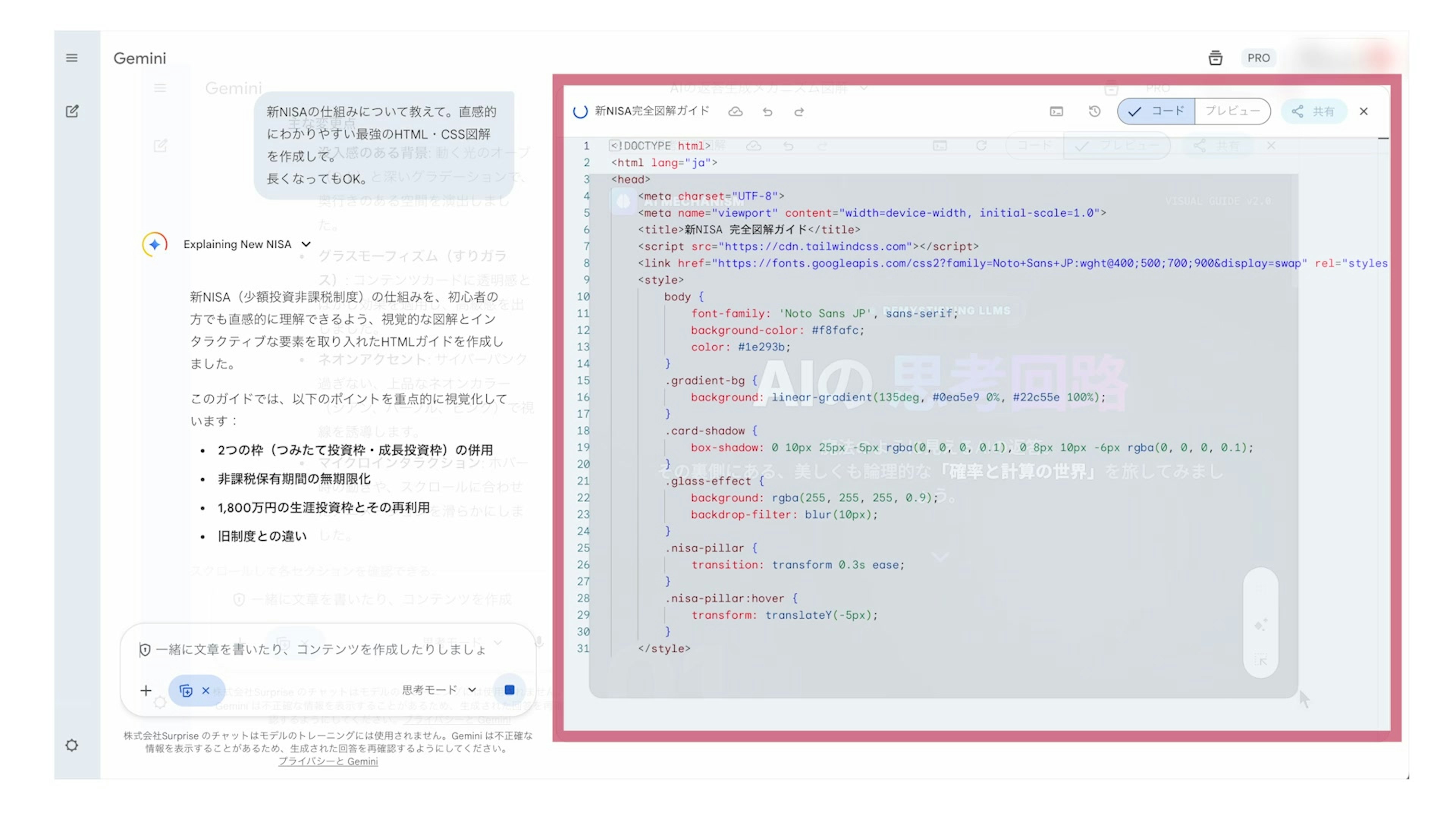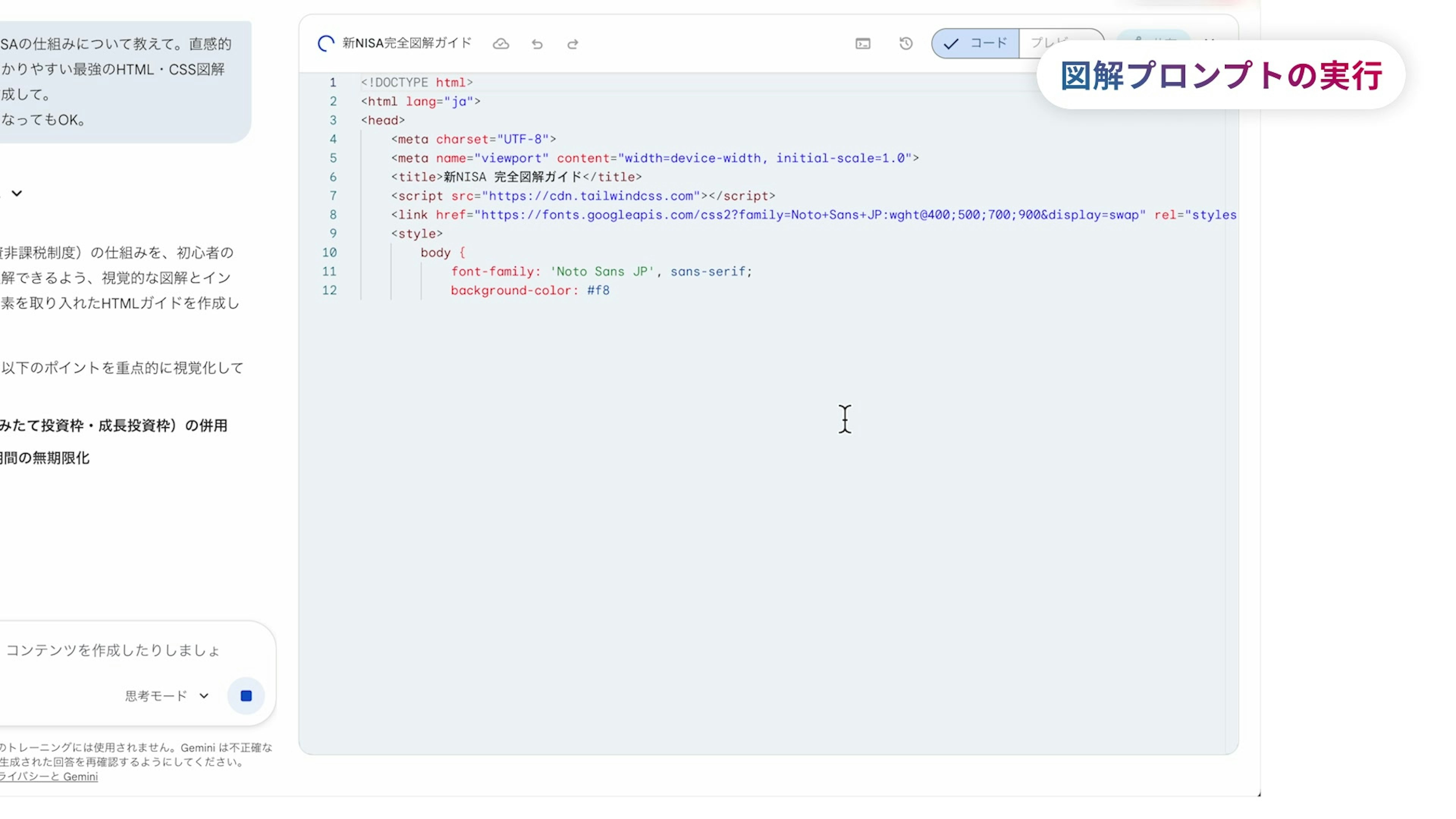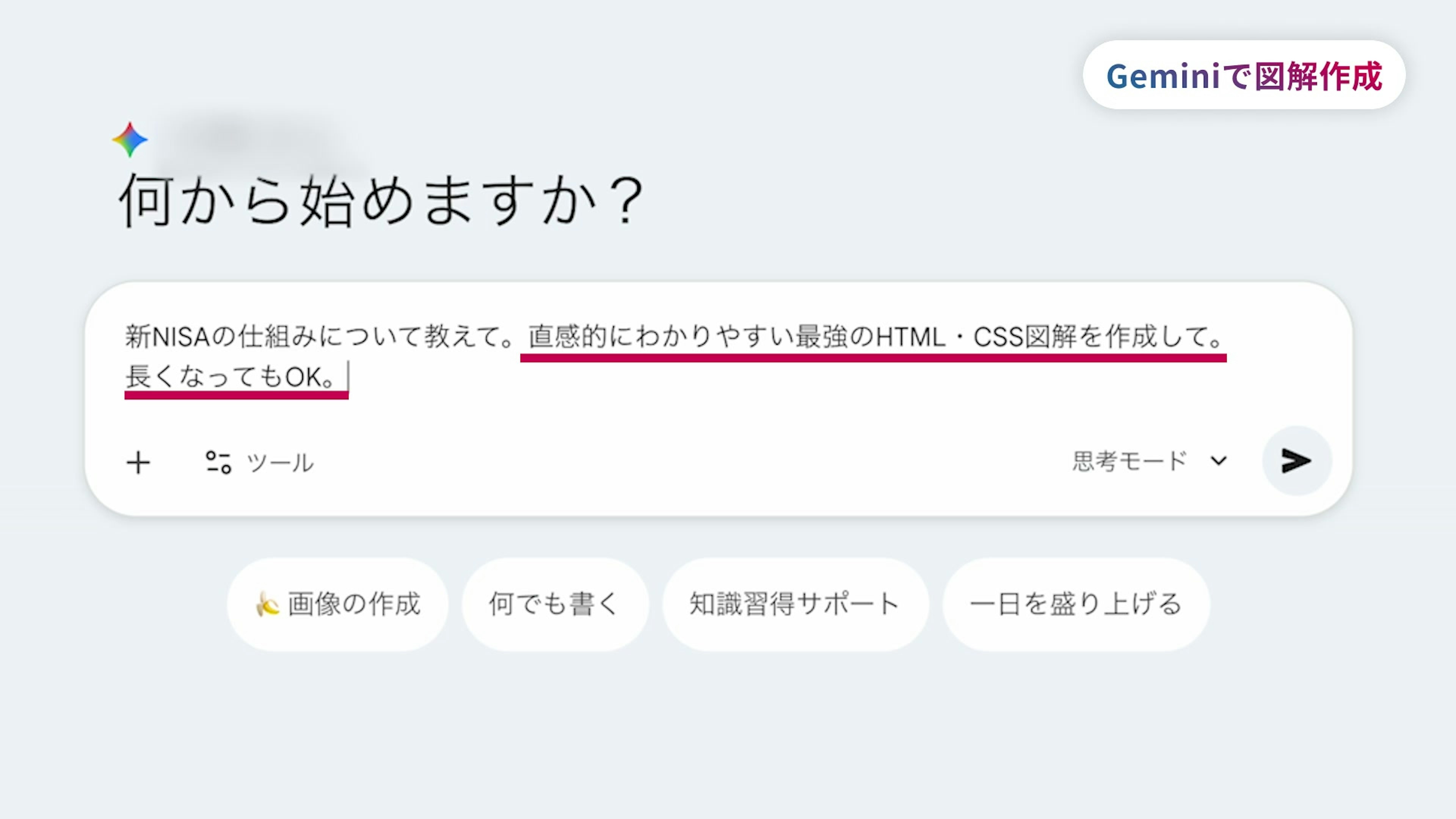 AIのチャット欄に「新NISAの仕組みについて教えて」と入力し、その後にこの「最強の図解プロンプト」を入力します。