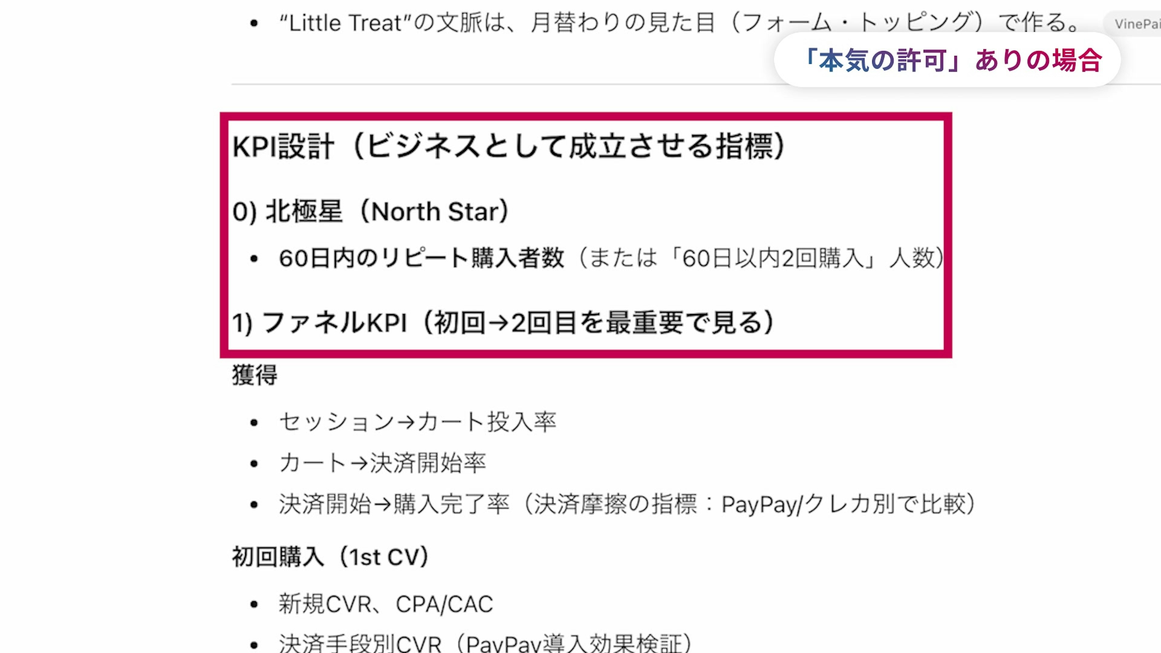 ログイン方法や決済手段まで言及し、KPI、つまり目標数値の設計では、「初回購入から2回目購入までの確率」など、ビジネスとして成立させるための指標まで網羅されています。