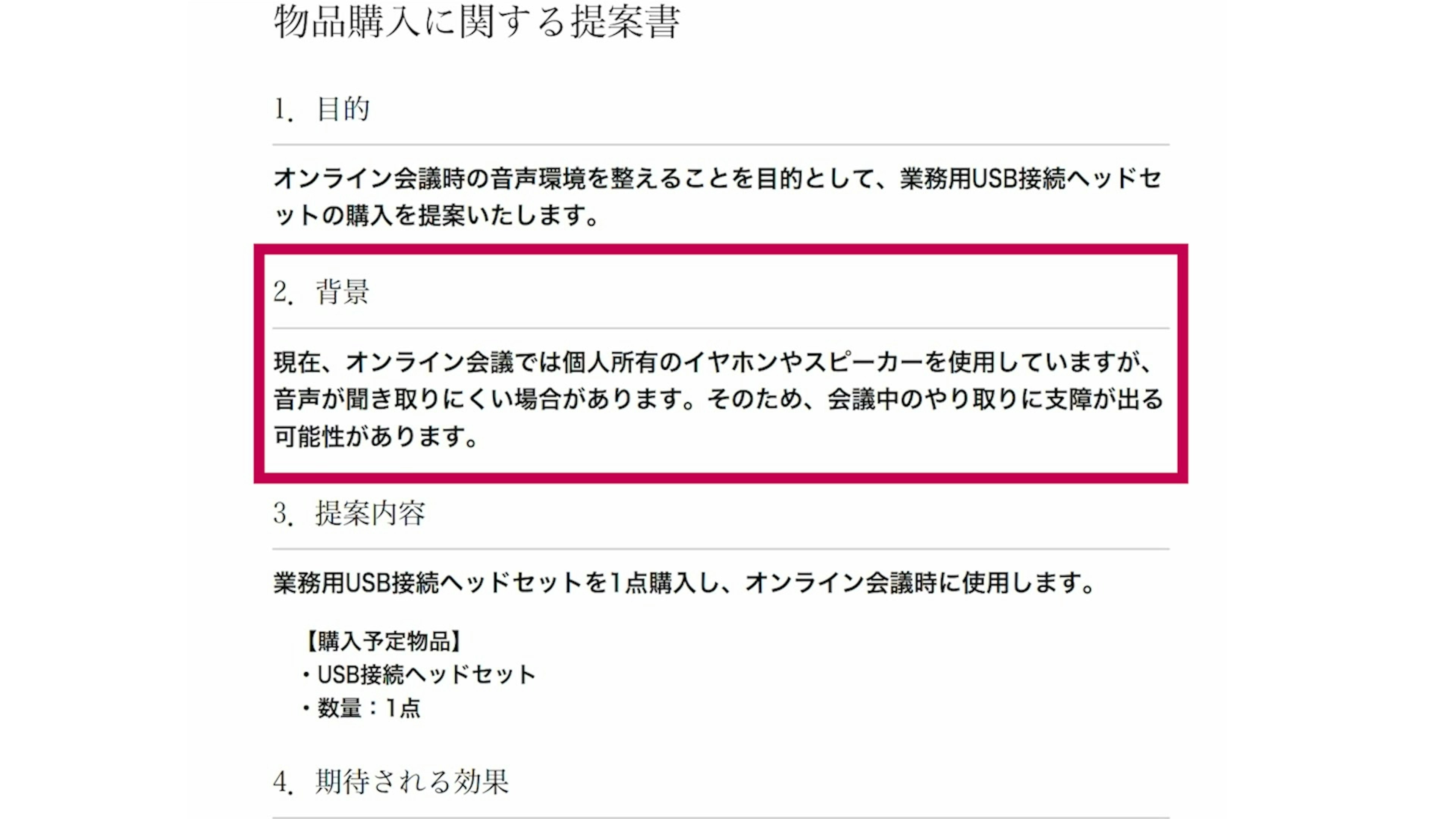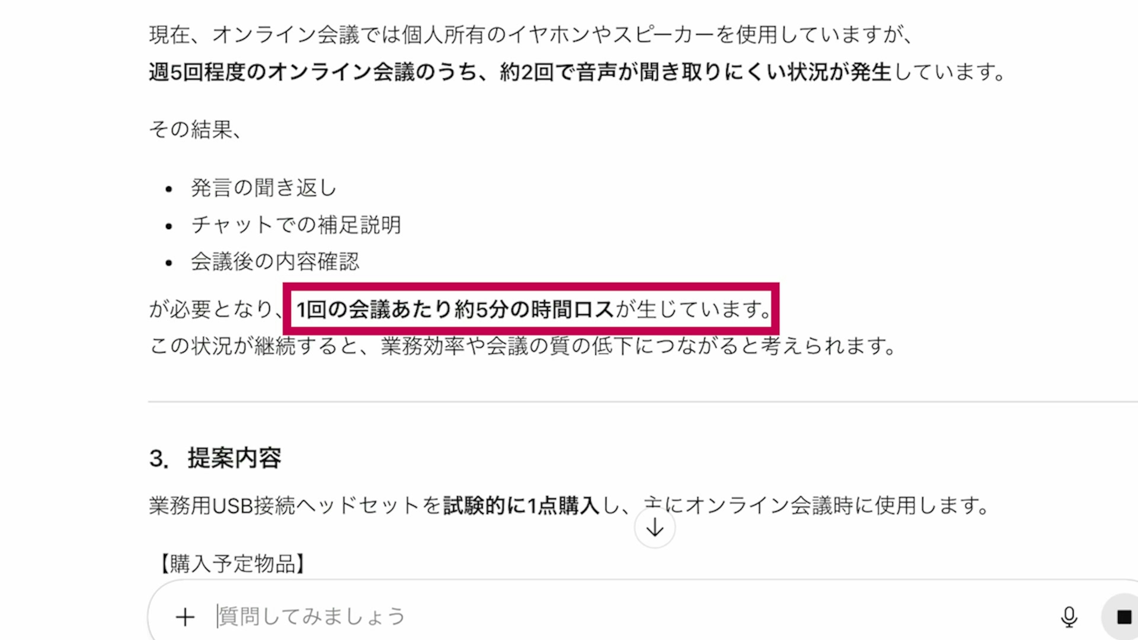 最初は「会議に支障が出る」くらい抽象的だった物品購入の背景が、「1回あたり5分のロス」みたいに具体的になりました!