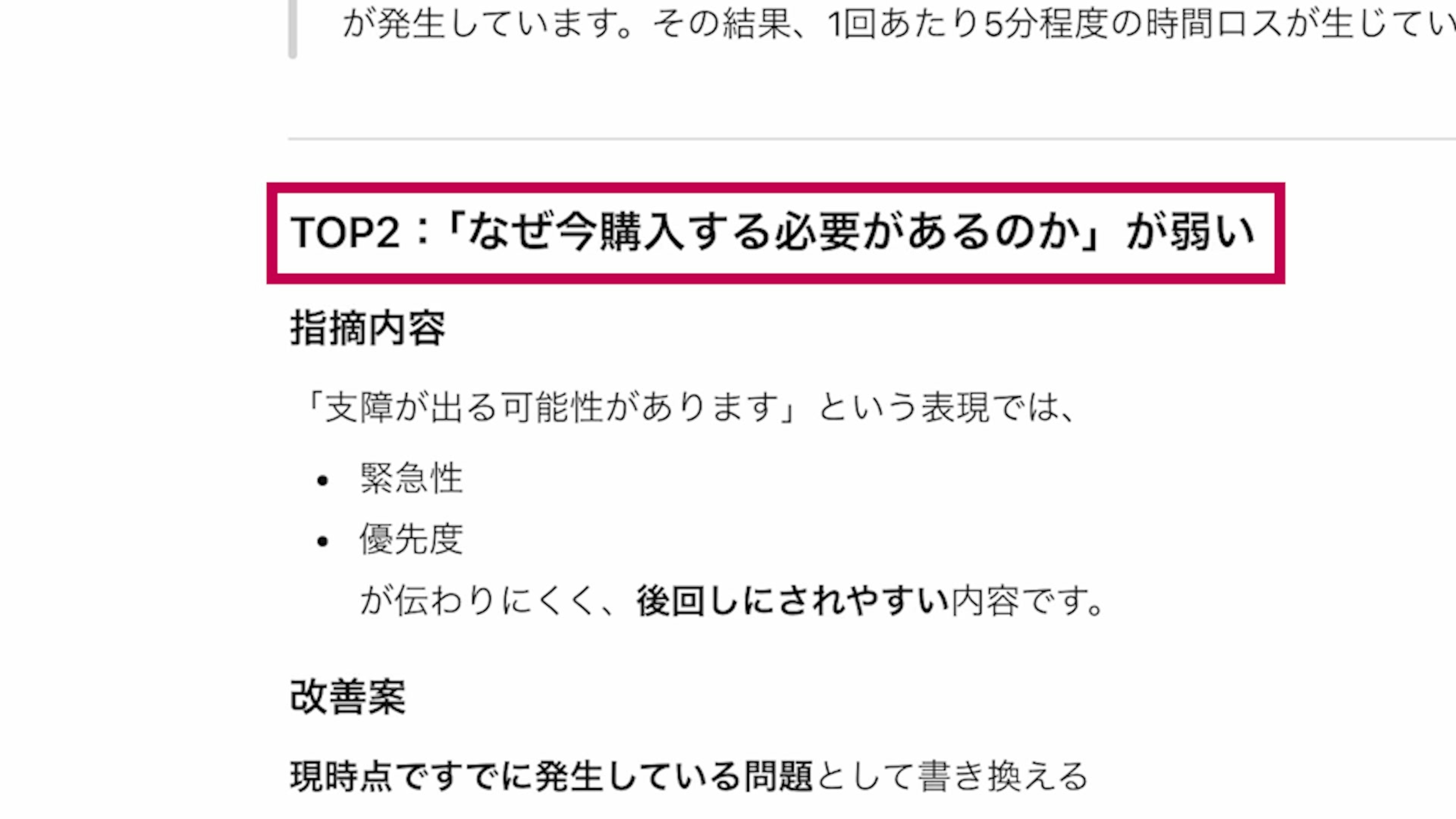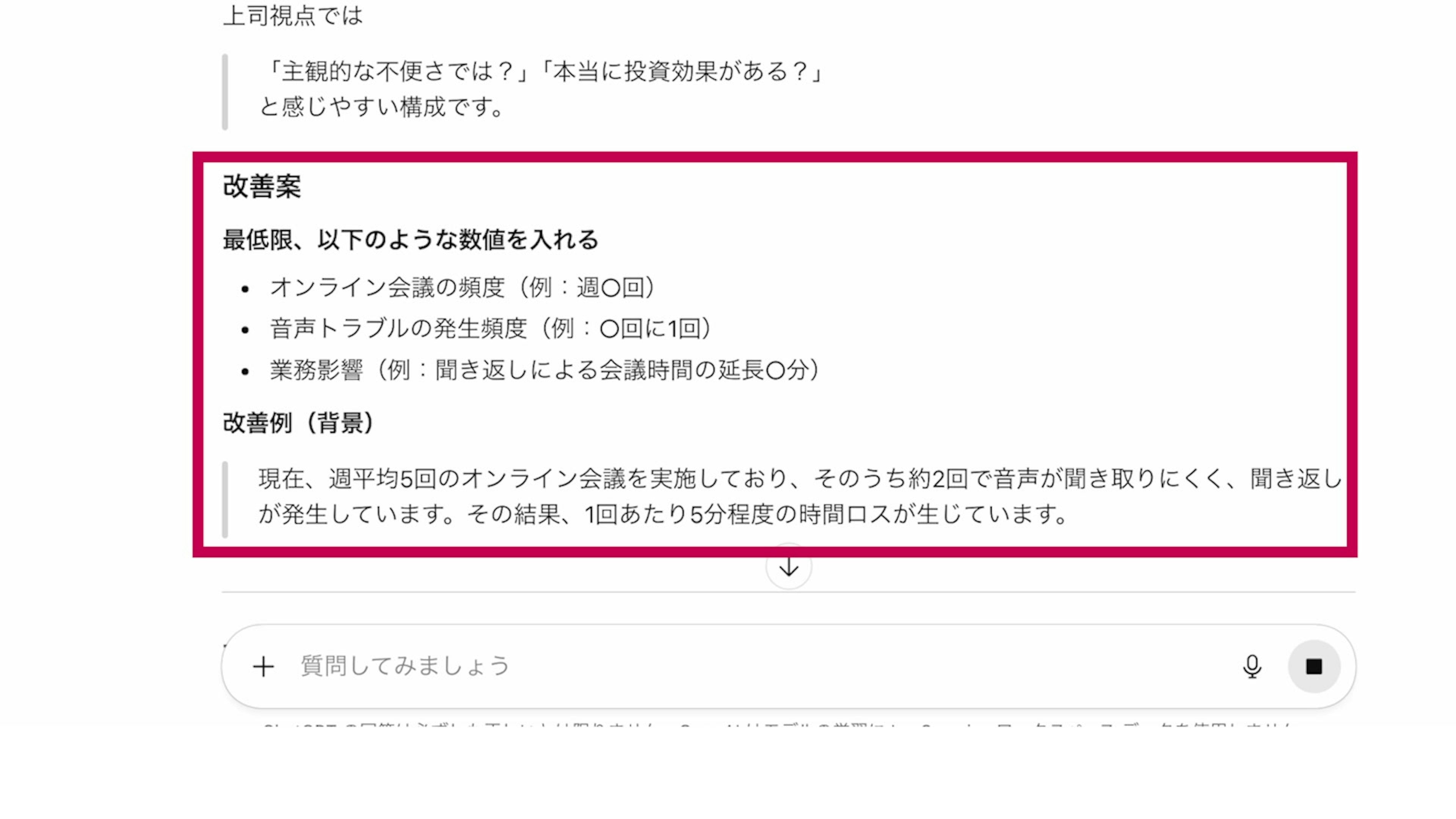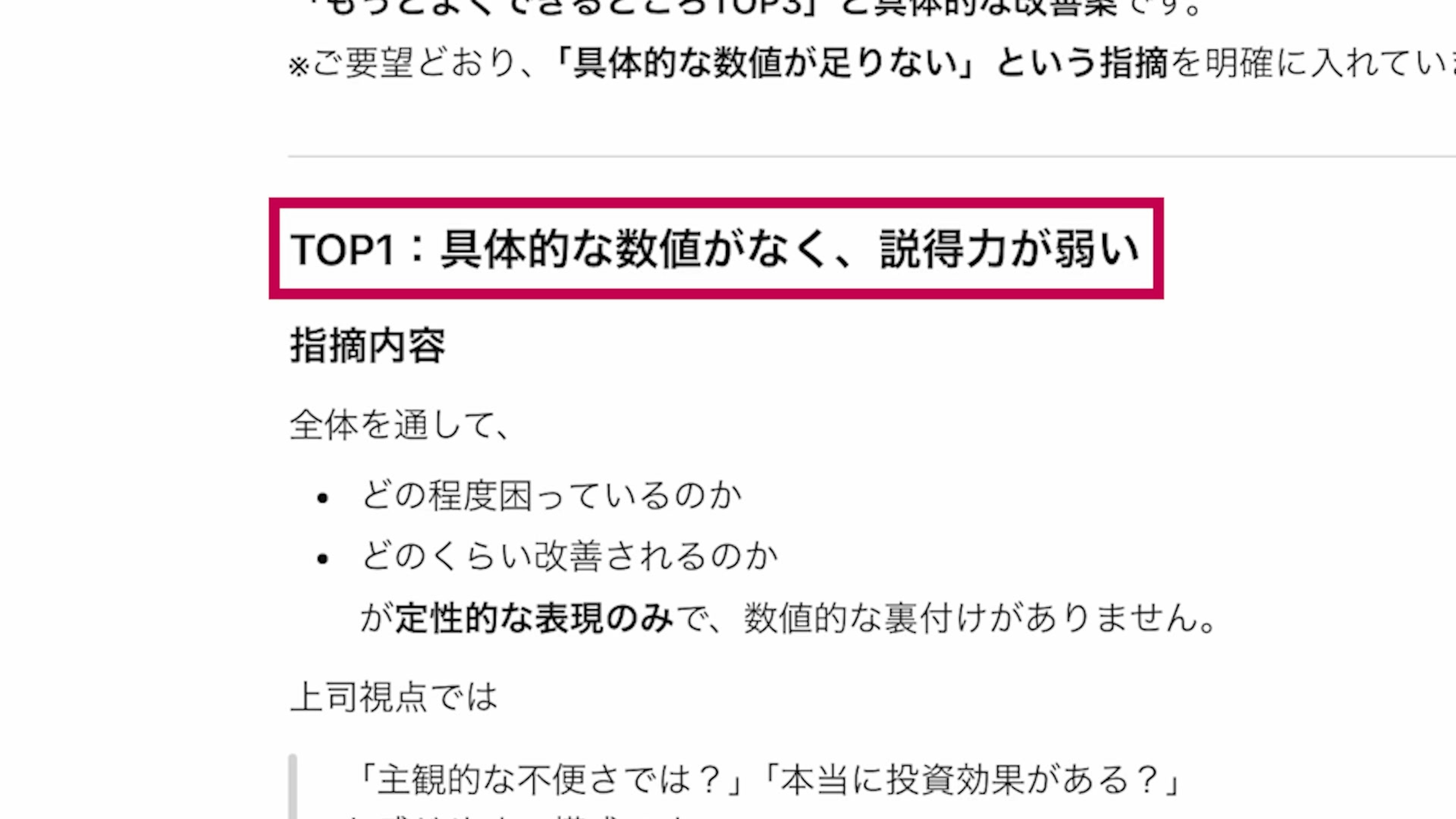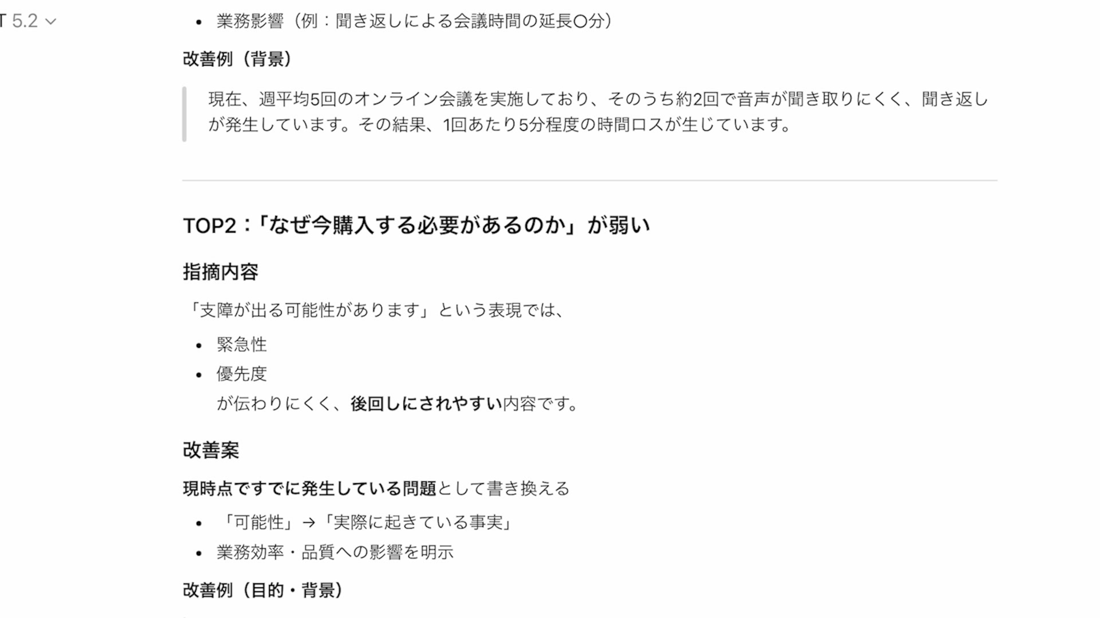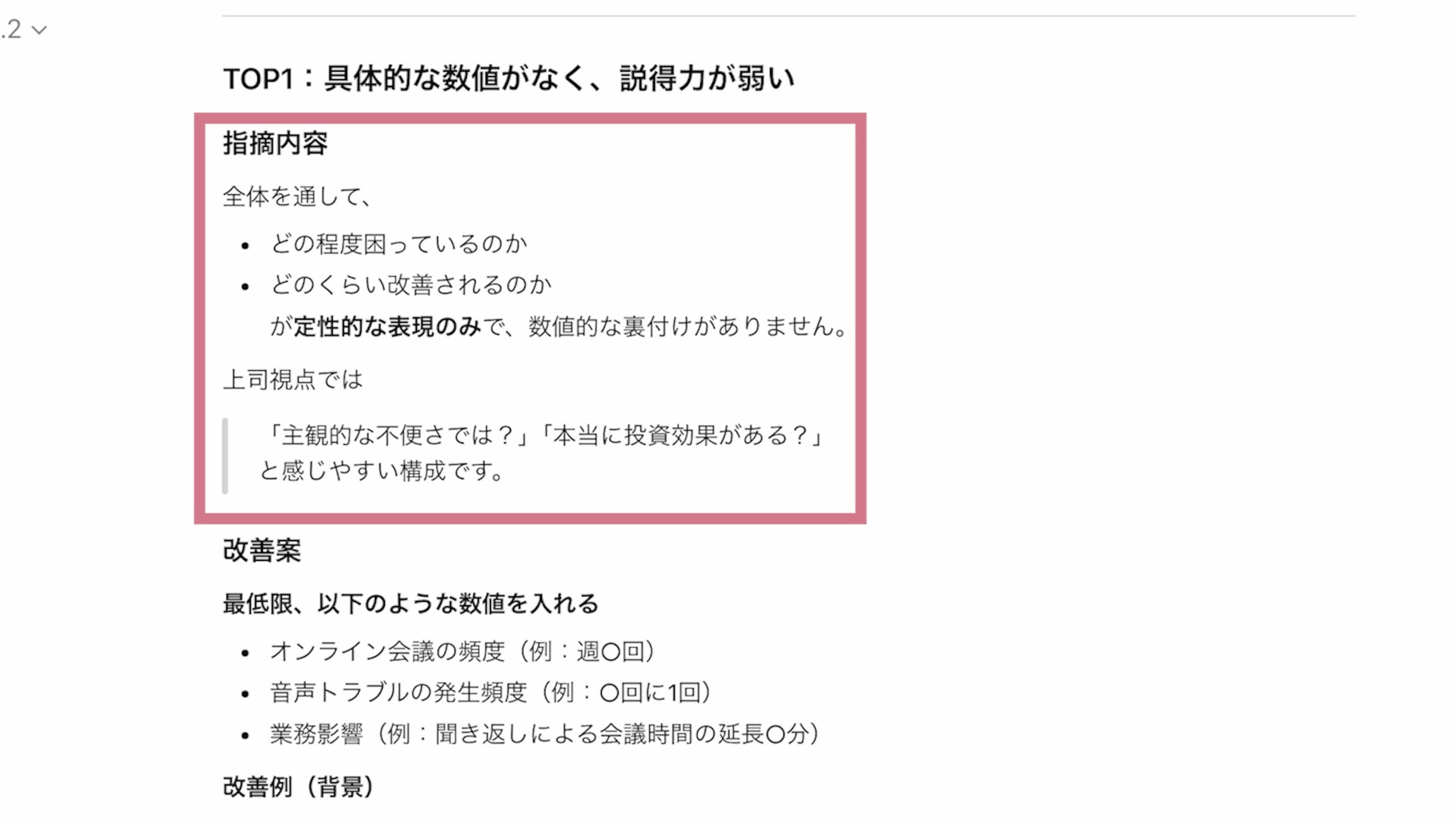 これが、「もっとよくできるところTOP3を、改善案とともに提案して」のプロンプトの効果です。