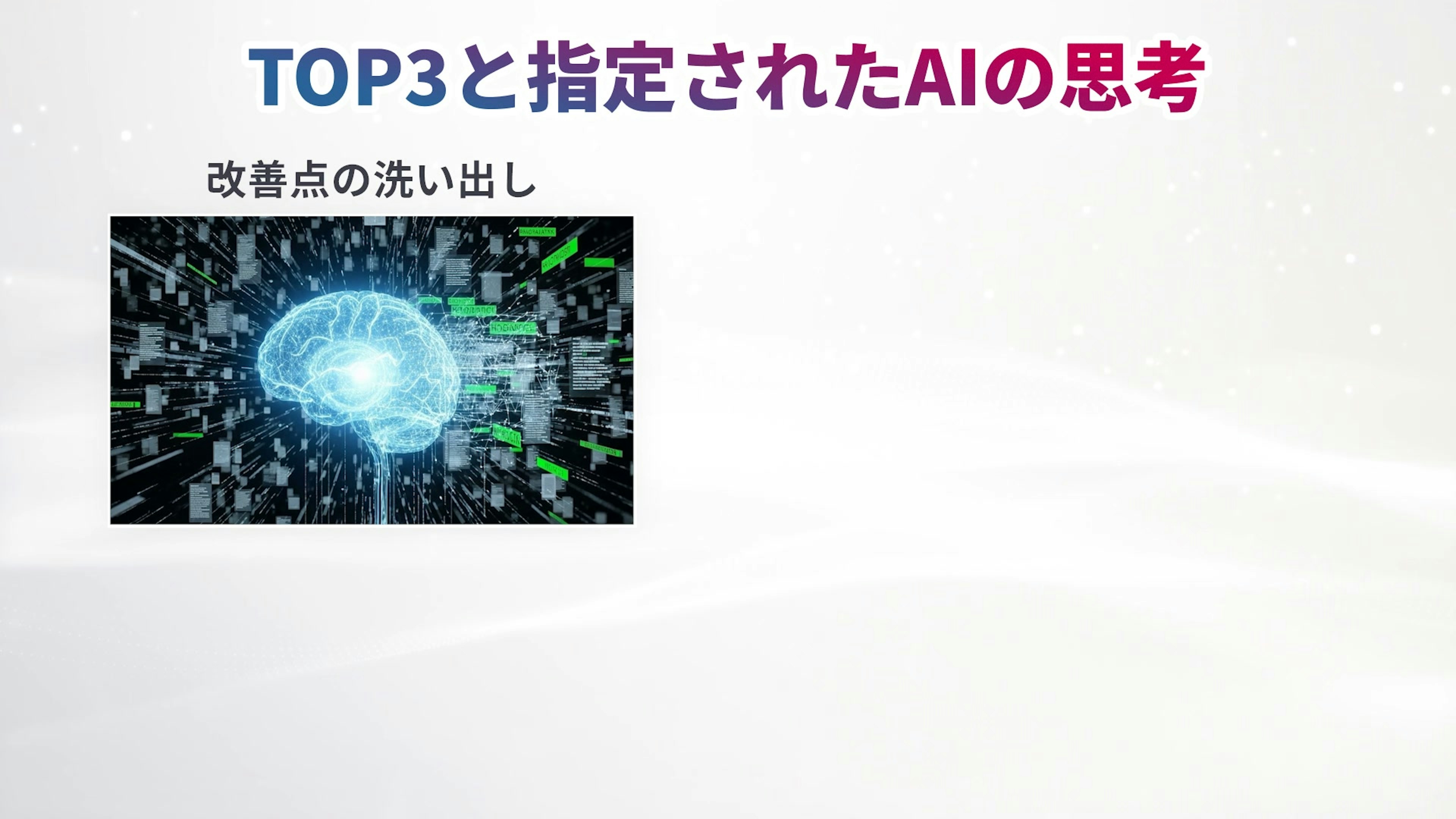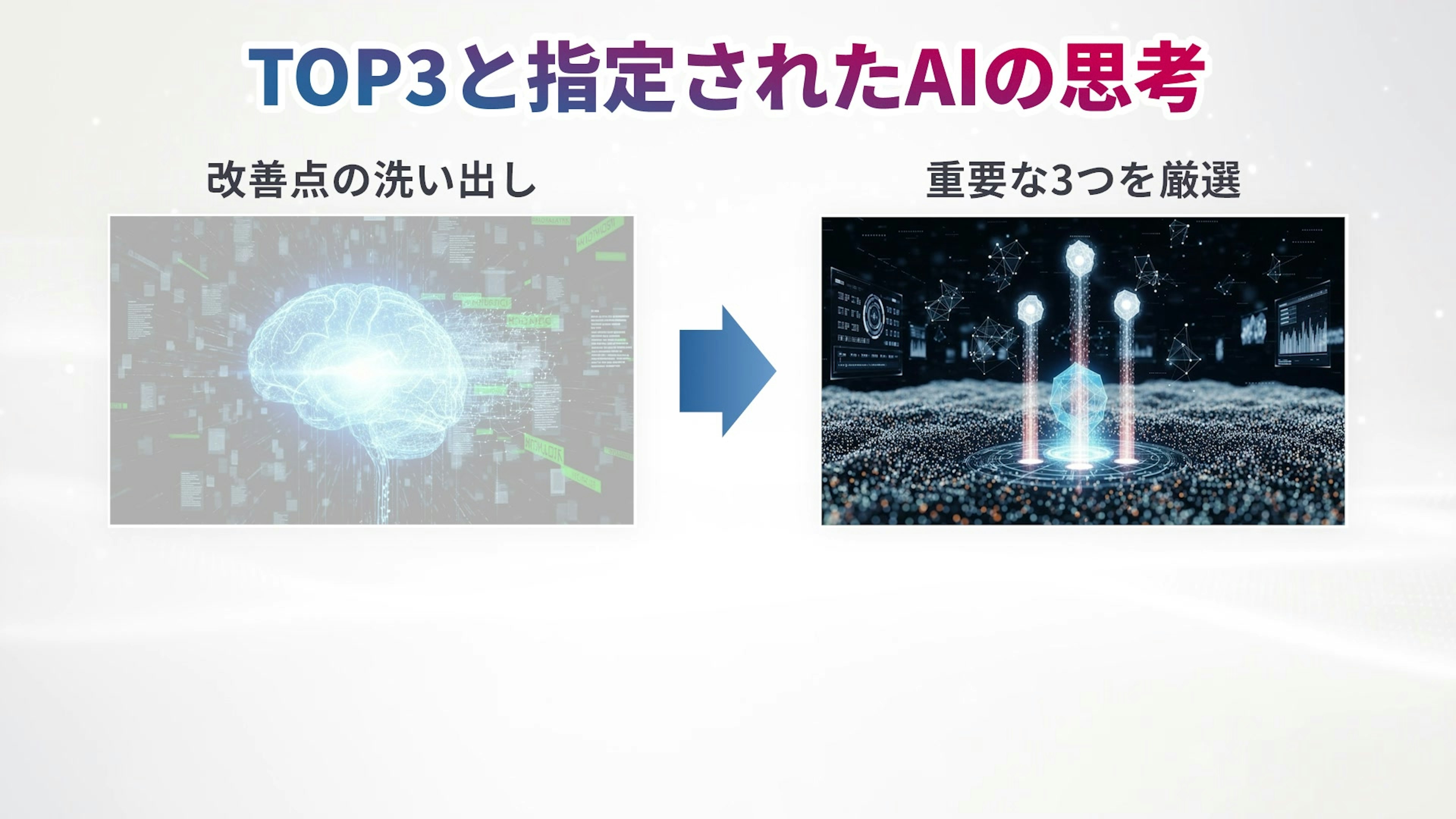 ですが「TOP3」と指定したら、AIは改善点を「すべて洗い出し」、「最も重要な3つを厳選する」というステップを踏むことになります。