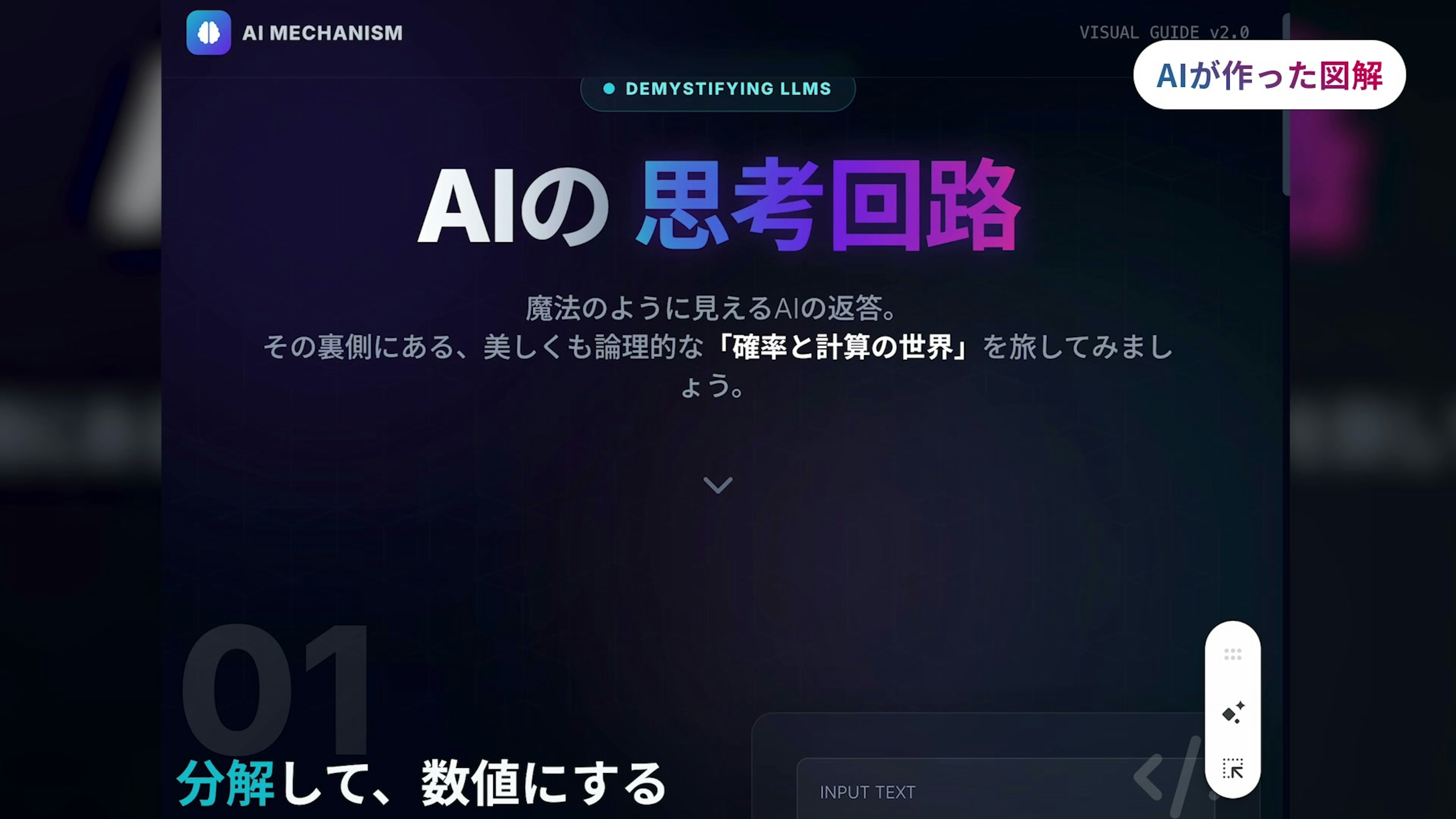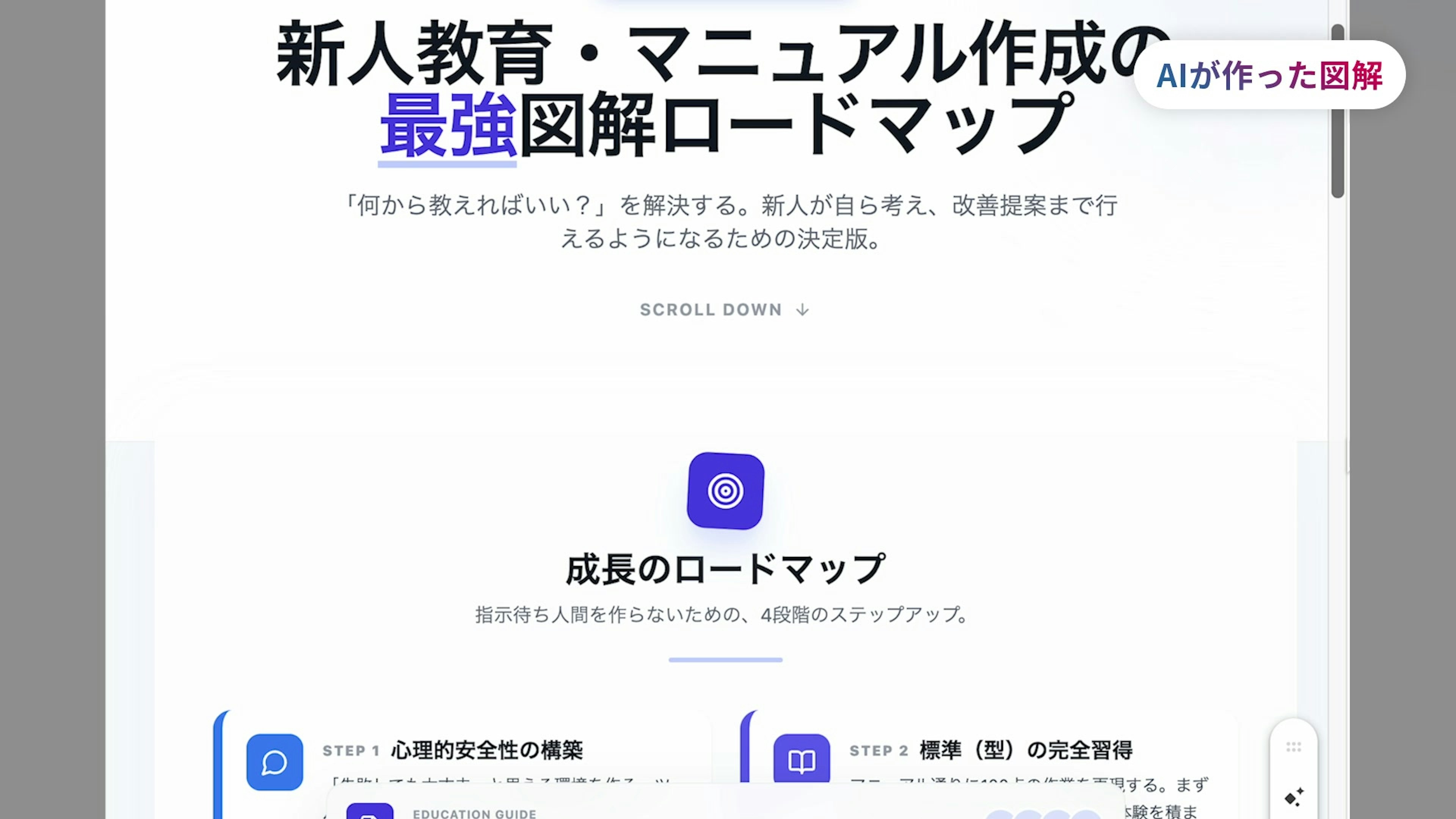 AIにこの言葉で指示することで、画像ではなく、きれいに整った「Webサイトのような図解」を作らせることができるのです。