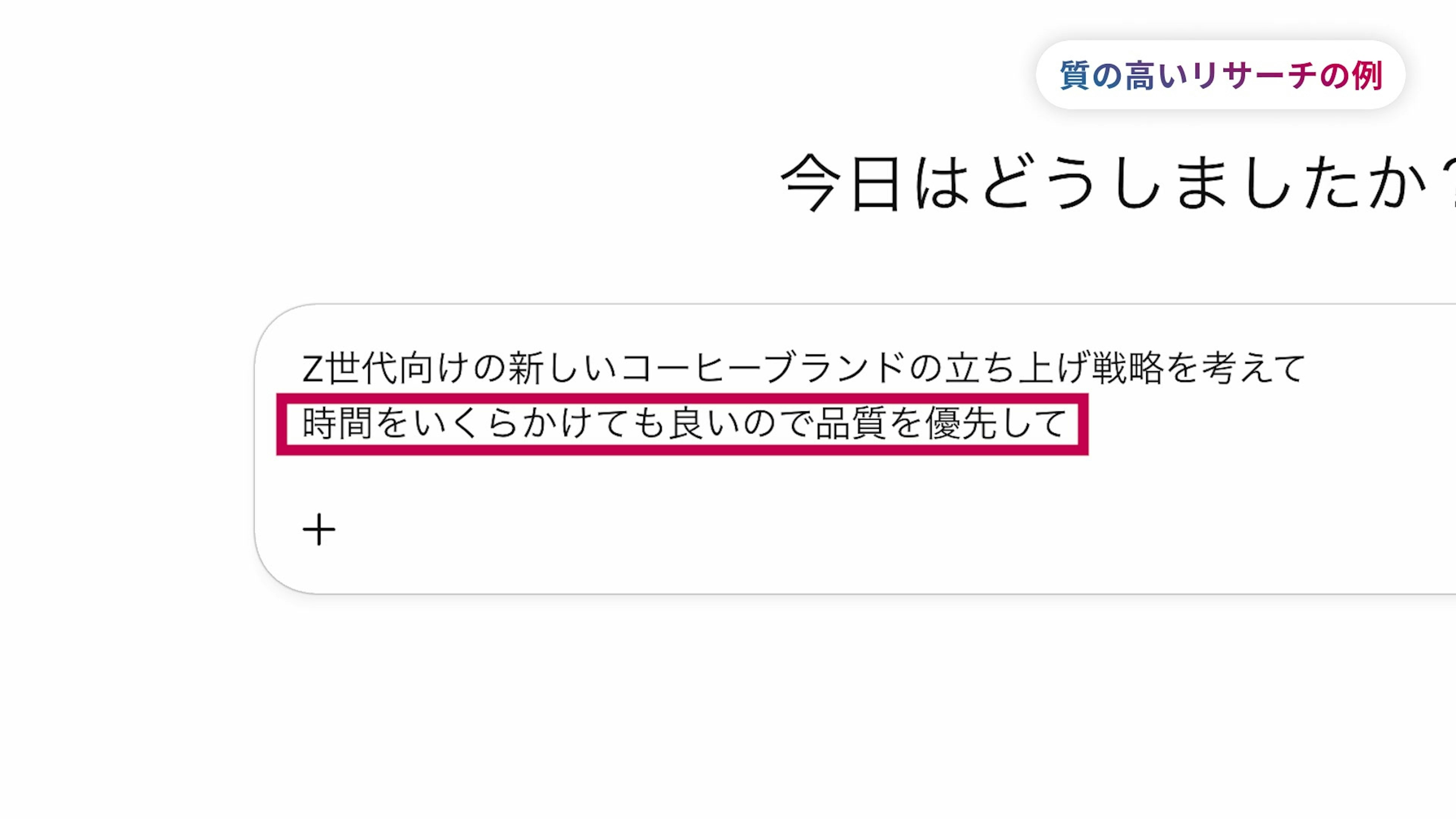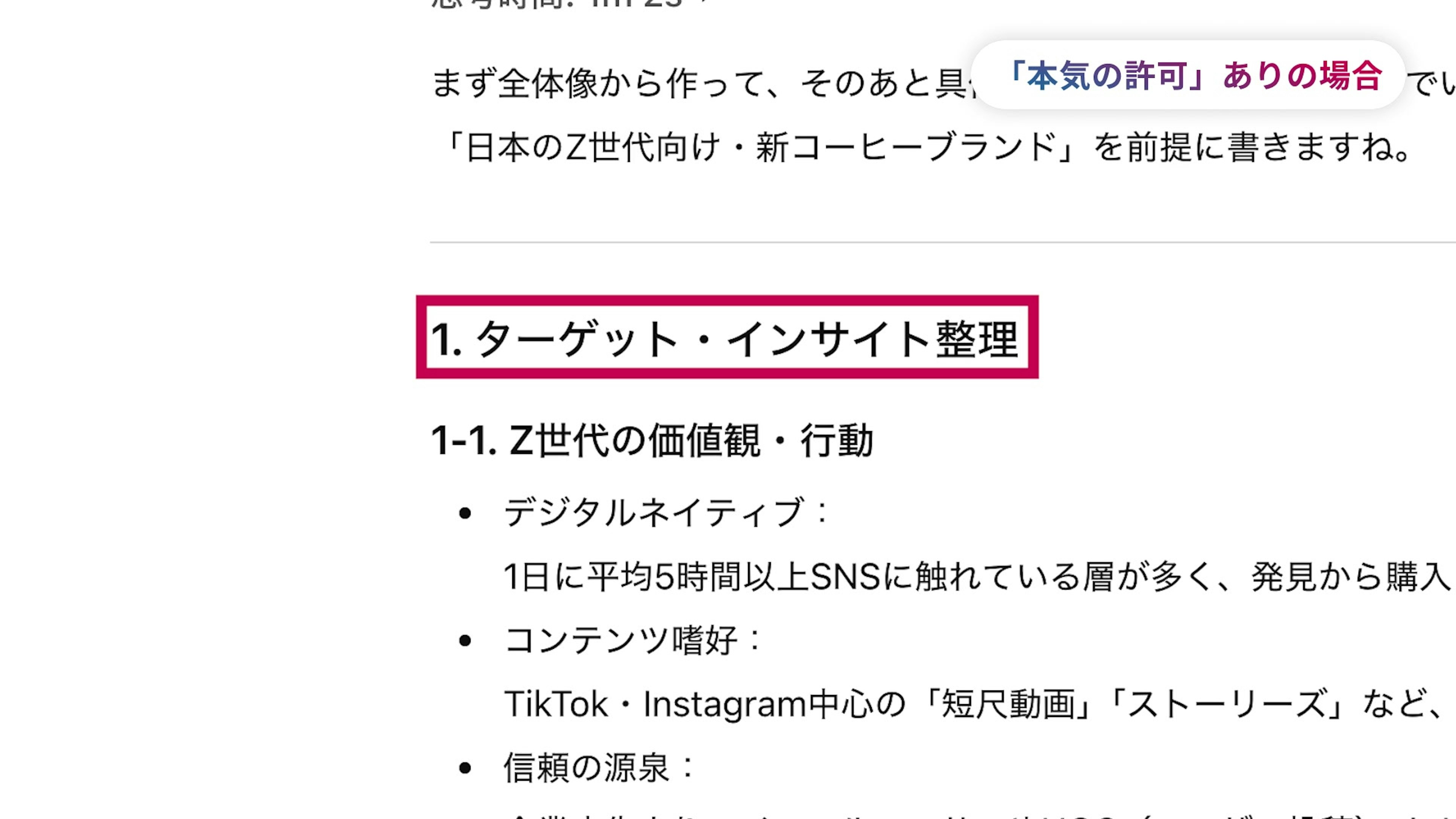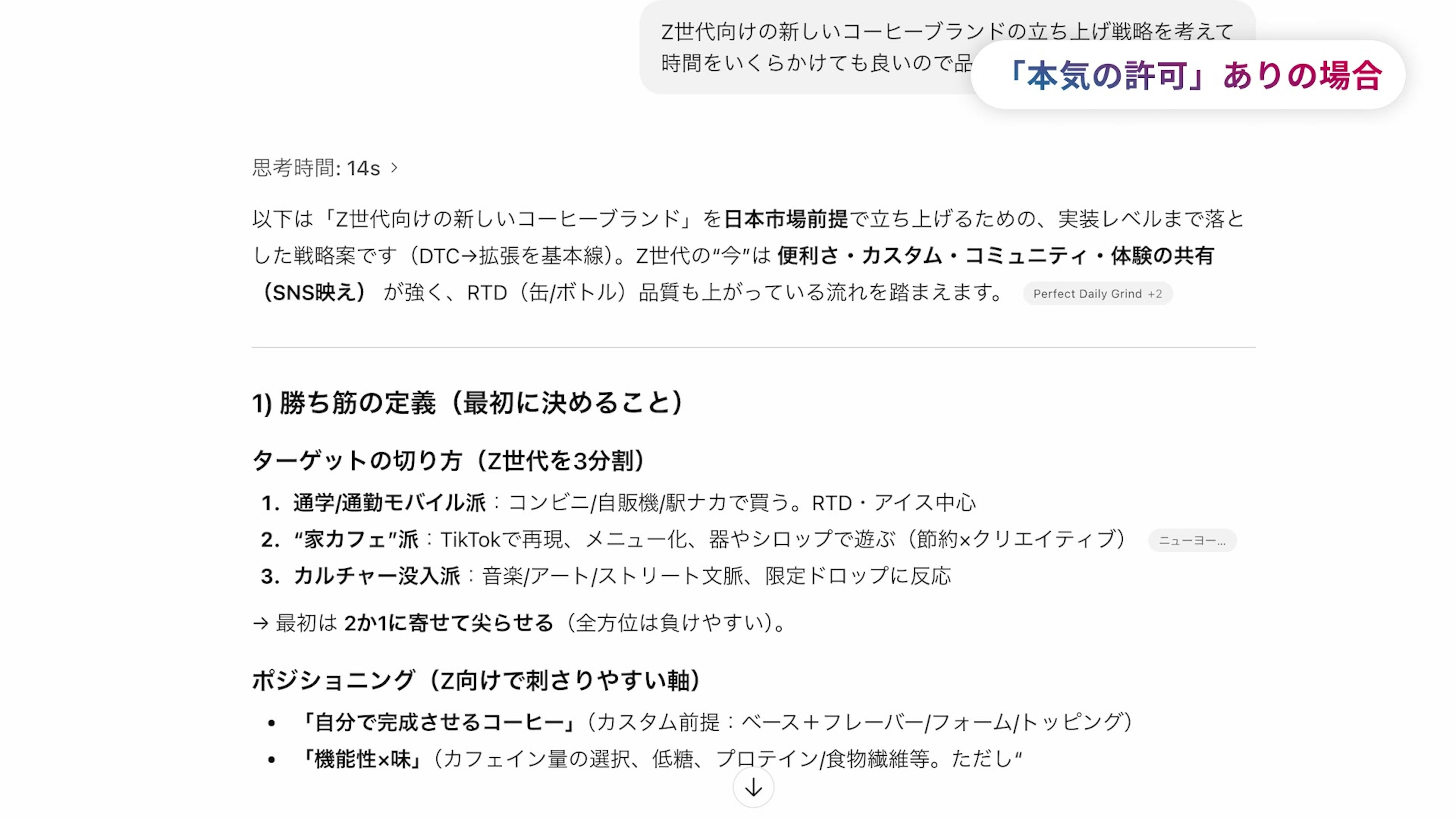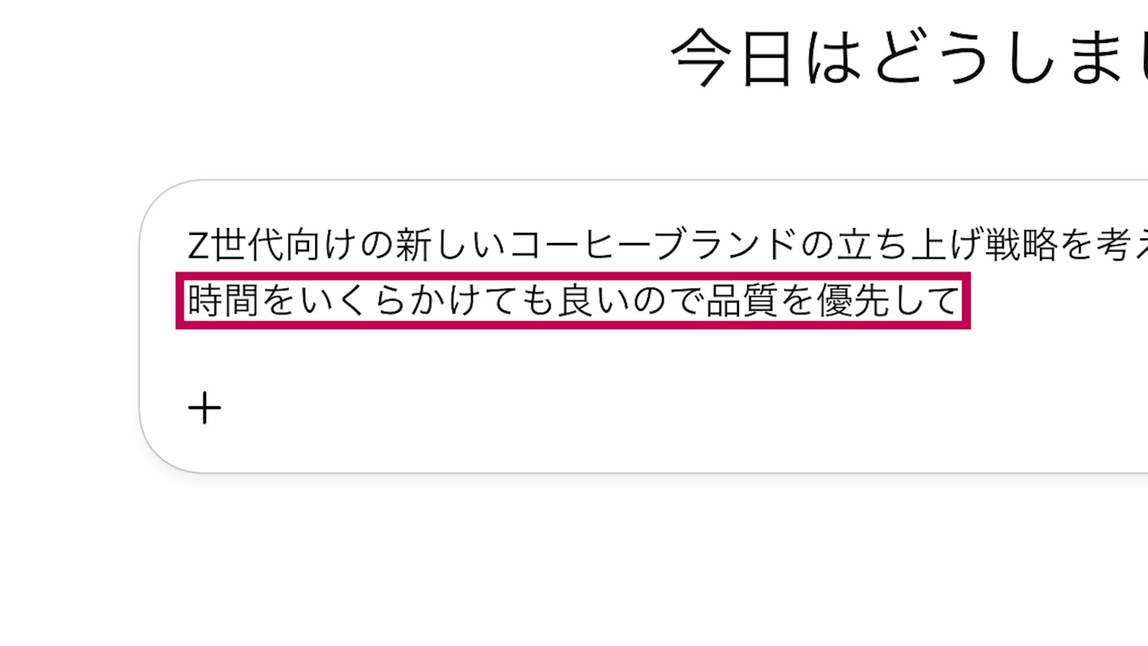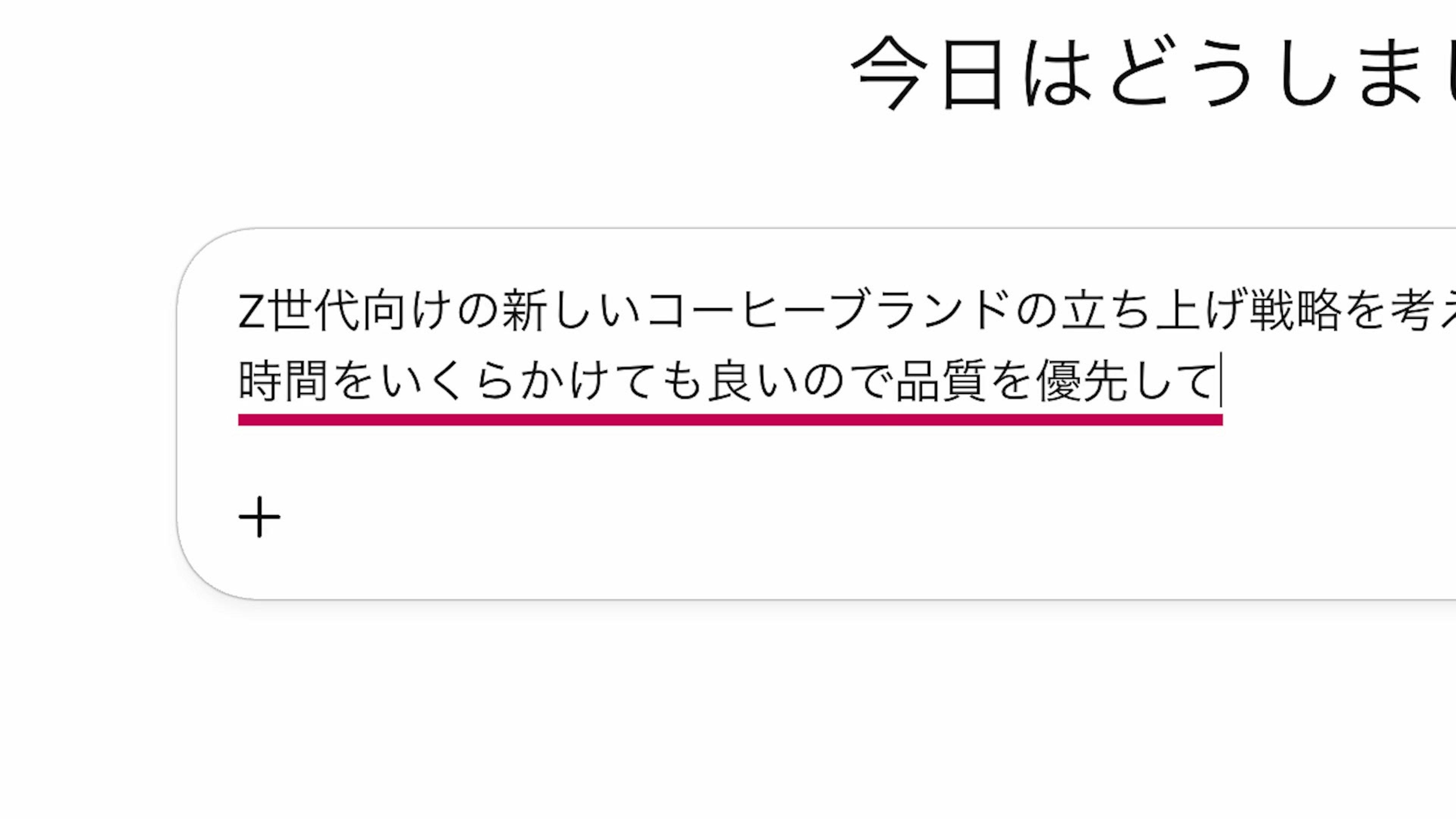 では、まずは「Z世代向けの新しいコーヒーブランドの立ち上げ戦略を考えて」と入力し、それ以外は何も指示せずに普通に聞いてみます。