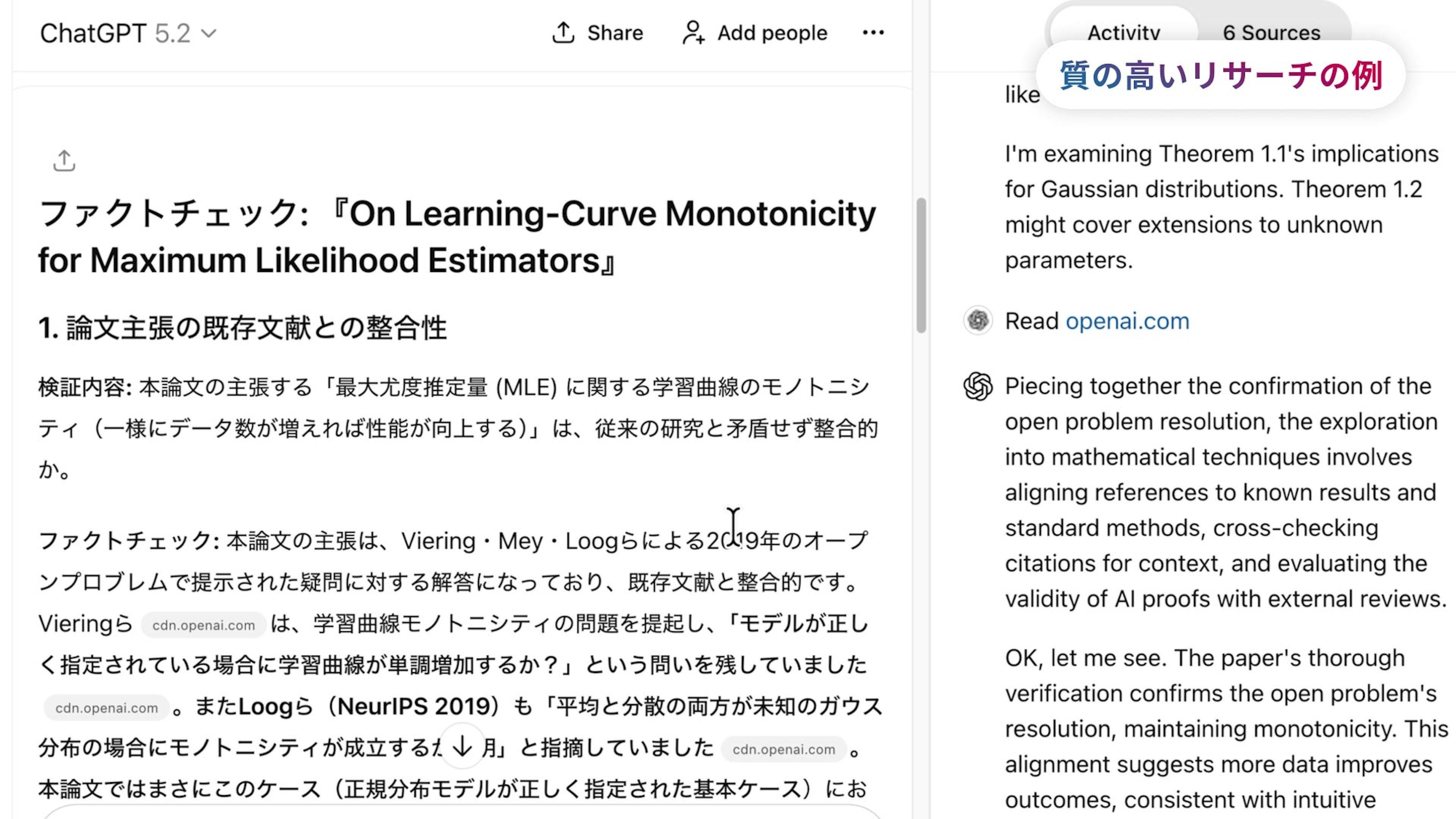 時間をかけても良いと伝えると、AIはWeb検索の回数を増やし、より多くの情報源から情報を集めてきてくれます。