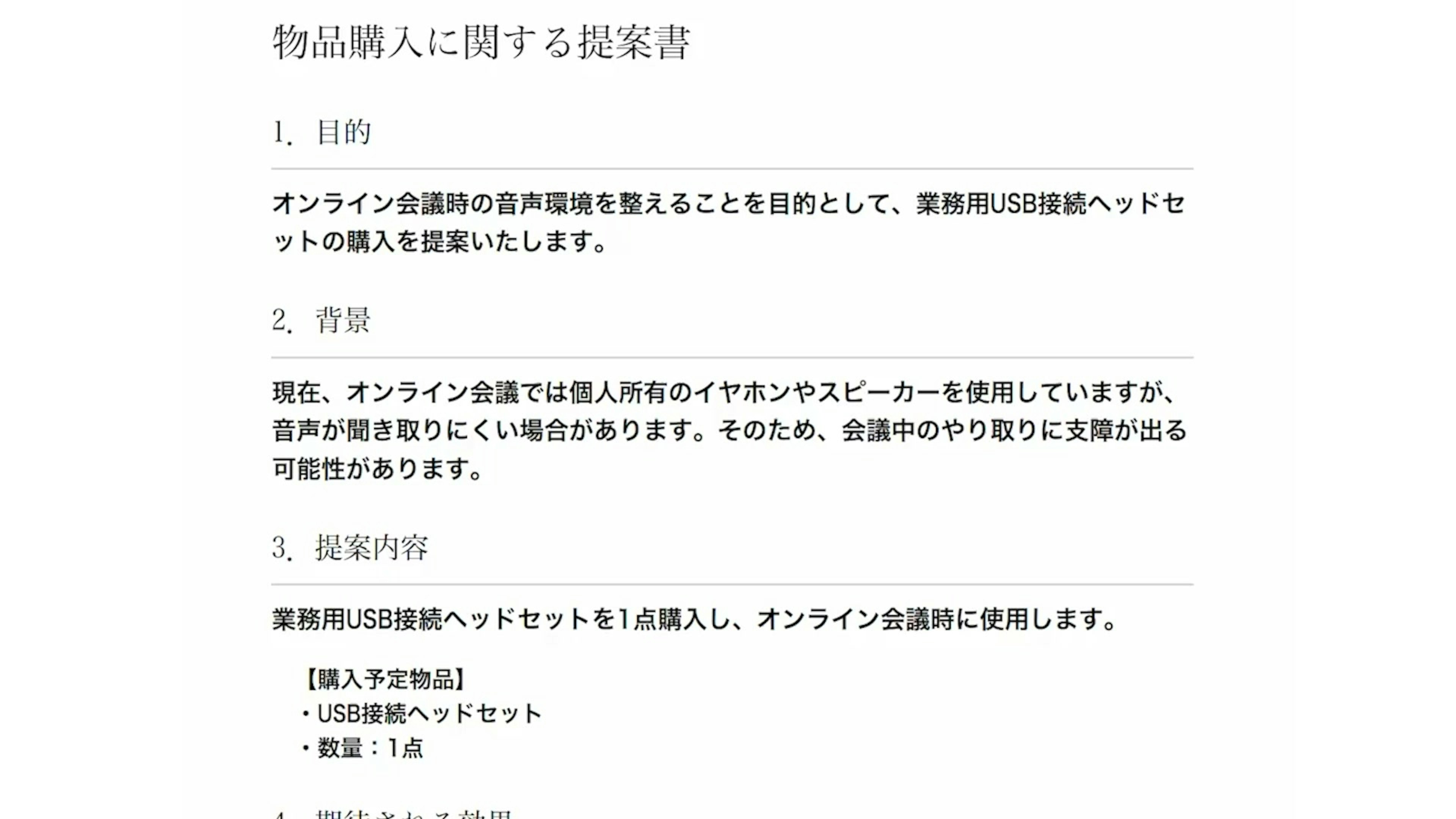 えーと、「これは新しい物品購入に関する提案書で、上司に提案するためのものです」。