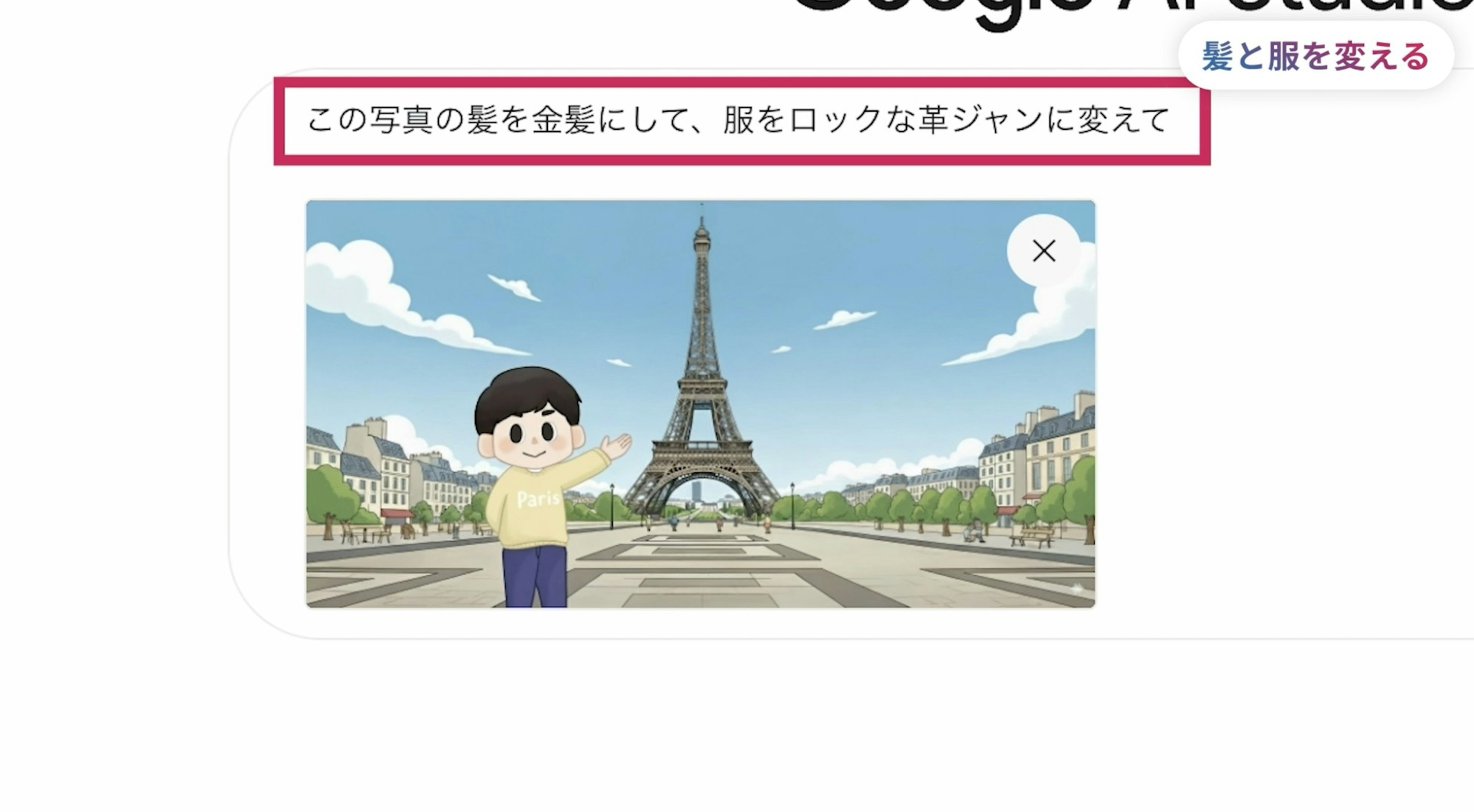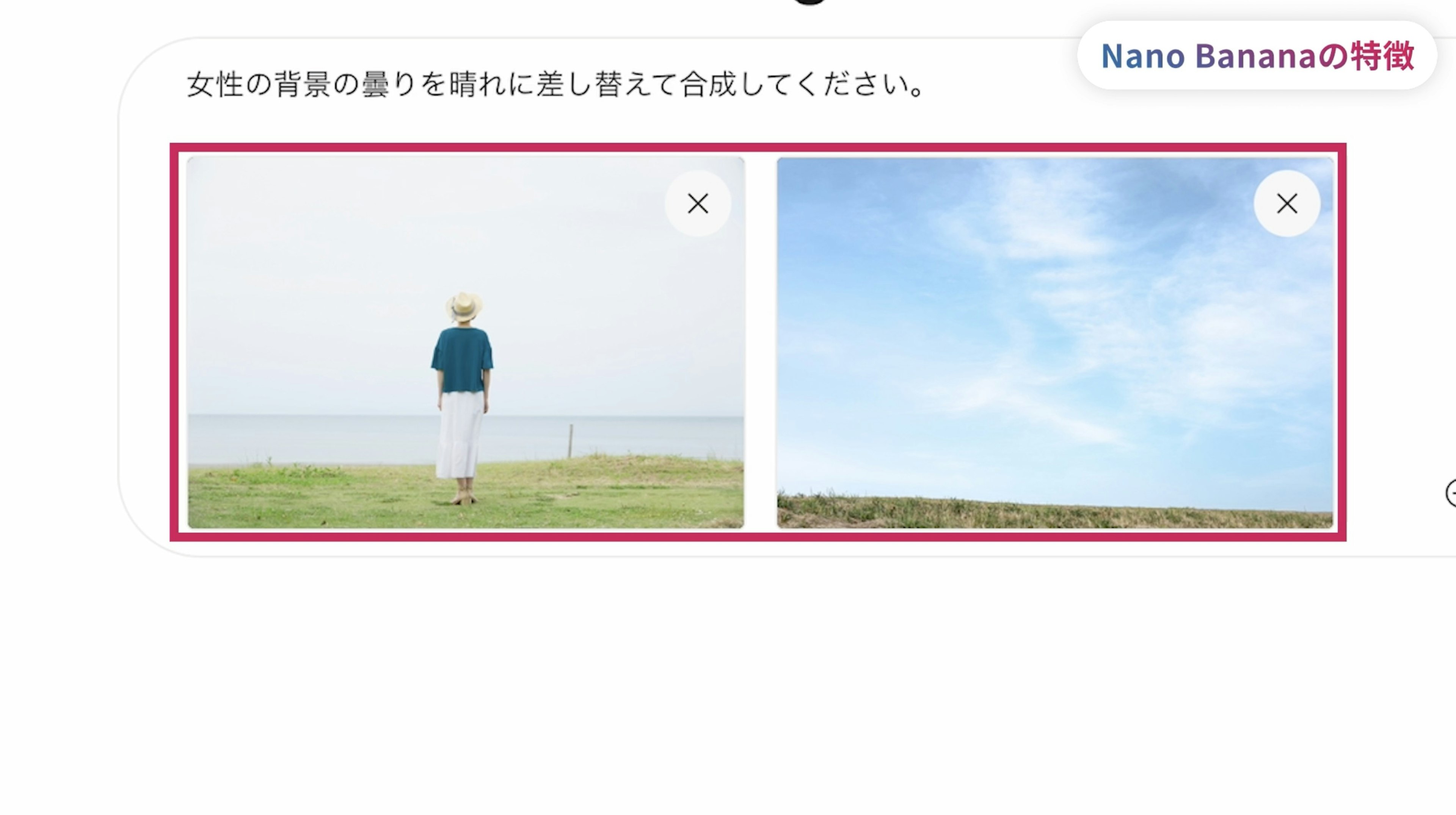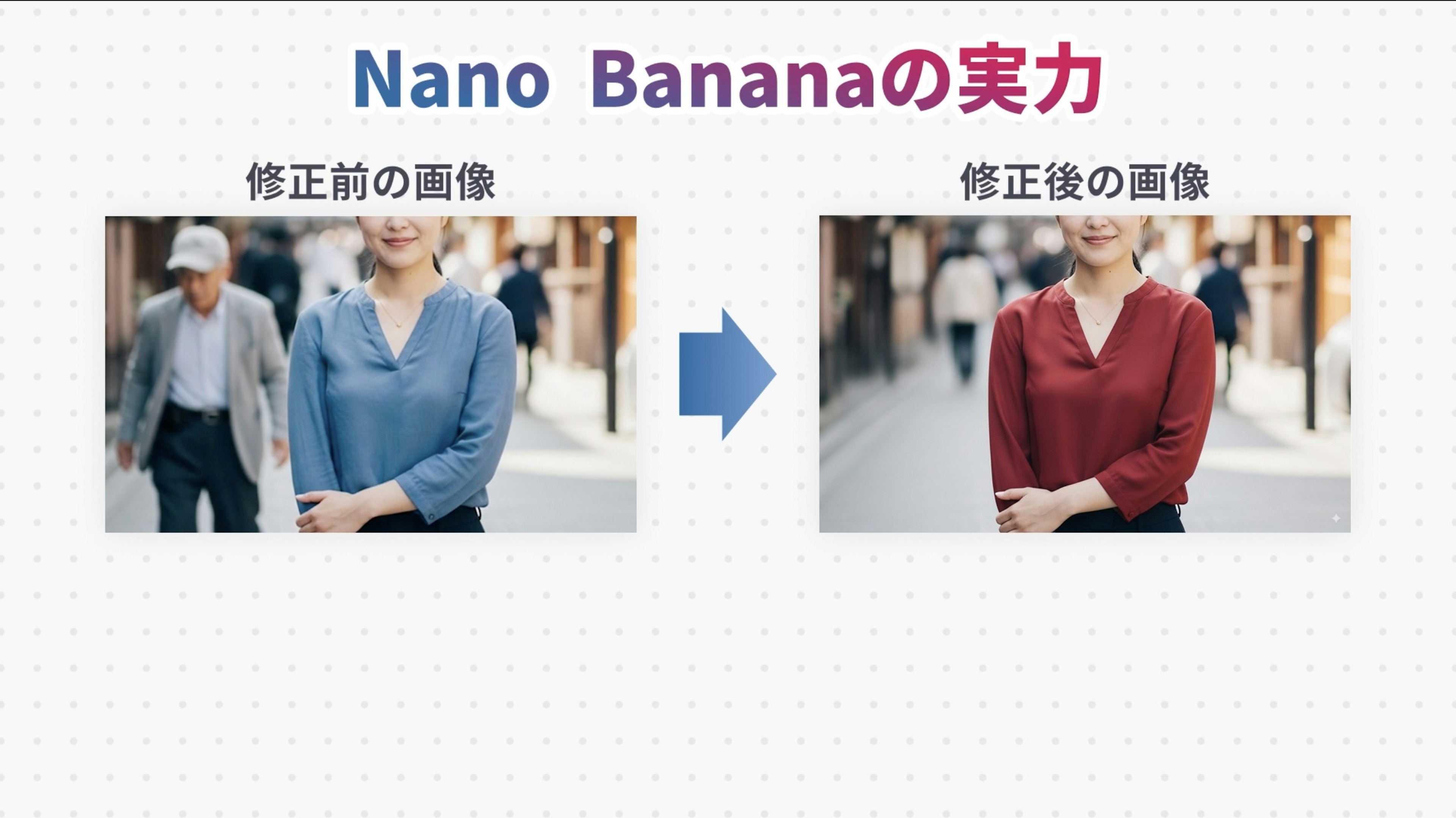 まずは詳しい解説より、実際にNano Bananaを使った画像編集を見ていただくのが良いでしょう。