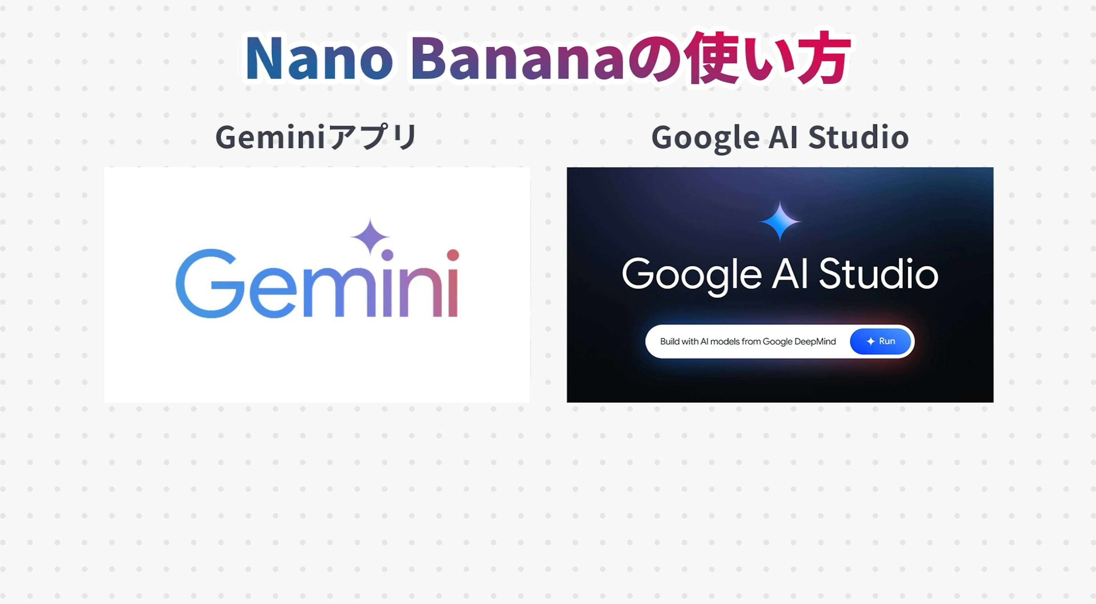 Nano Bananaを簡単に使う方法は2つで、GoogleのAI『Gemini』のアプリで画像を編集するか、同じくGoogleの提供するサービス『Google AI Studio』上でNano Bananaを選択します。