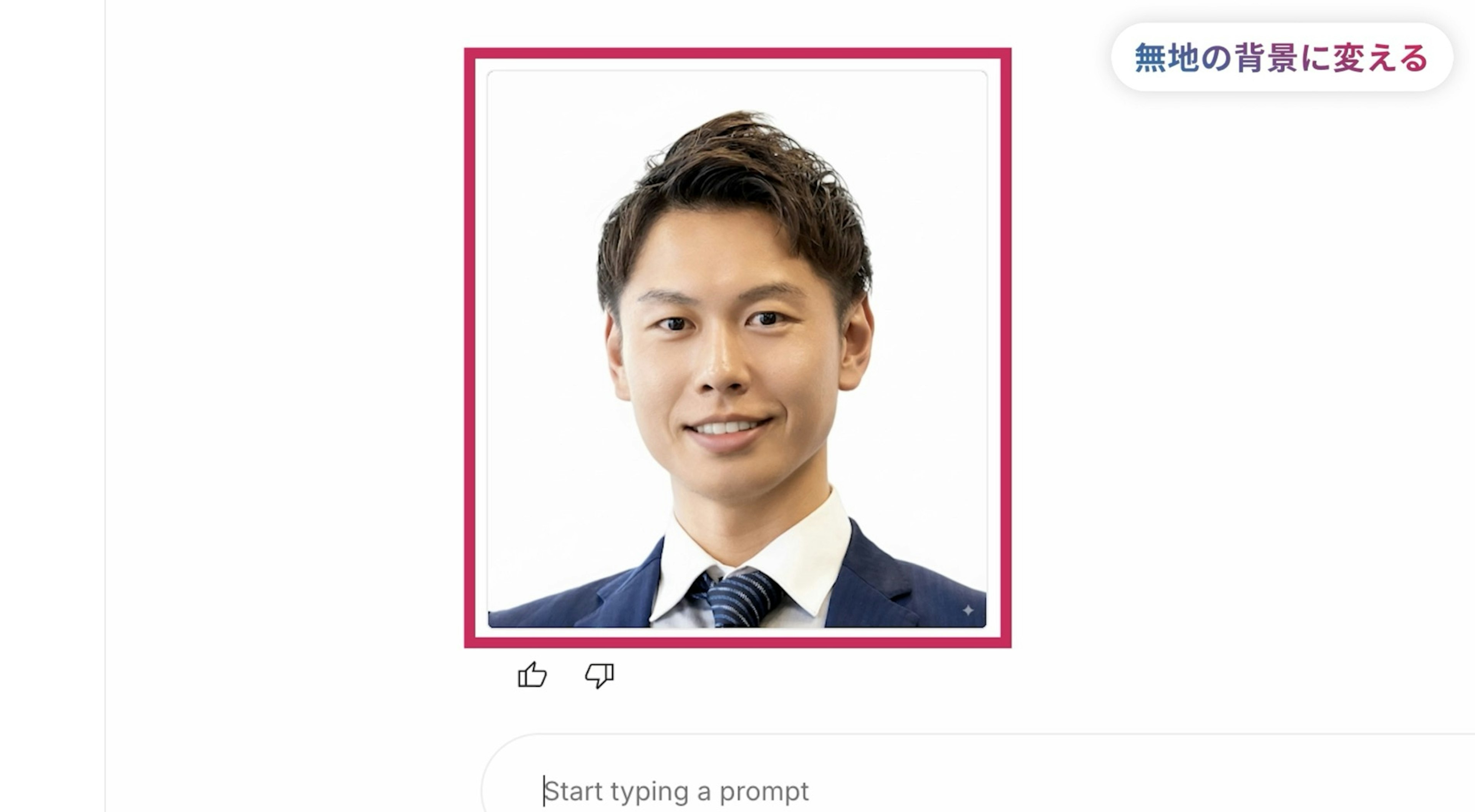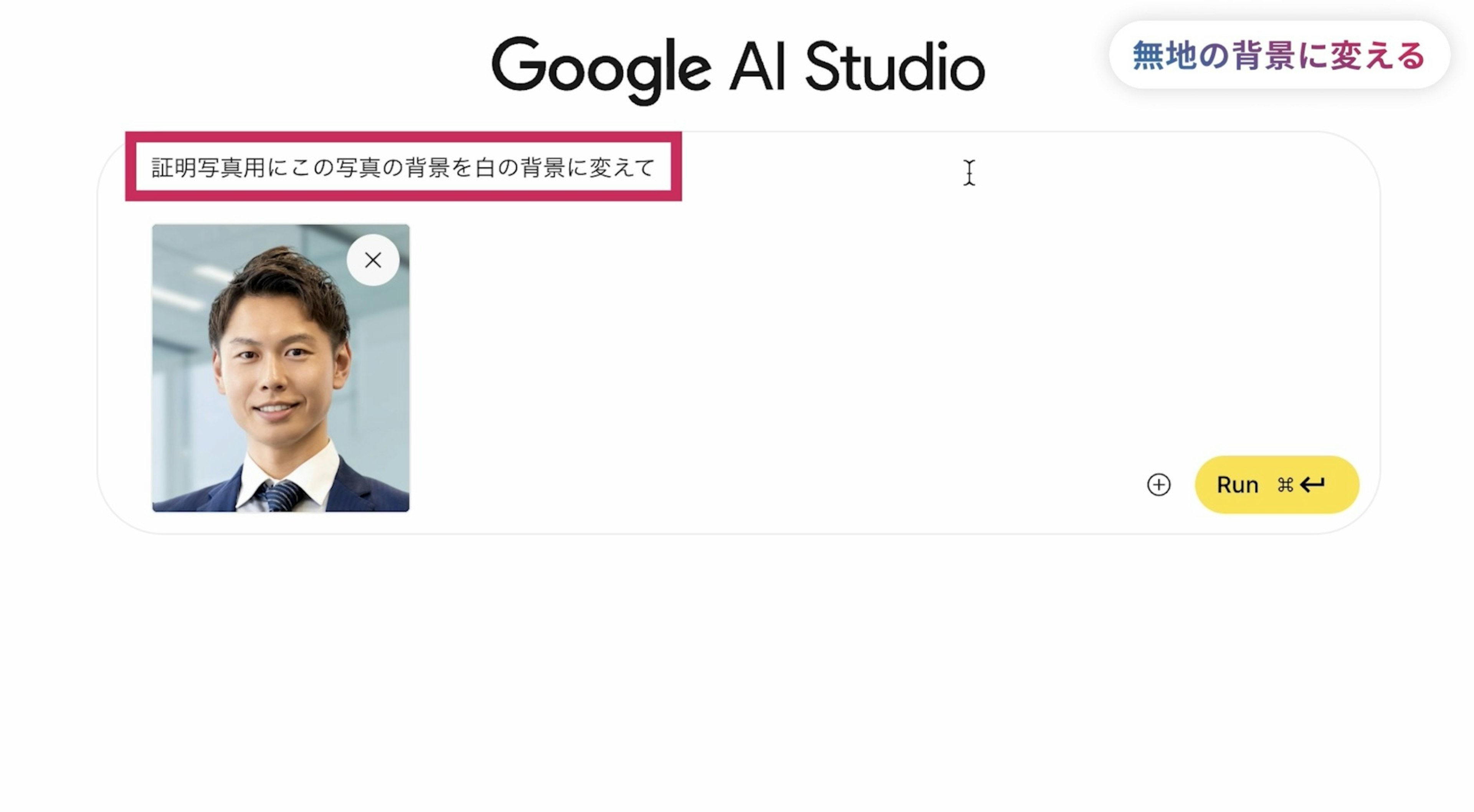 例えば、急に証明写真が必要になった時、自分の画像をNano Bananaに読み込ませて、『証明写真用にこの写真の背景を白の背景に変えて』とチャット欄で指示します。