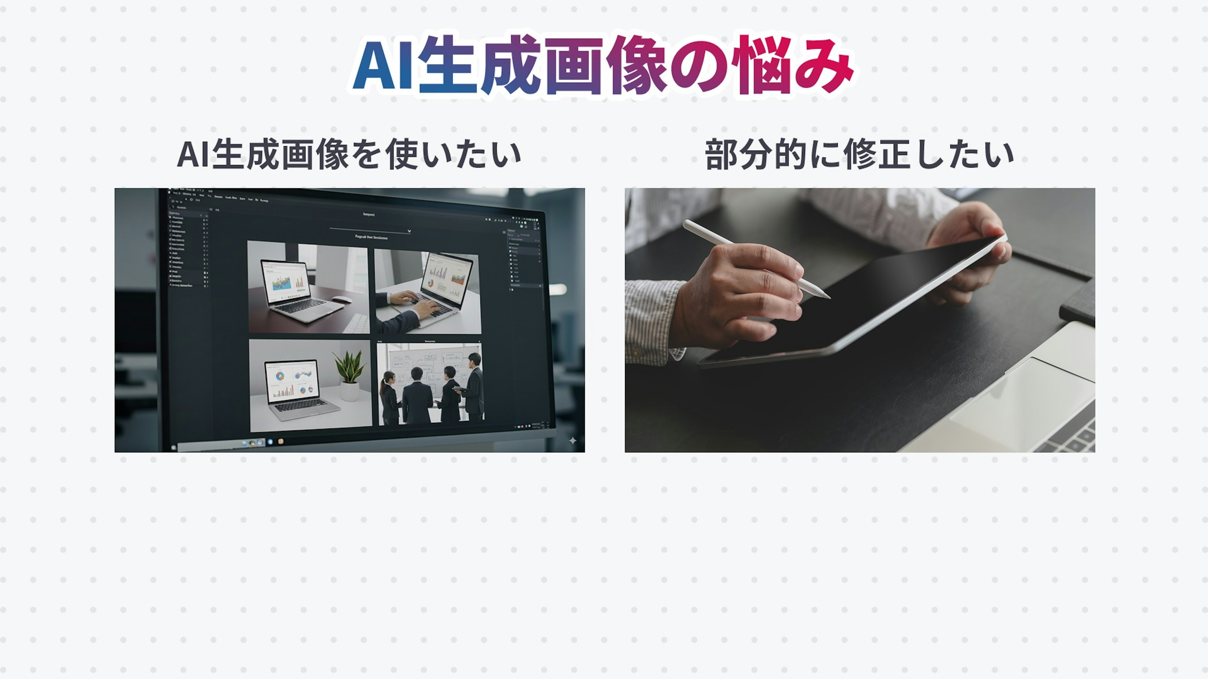 Nano Bananaが活用できる例として、AI生成画像を資料に使いたいけど、ちょっと気になる部分がある場面を想定してみます。