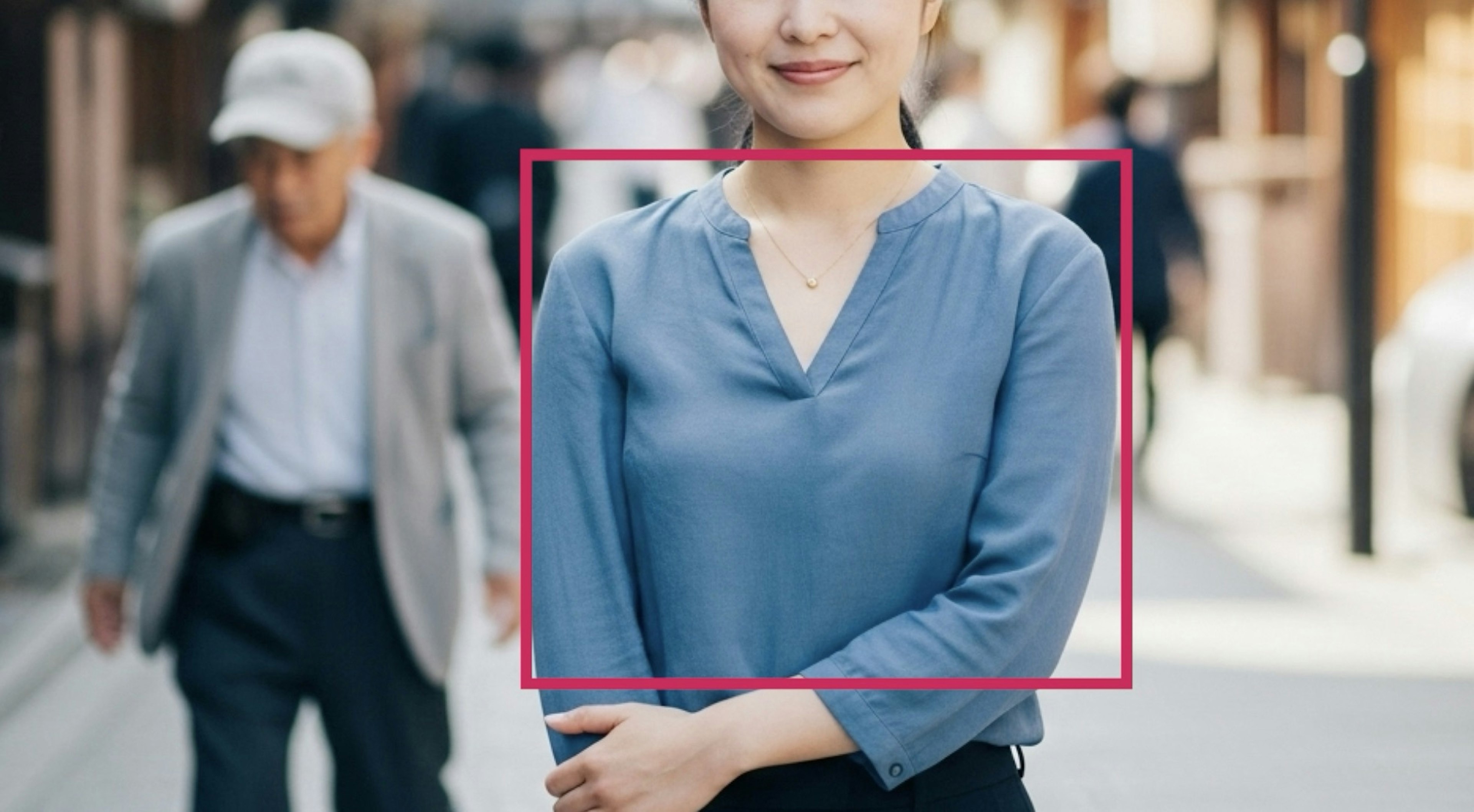 手前の人の服を赤色にして、奥に写っている人物を消したいとします。