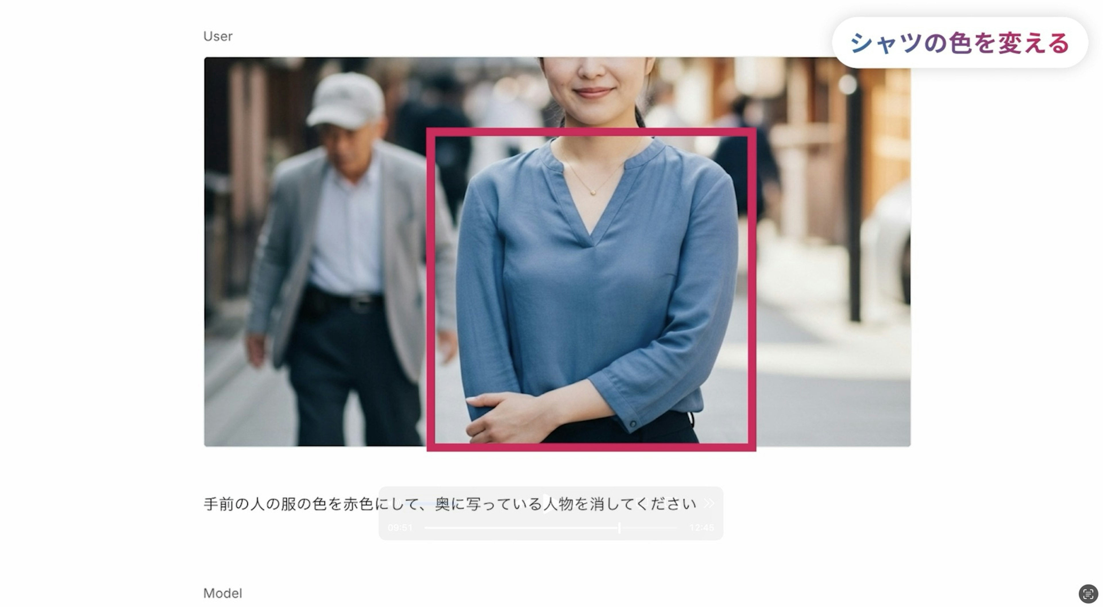 本来はもっと丁寧な指示を入れますが、今回は雑に『手前の人の服の色を赤色にして、奥に写っている人物を消してください』とテキストで指示します。