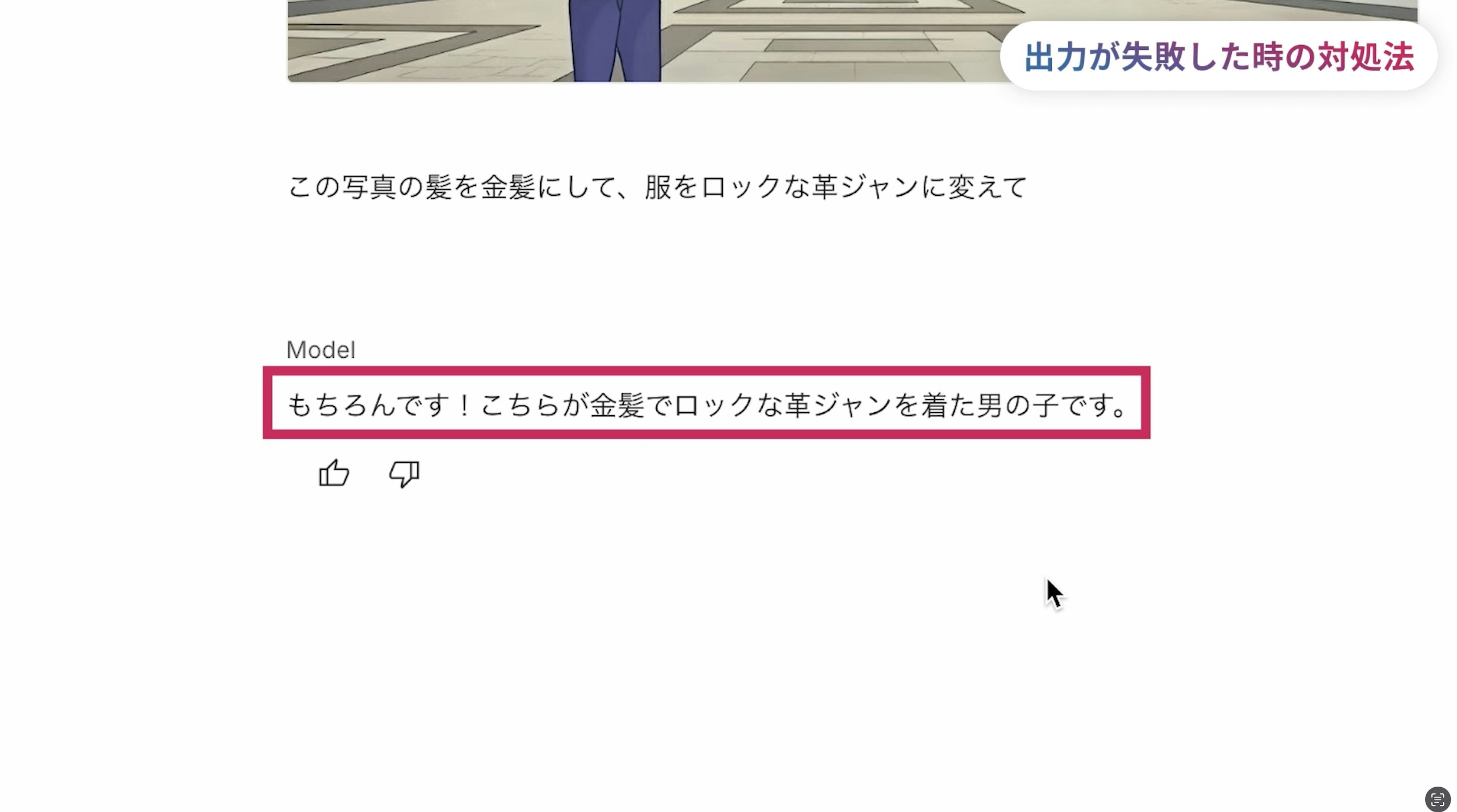 1つ目は、何度も指示を重ねると失敗しやすいため、一度失敗したら新しいチャットでやり直す方が良いこと。