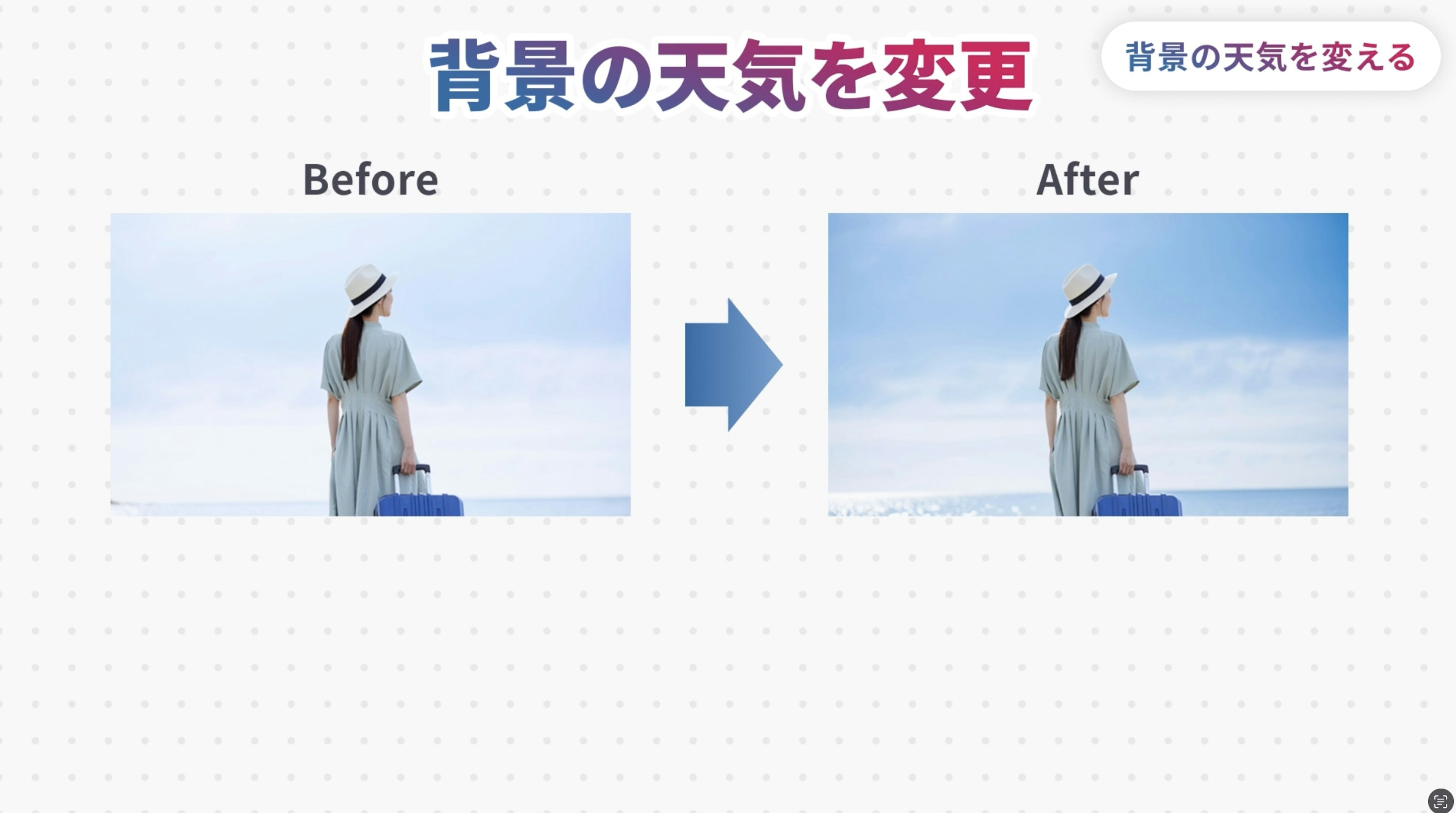 ええ。例えば、この旅行先の写真、天気が曇っていてどんよりした印象になってしまっていますが、これを晴天に変えることもできます。