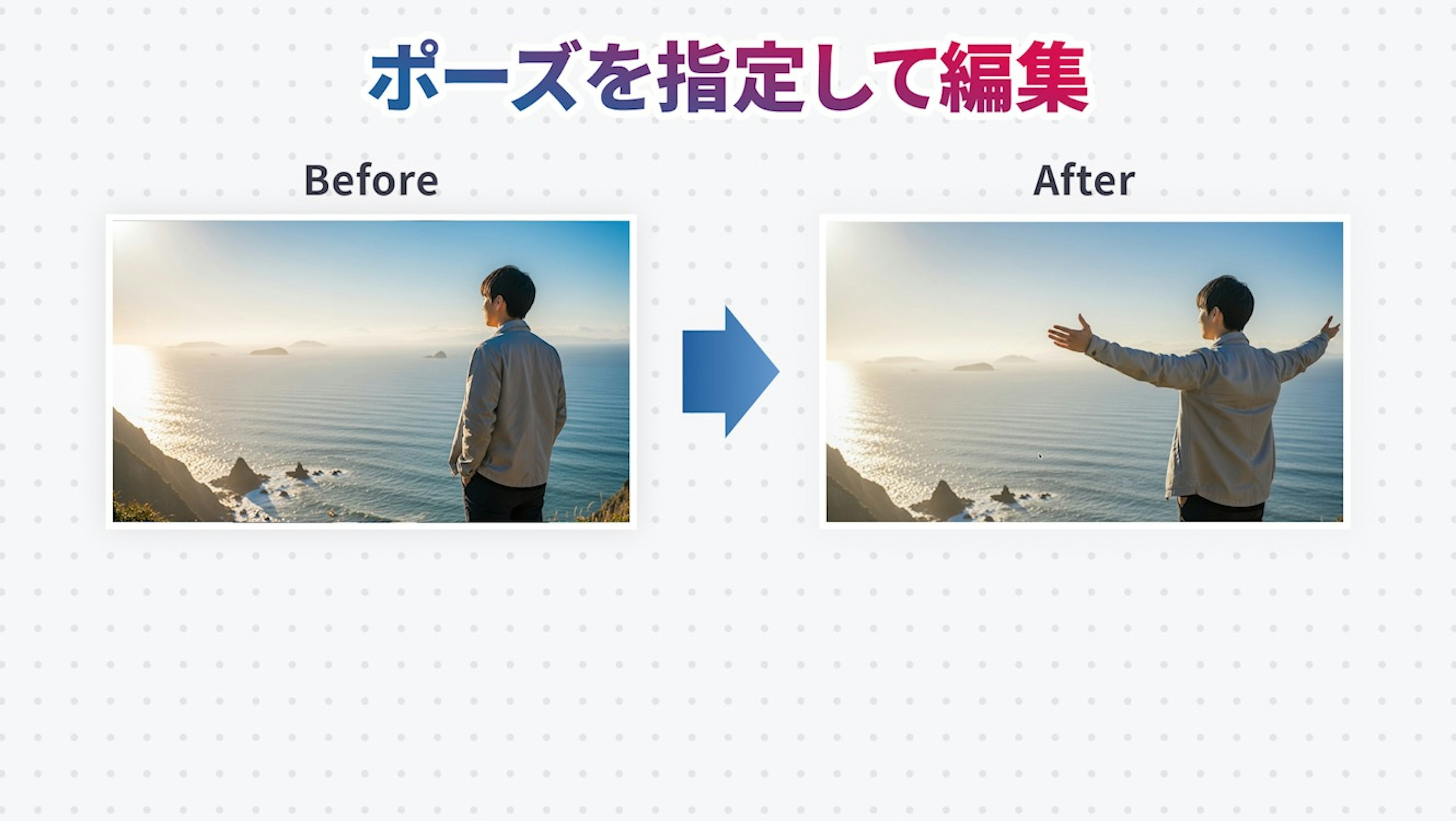 少しマニアックですが、写真に写った人のポーズを変えることもできます。