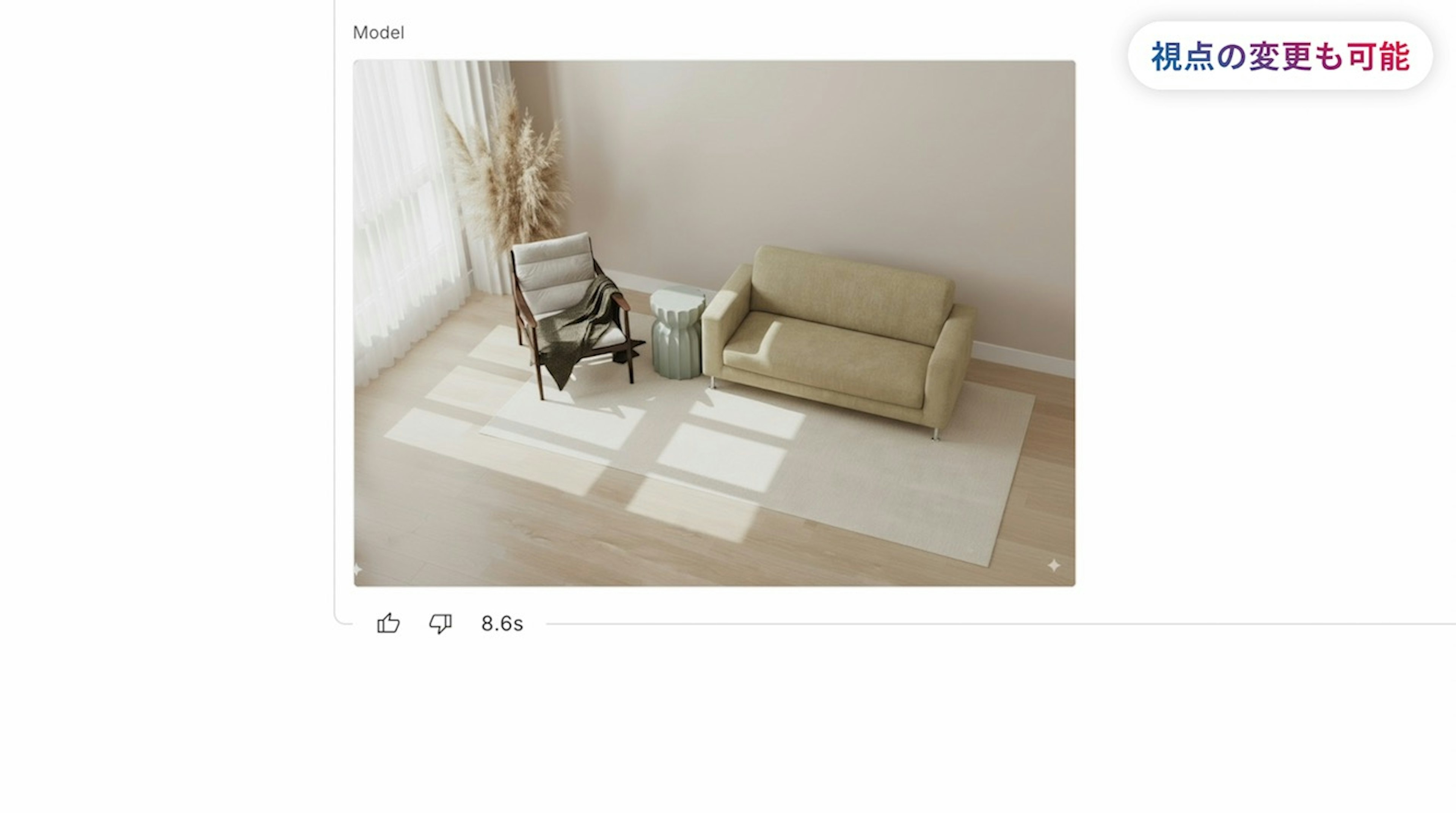 さらに、先ほど編集した画像に、追加で指示を加えると、このように『視点を変えた画像を生成することも可能です。