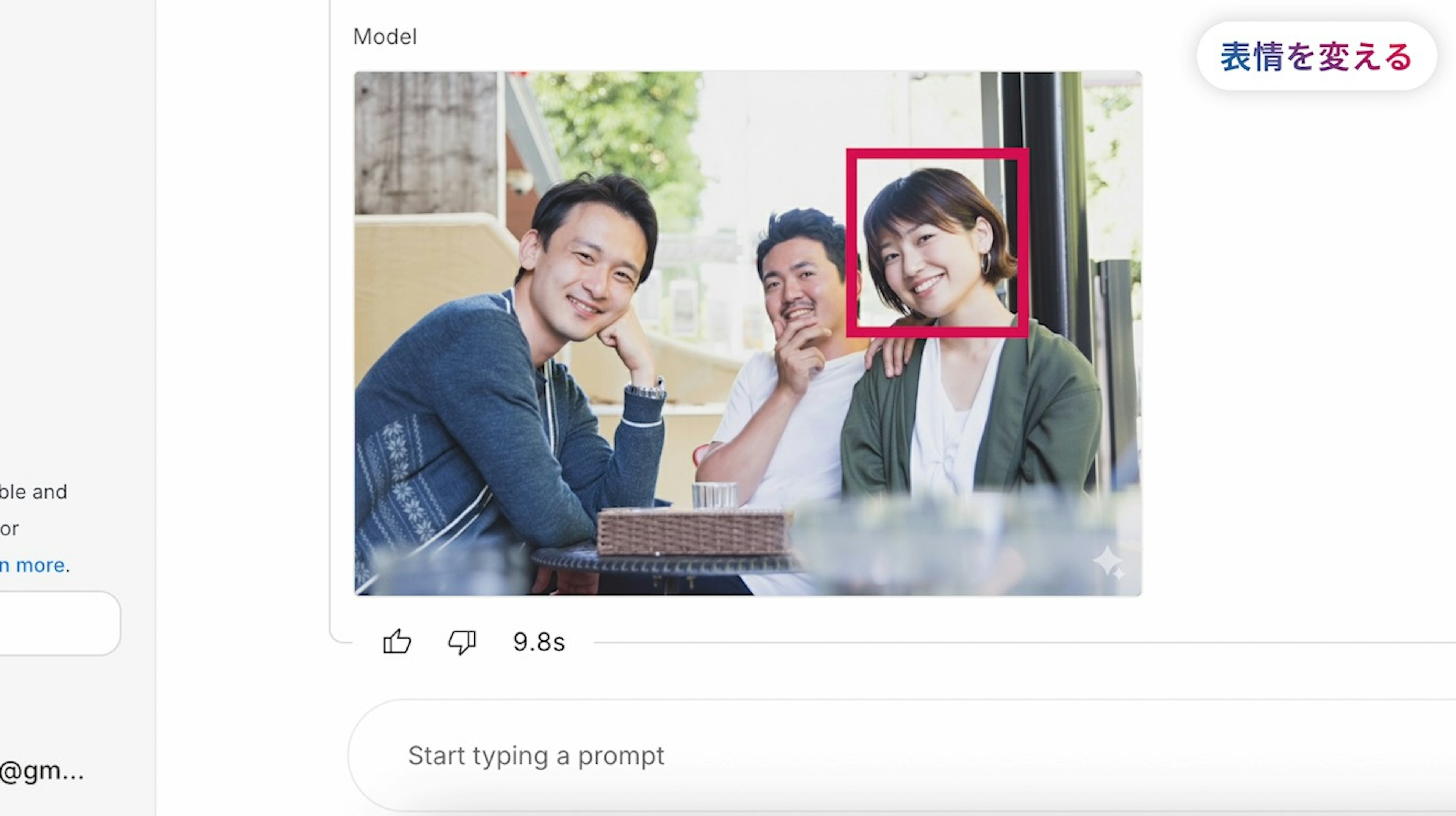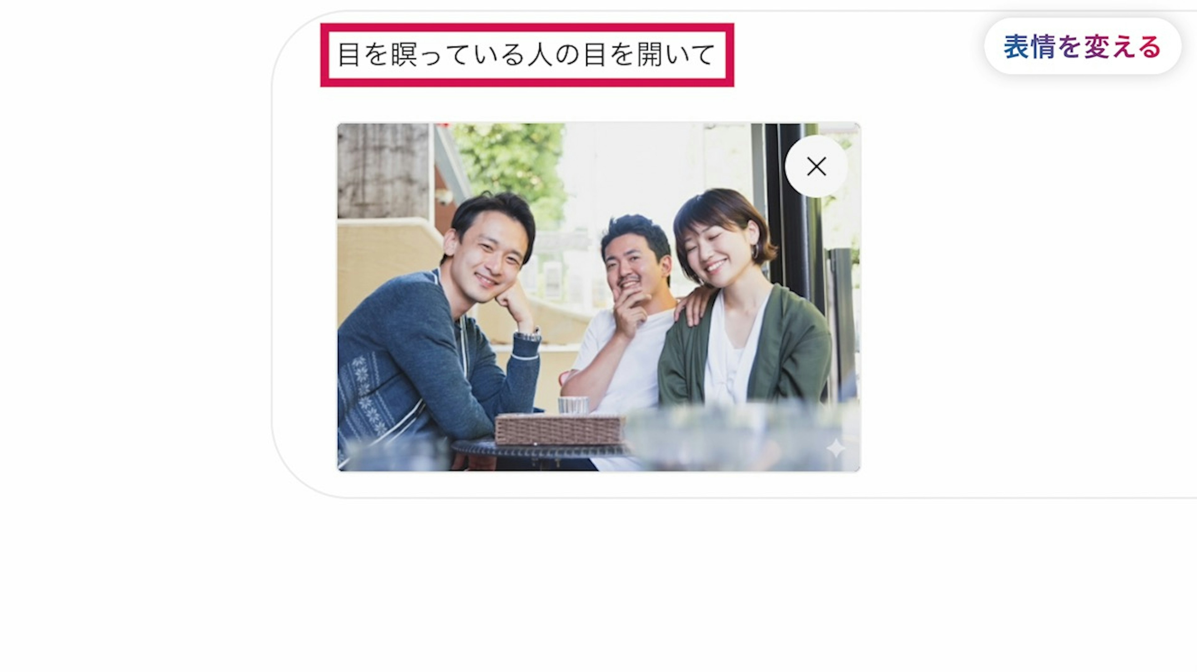 Nano Bananaなら、例えば『目を瞑っている人の目を開いて』とチャットで指示するだけで、このように目をつぶってしまっていた顔を、目を開いた顔の写真に変えることができます。