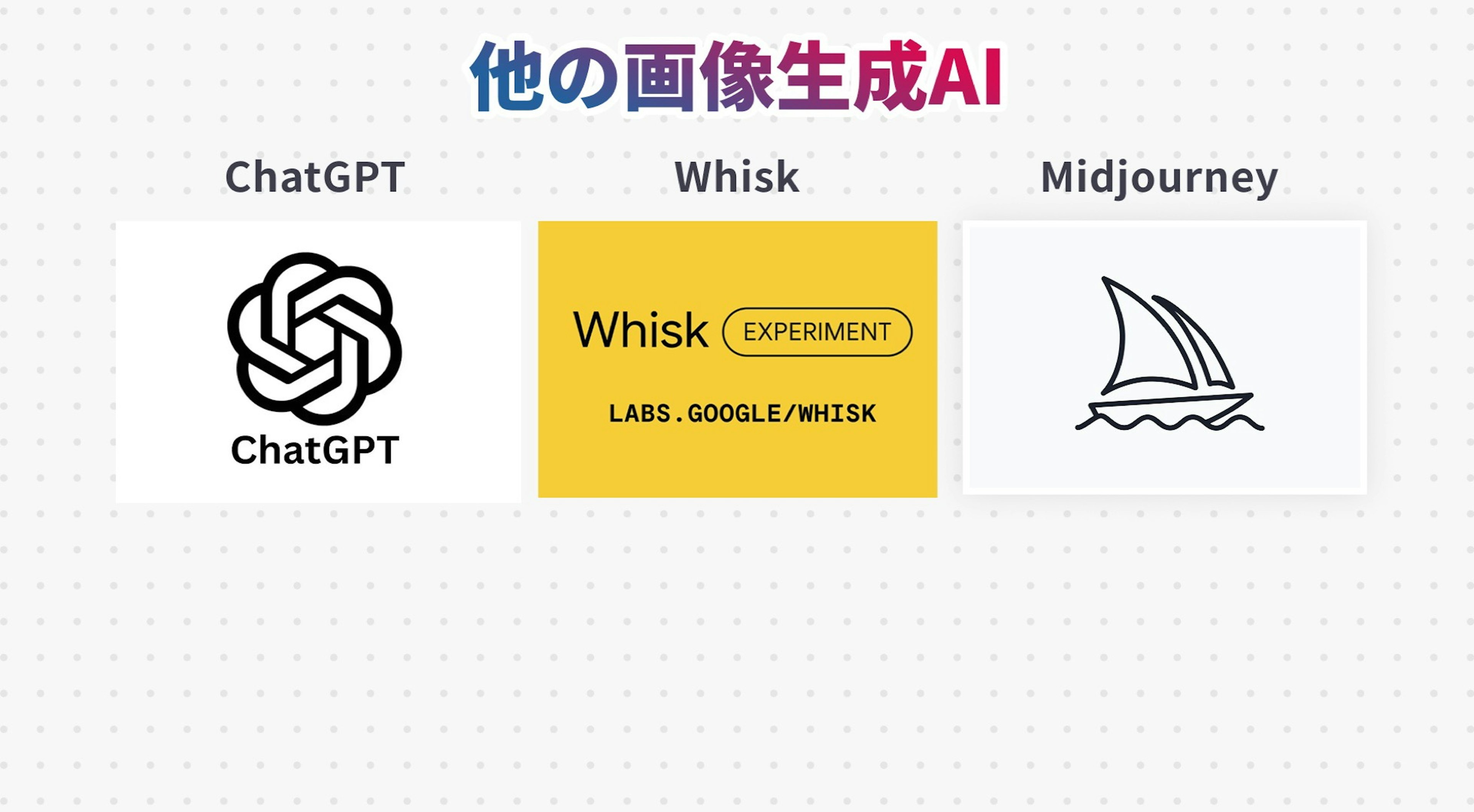 Nano Bananaのすごさを理解してもらうために、他の有名な画像生成AI『ChatGPT』『Whisk』『Midjourney』で同じ指示を出した場合と比較してみましょう。
