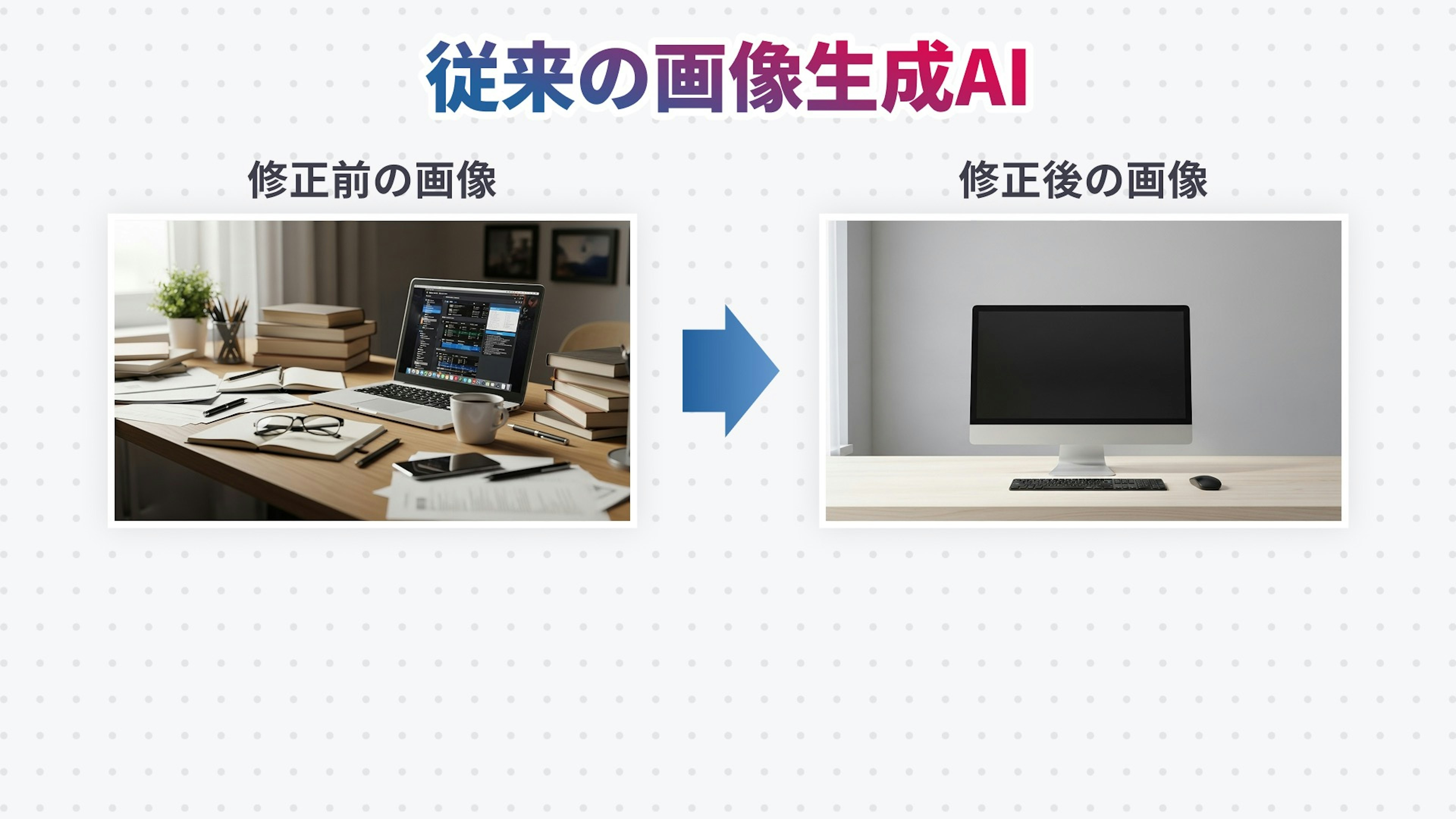 これまでの画像生成AIでは、画像に修正を加えようとすると、パソコン以外を消そうとしたこの画像のように、元の画像から大きく変わってしまったり、
