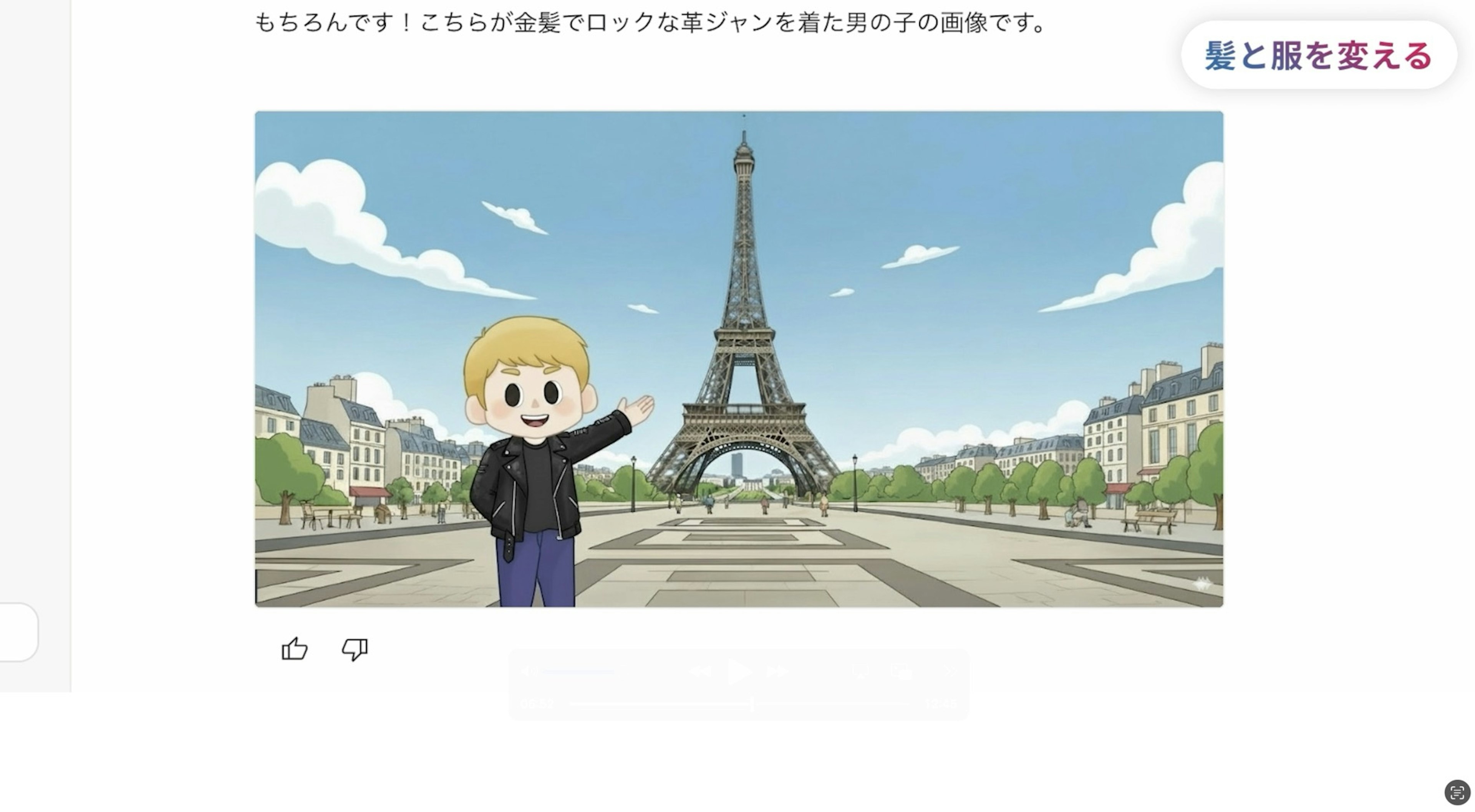えーと、『この写真の髪を金髪にして、服をロックな革ジャンに変えて』っと…。